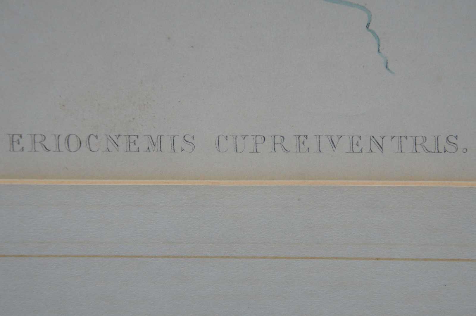 Mid 19th century J. Gould & H.C. Richter Lithographs. Hand colored in gold frames, circa 1850s. Features the Diphogena Iris and the Eriocnemis Cupreiventris (Coppery-vented Puff-Leg). From "A Monograph of the Trochilidae". Framed and matted.