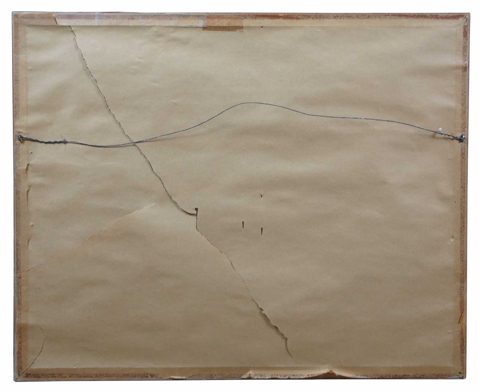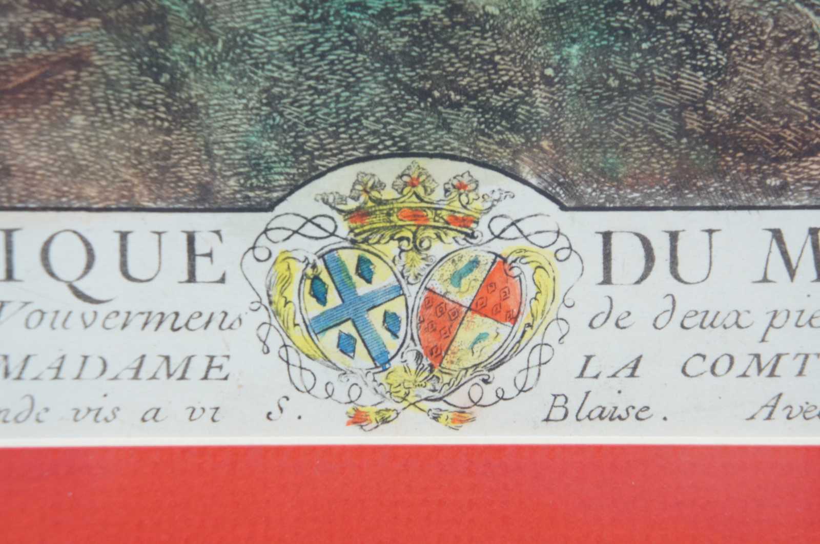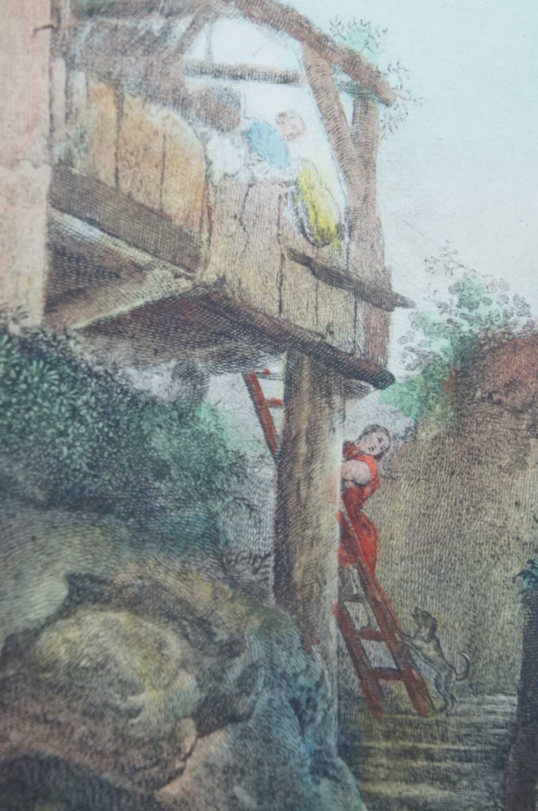 20th century lithograph print, after Philips Wouwerman (Dutch, 1619-1688) by Jean Moyreau , features a rural landscape scene depicting horsemen or riders stopping at a Blacksmith "aka Marshalls Shop" in the mountains, a farrier shoeing a horse in the foreground with a castle in the distance.