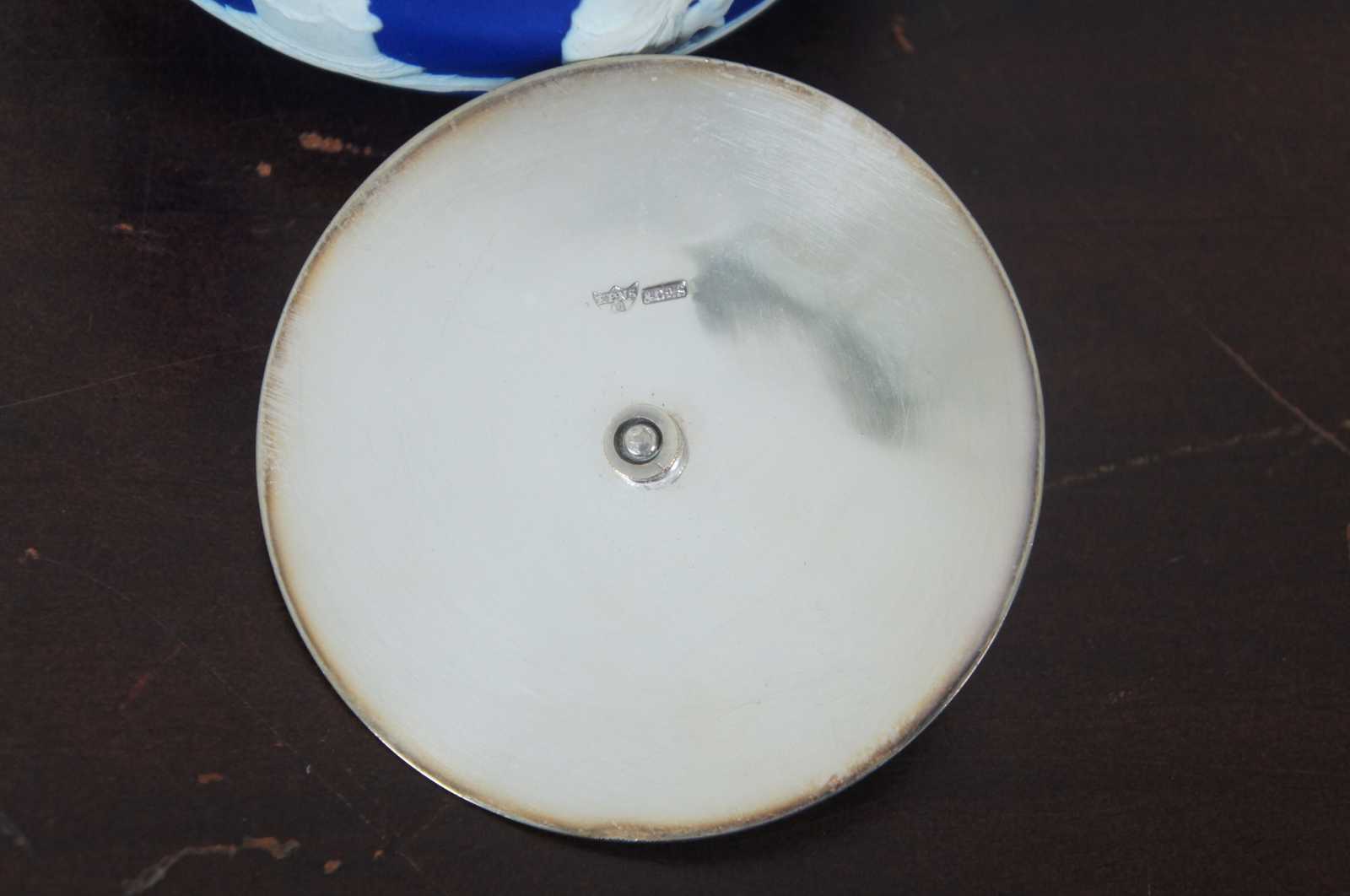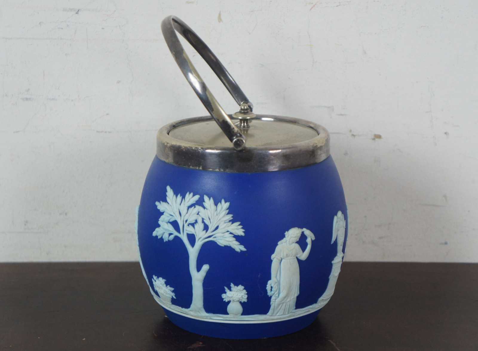 Wedgwood blue and white jasperware ceramic cookie jar with silver plate lid and handle. Features low relief in Grecian styling.