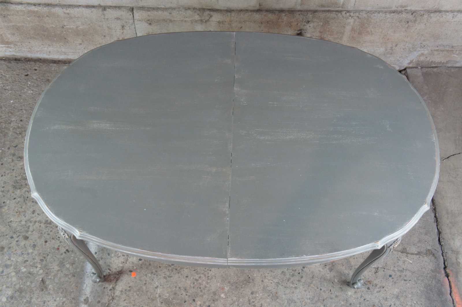 Circa 1960s French Provincial dining table, finished in gray with white and natural wood undertones.