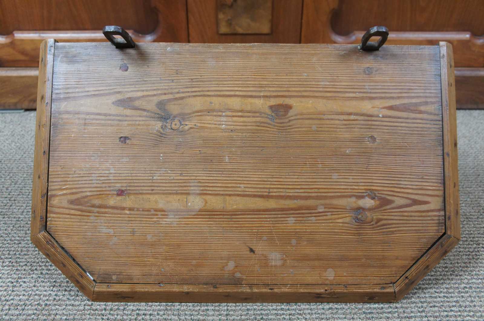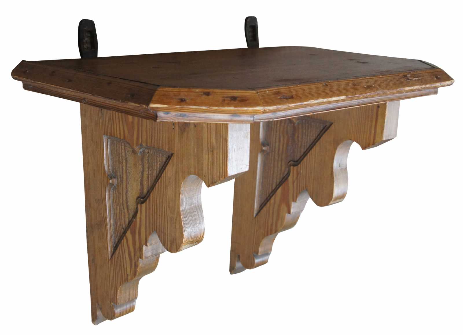 Early 20th century antique european pine wall shelf. Features engraved side panels, serpentine supports and heavy iron bracket for mounting.