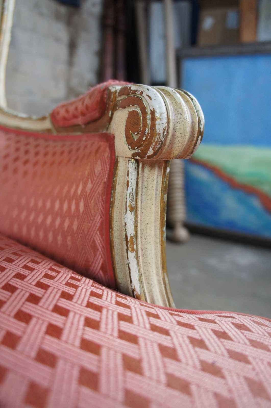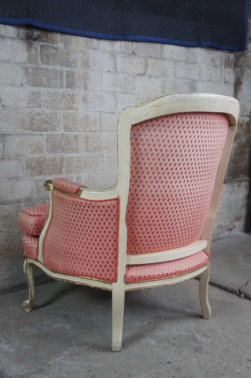 Circa 1930s French Provincial arm chair. Off-white with gold trim and red/pink upsholstery with interwoven design.