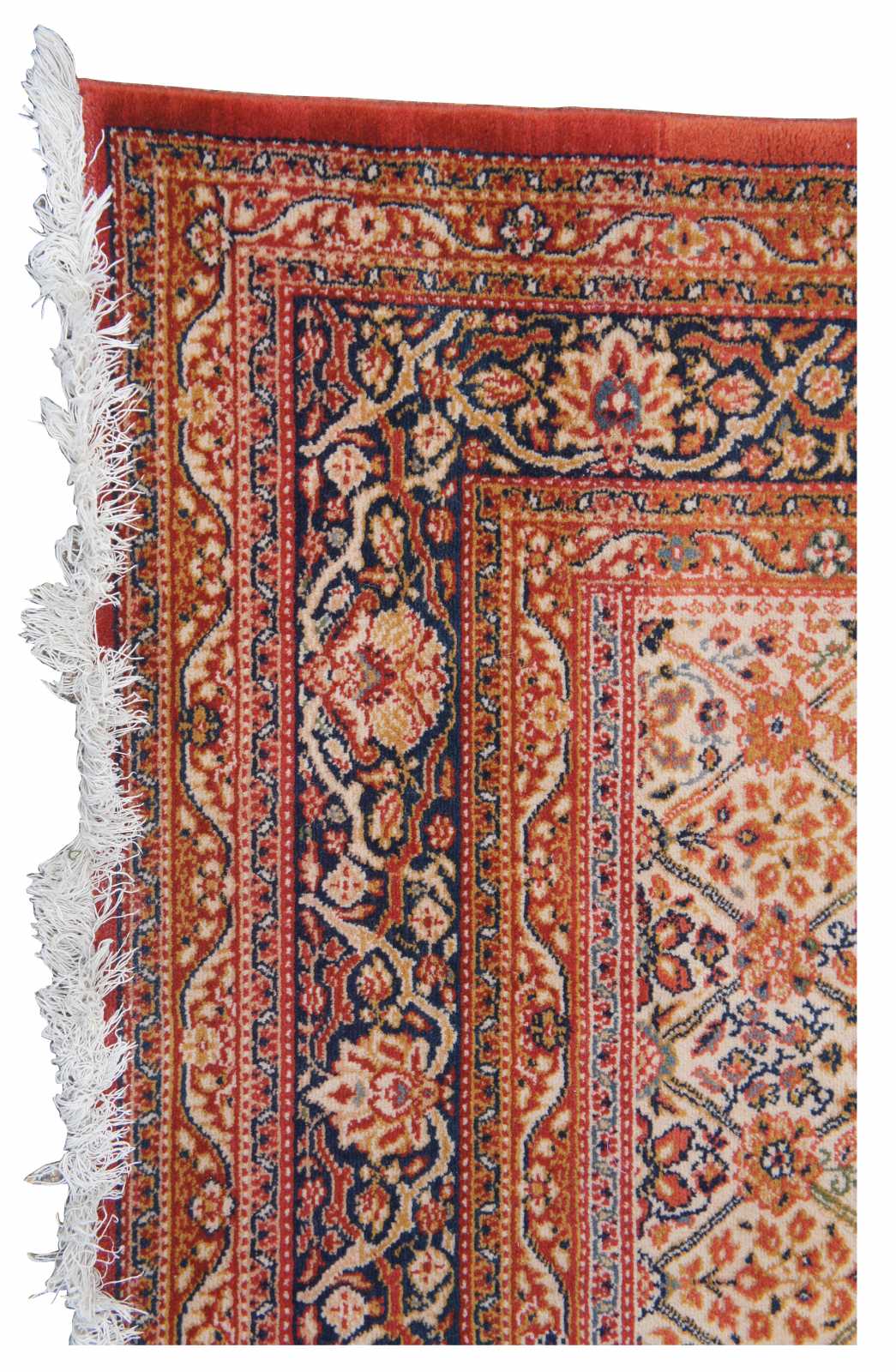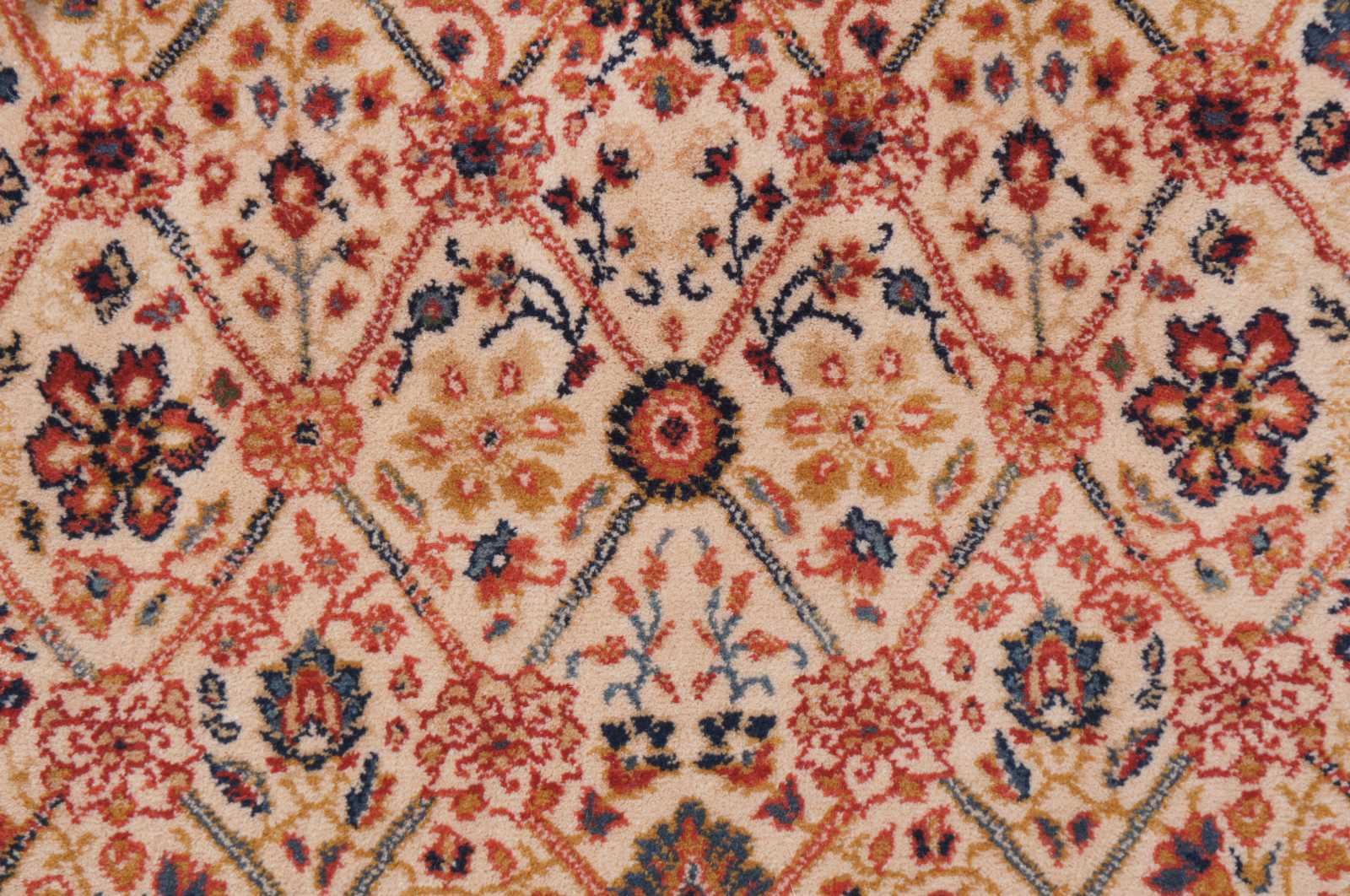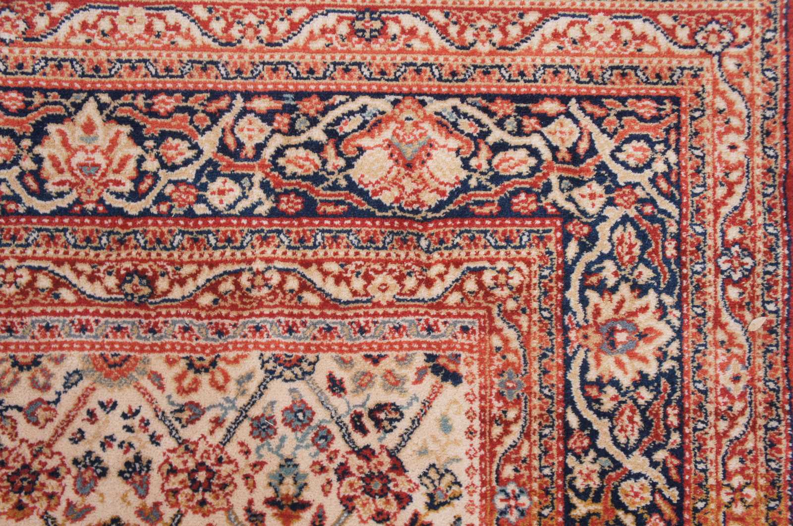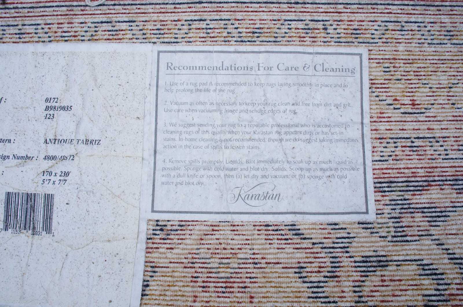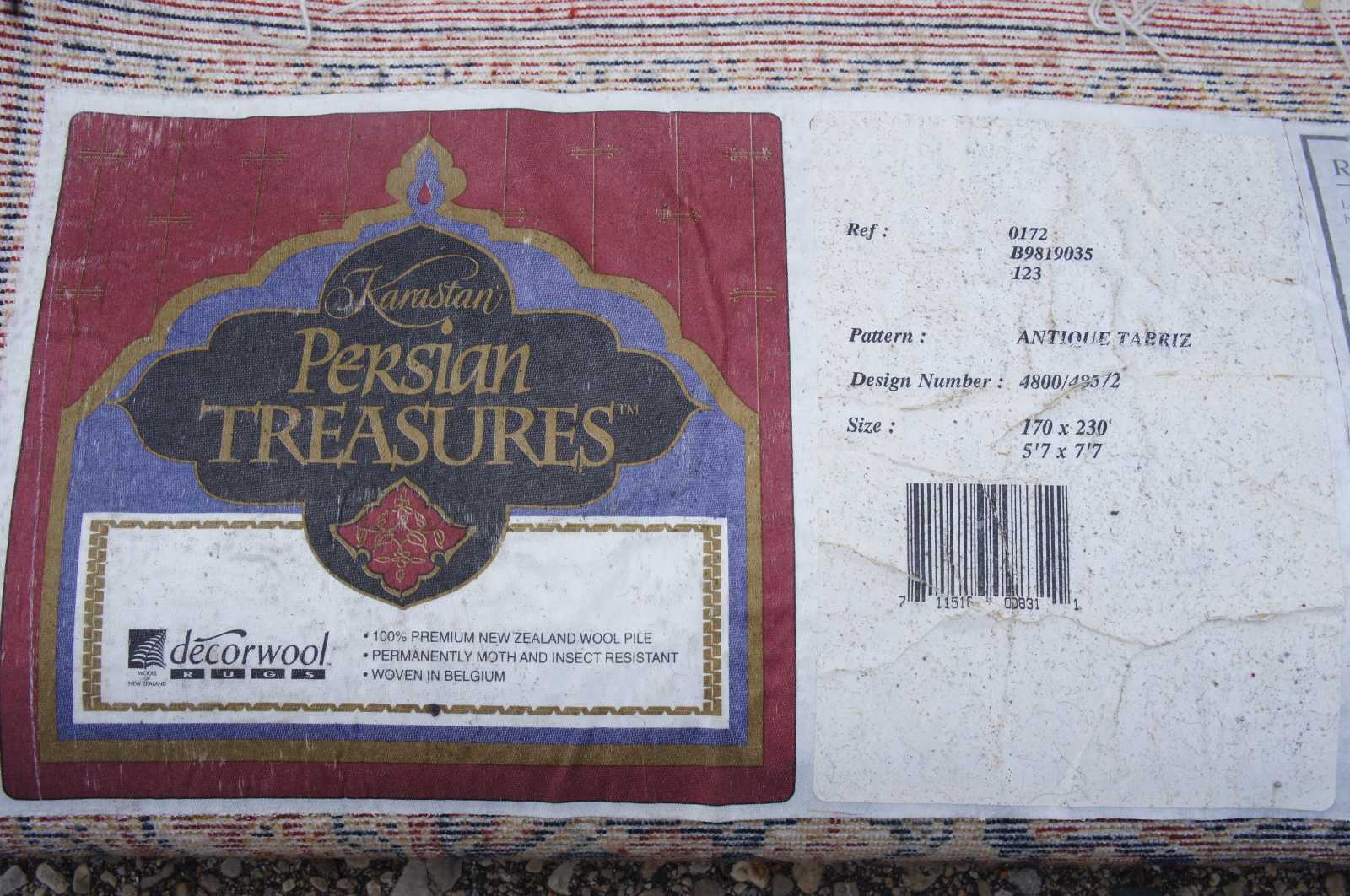 A contemporary Karastan Antique Tabriz area rug, from their “Persian Treasures” collection. It is machine-woven, with a 100% wool pile, made in Belgium. It features a stylized floral pattern in shades or red, navy, and beige, with a white fringe to two sides and serged selvedges.