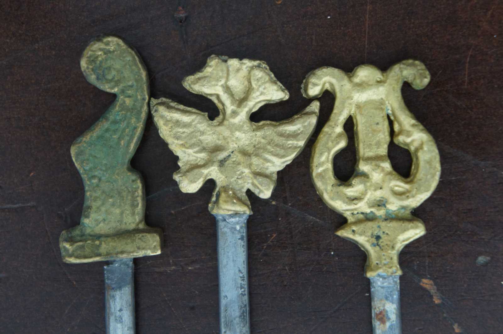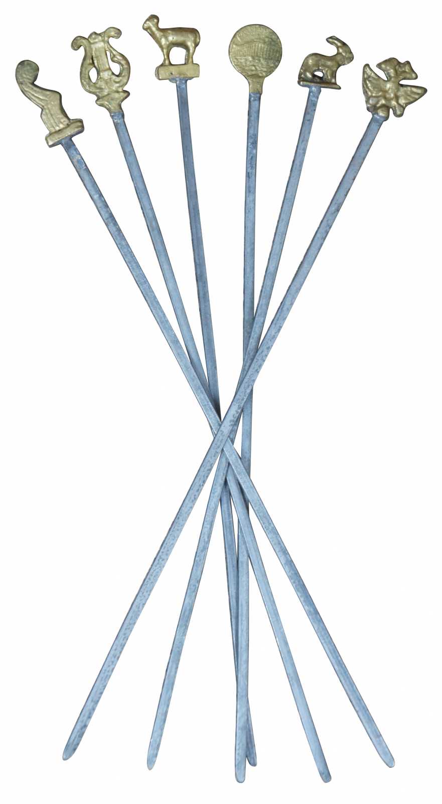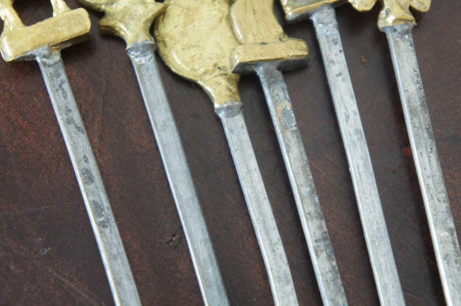 Set of 6 vintage steel shish kabob skewers with assorted brass charm tops.