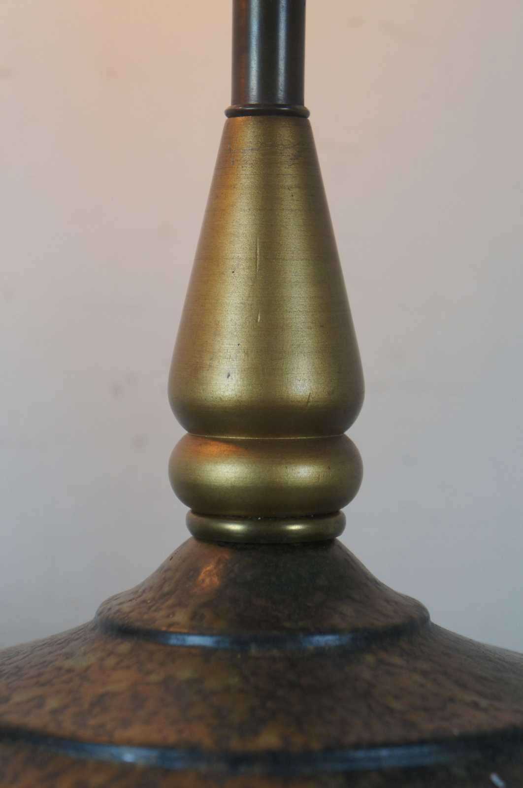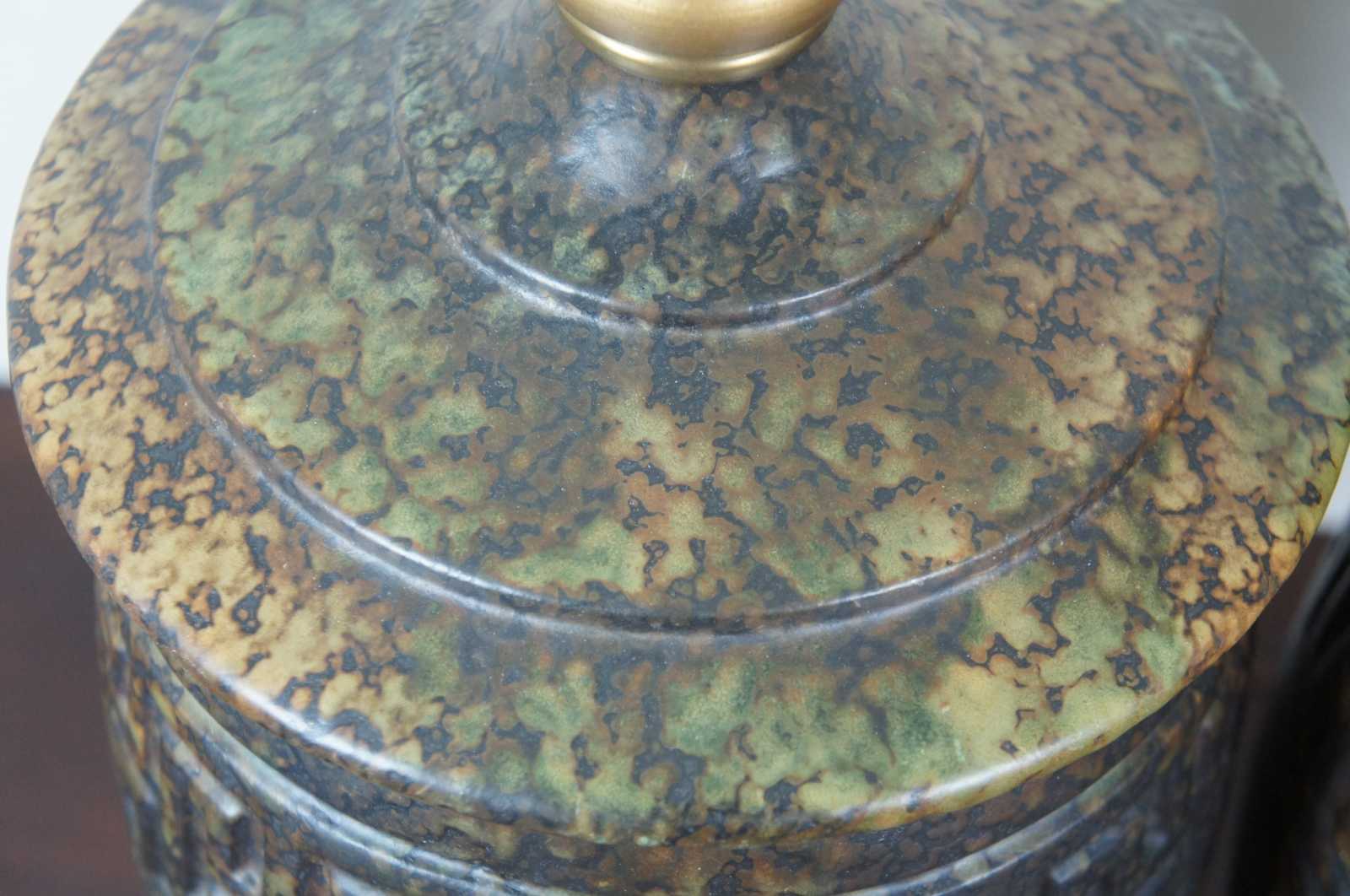 Two contemporary ceramic table lamps with a Greek key design, painted to look like bronze mottled with moss.