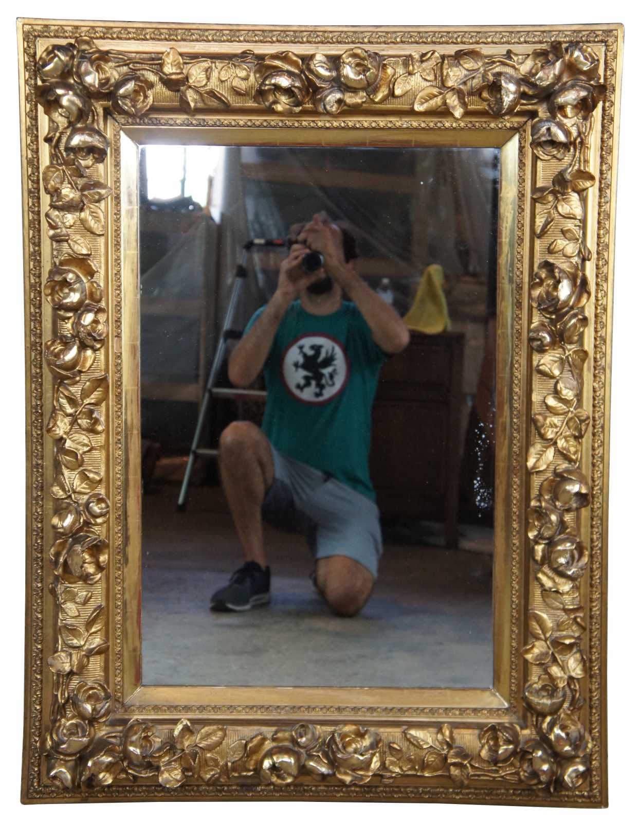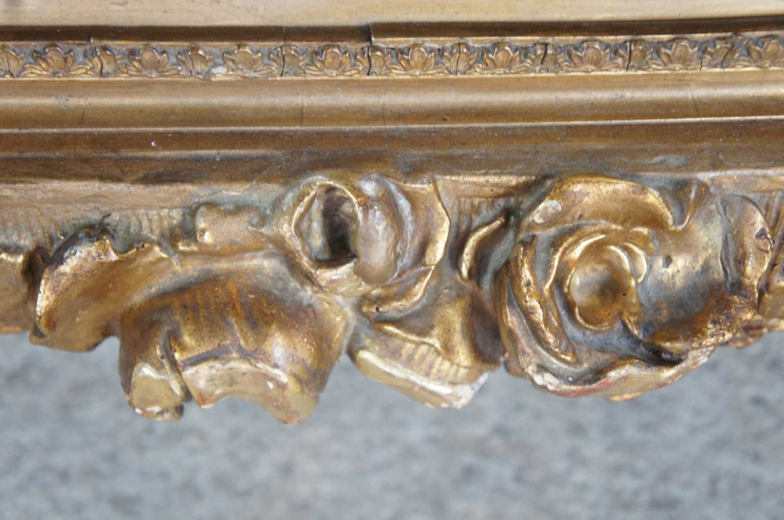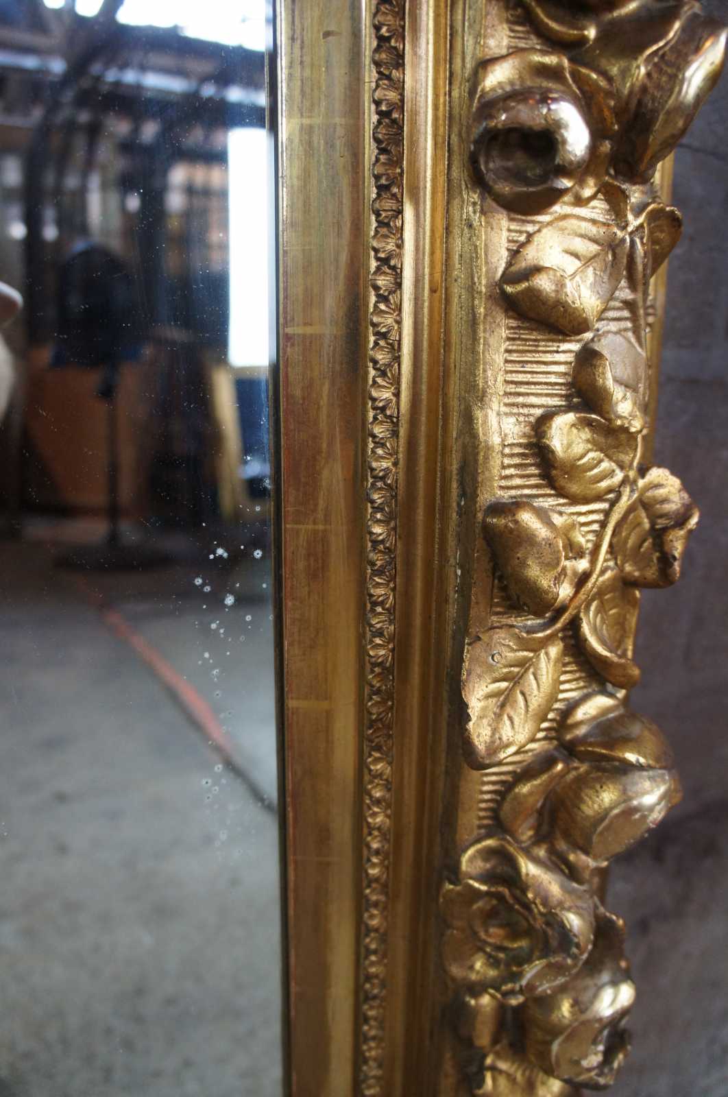 19th century high relief gold mirror. Made from pine with an elaborate rose vine design along the frame. Features gadrooning along the trim and a mirror that could be replaced with artwork if desired.