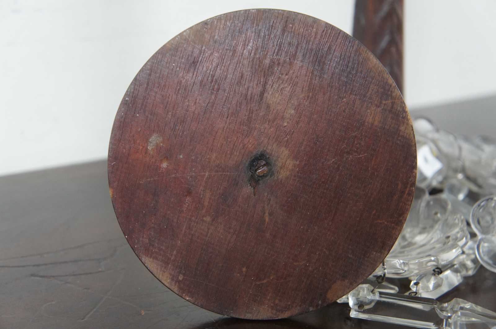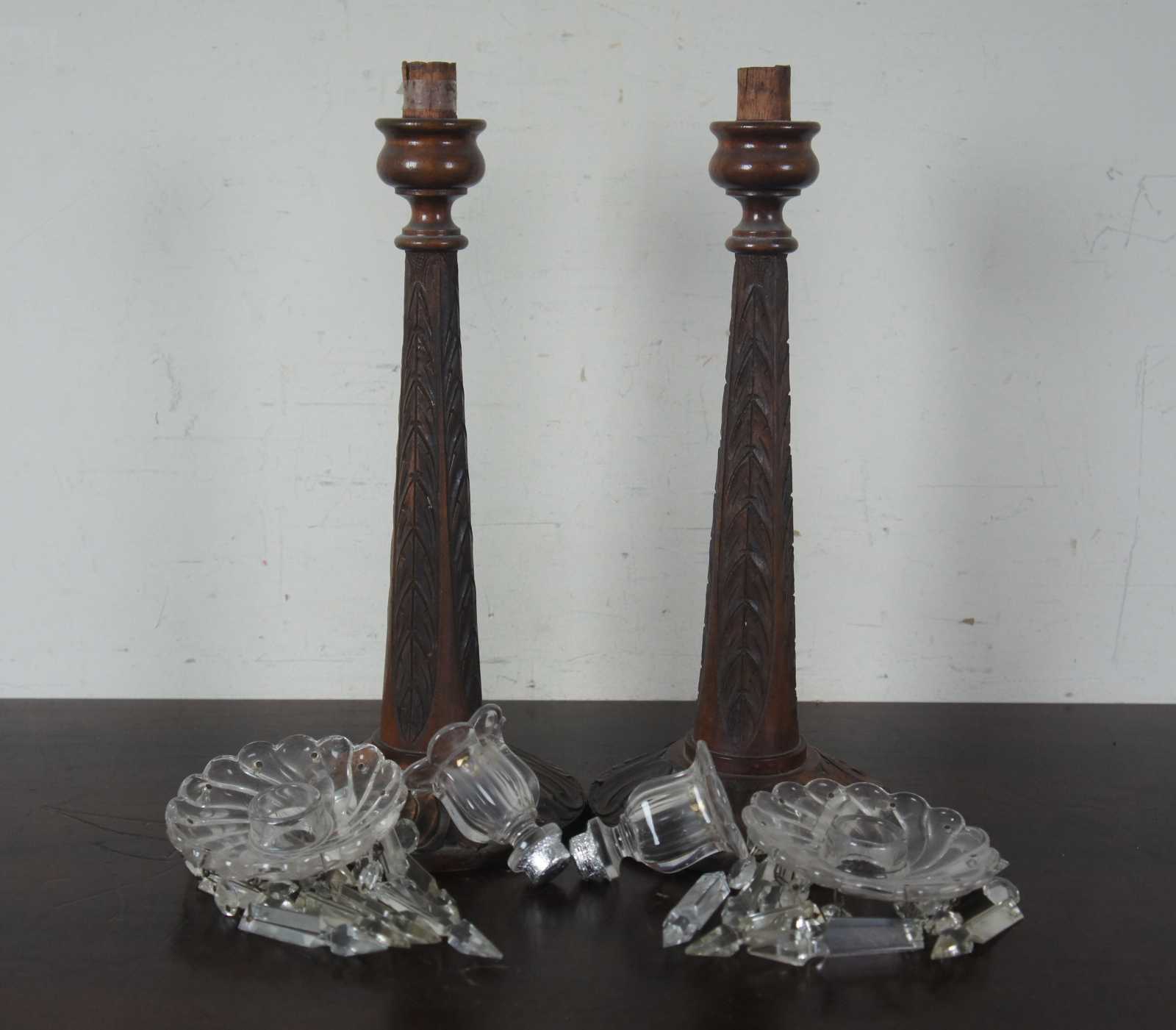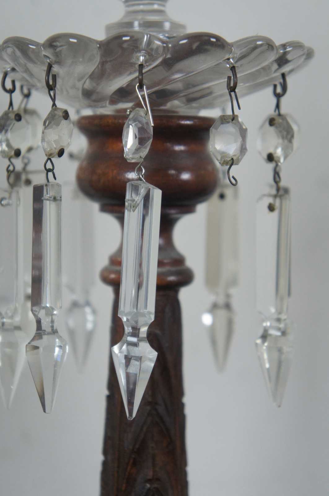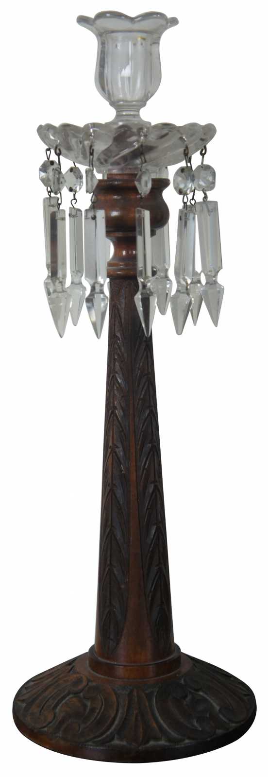 Antique wood candlesticks. Made of teak with hand carved details and spear cut drop crystals and tulip shaped candle holders.