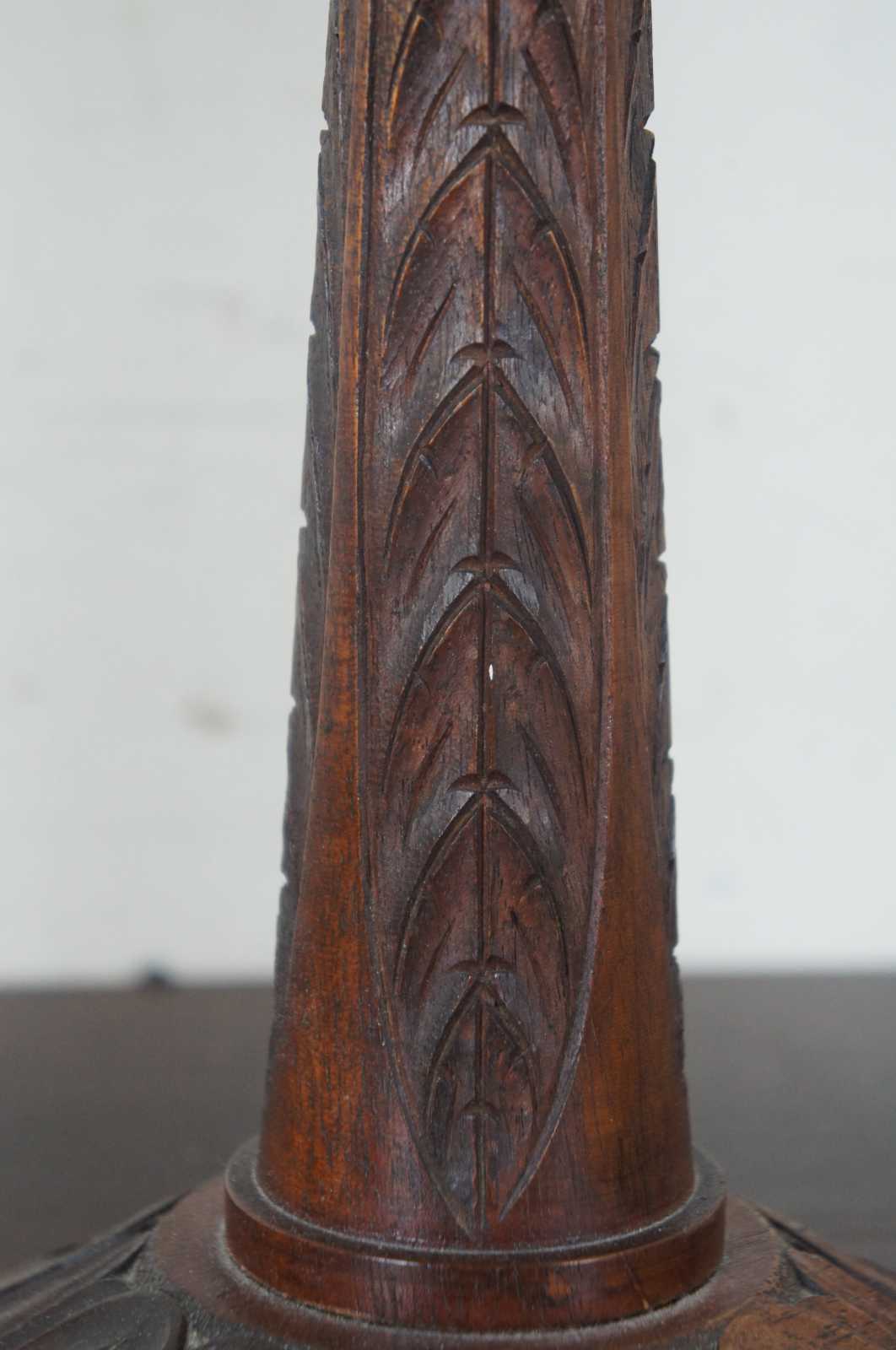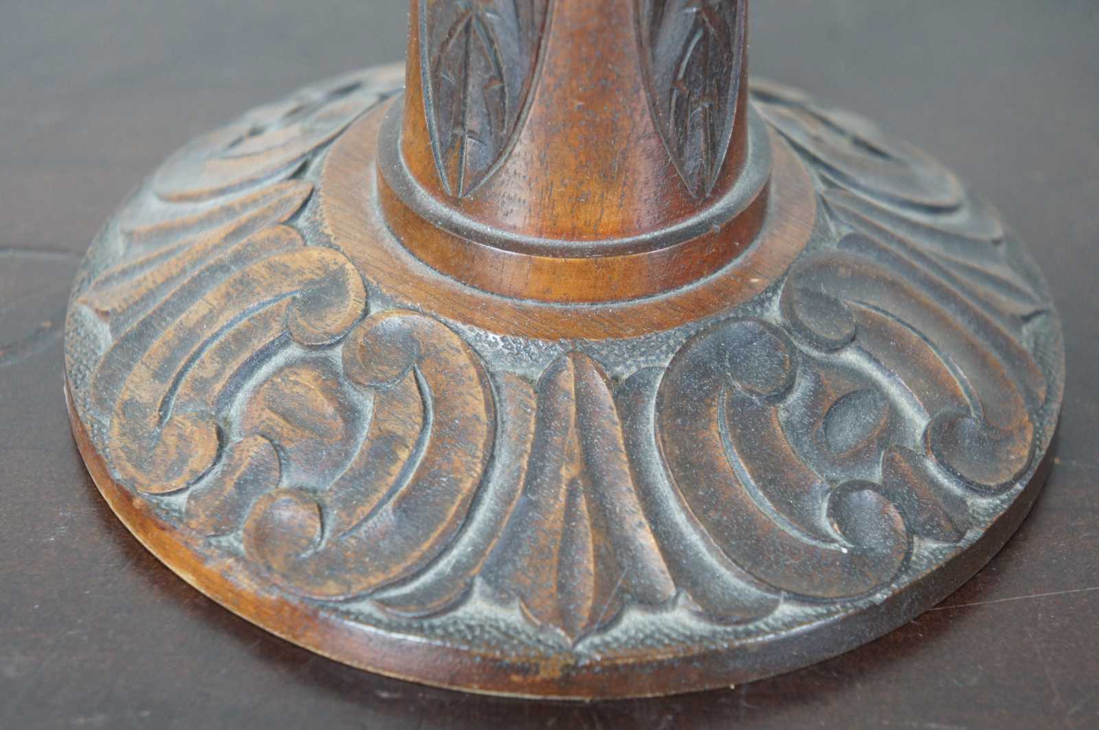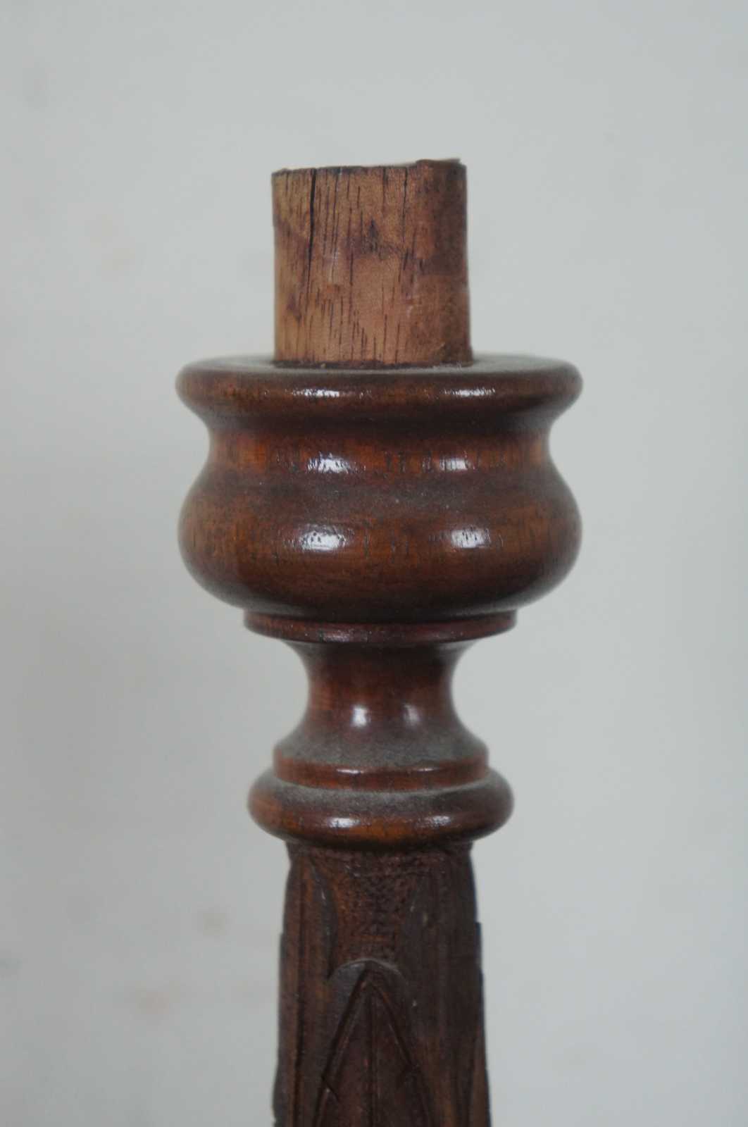 Antique wood candlesticks. Made of teak with hand carved details and spear cut drop crystals and tulip shaped candle holders.