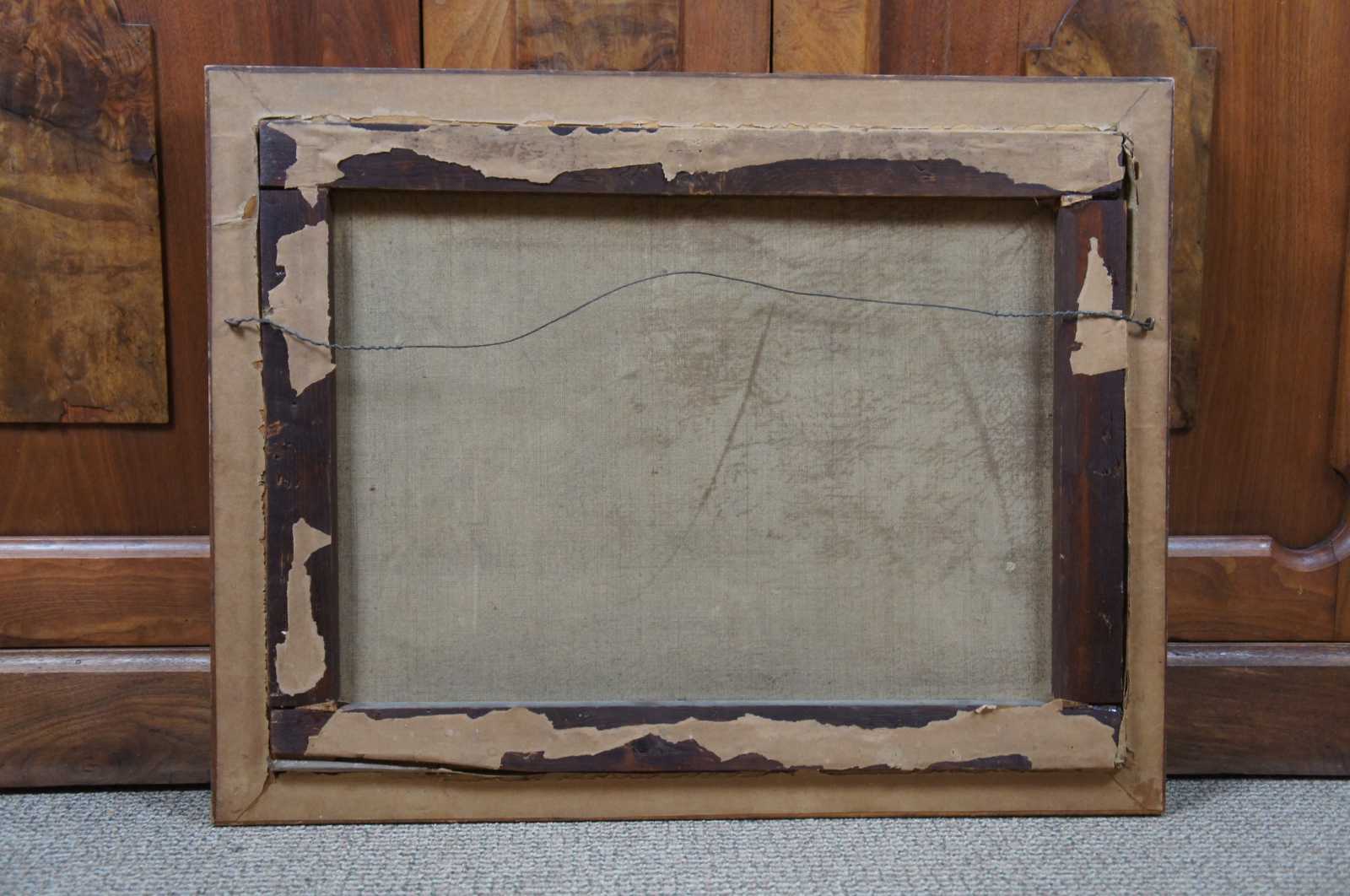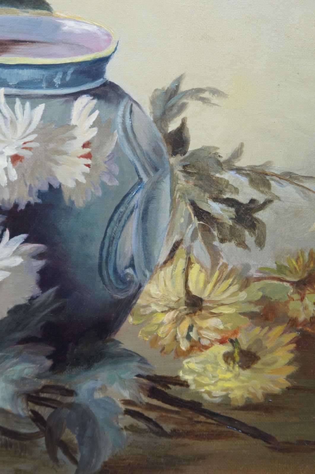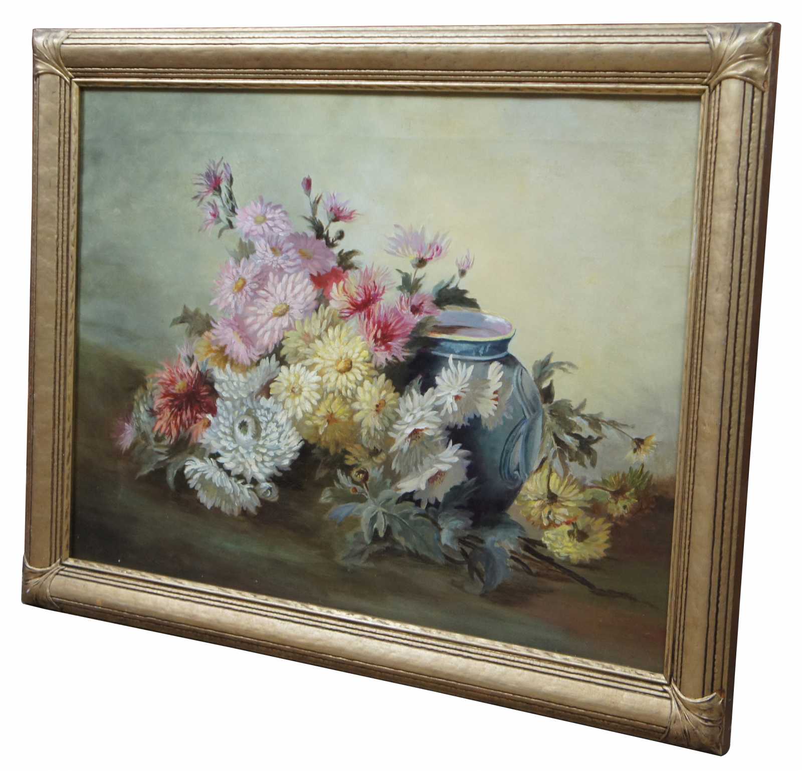 Late 19th / Early 20th century still life painting. Feautres a colorful array of peonies next to a blue porcelain vase. Includes an art deco era wooden frame finished in gold.
