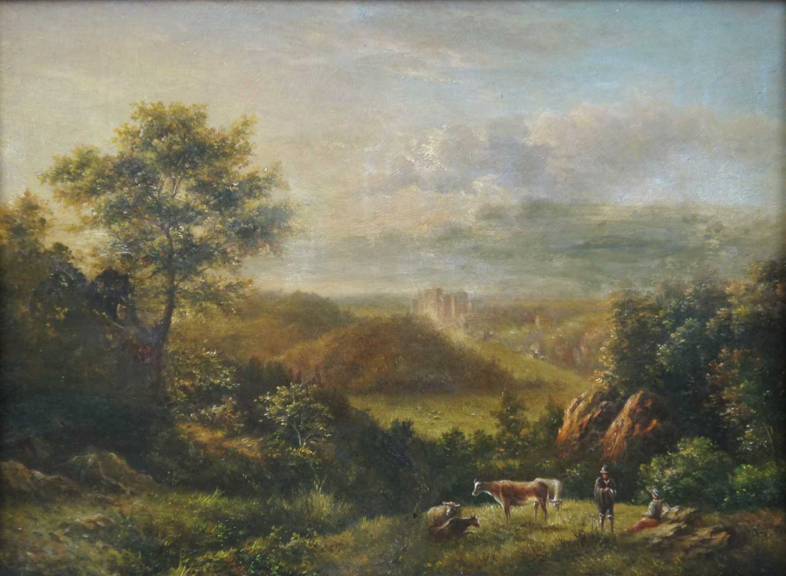 A lovely antique European oil on board. Features two figures and cattle in a rural landscape with a castle or cheateau in the background.