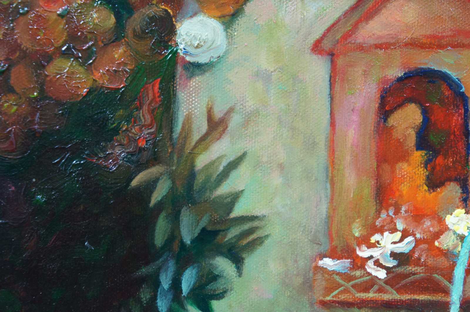 20th Century oil on canvas. Features a seated woman with fan at her booth in the farmers market. Ornately frame.