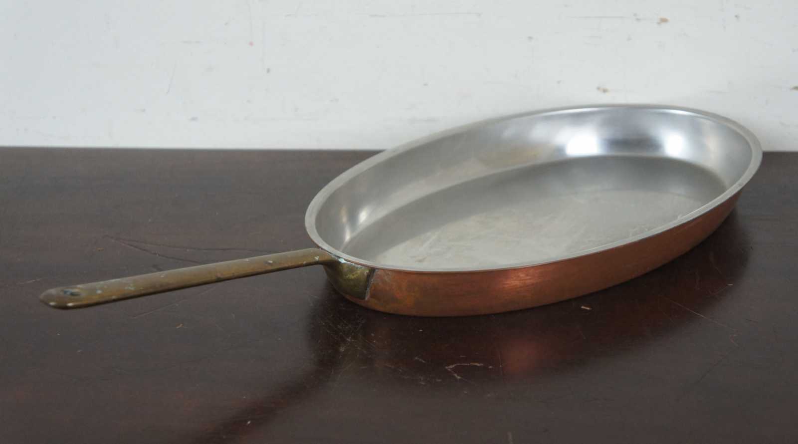 Copper fish frying pan from Switzerland. Features stainless and copper in oval shape. Marked on base, Spring Culinox with stag mark, circa 1980s.
