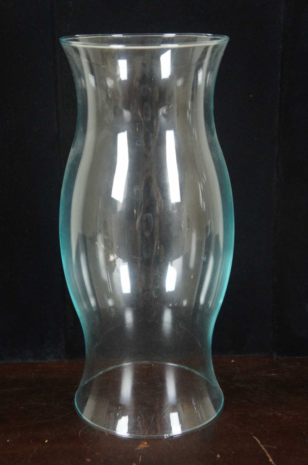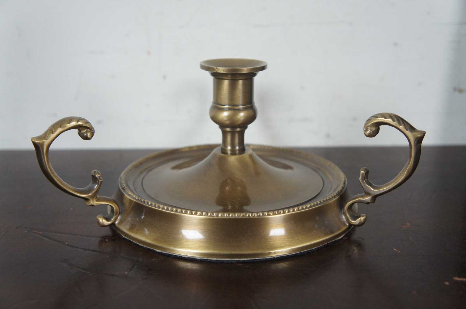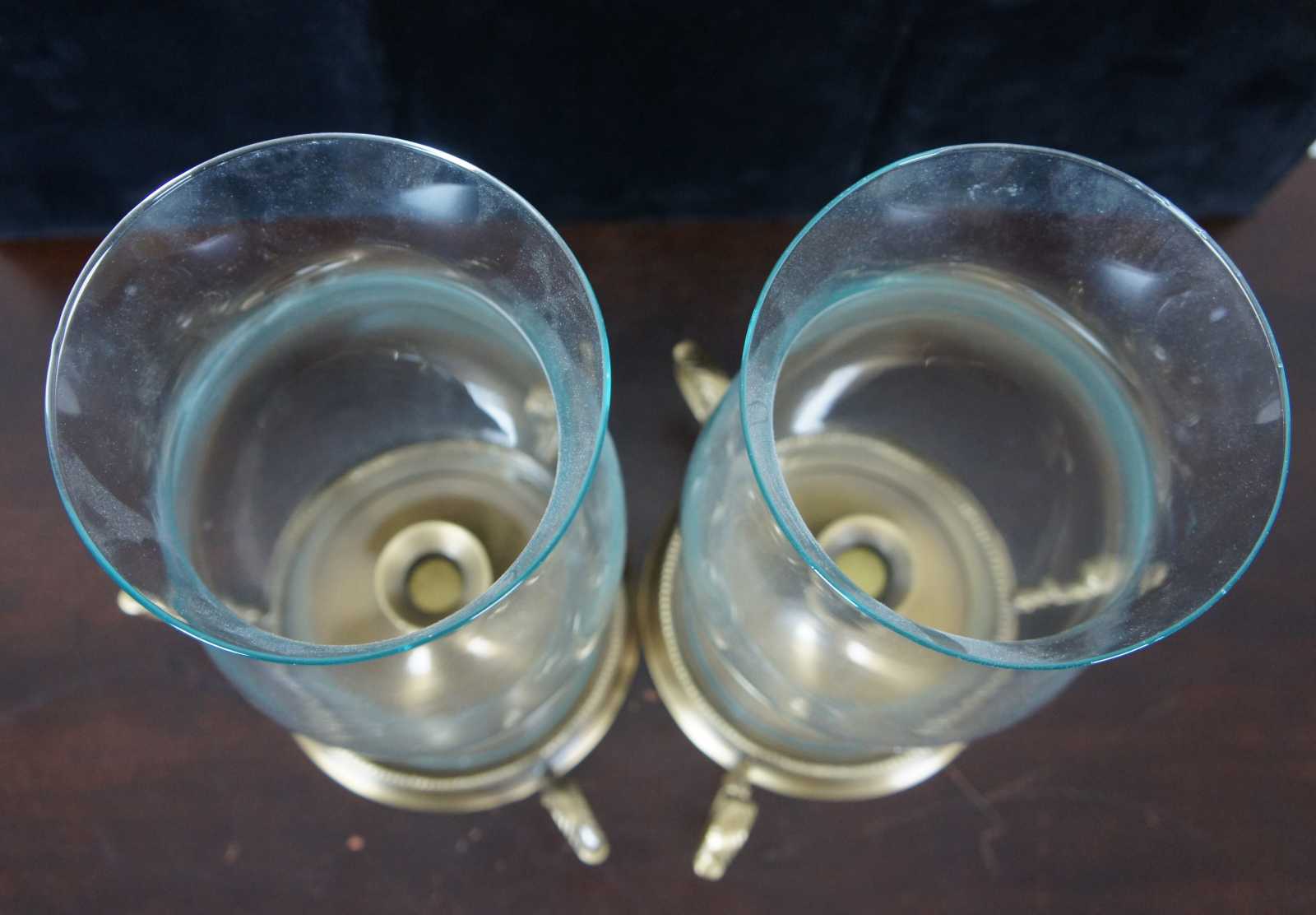 Two brass tapered gone with the wind style candle holders with handles and glass hurricanes by Oriental Accent.