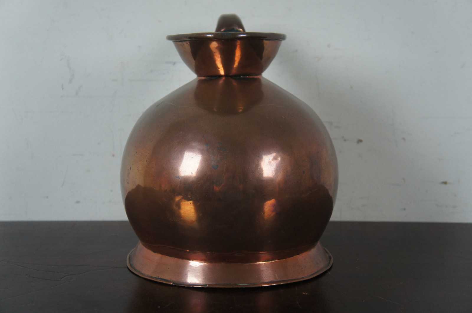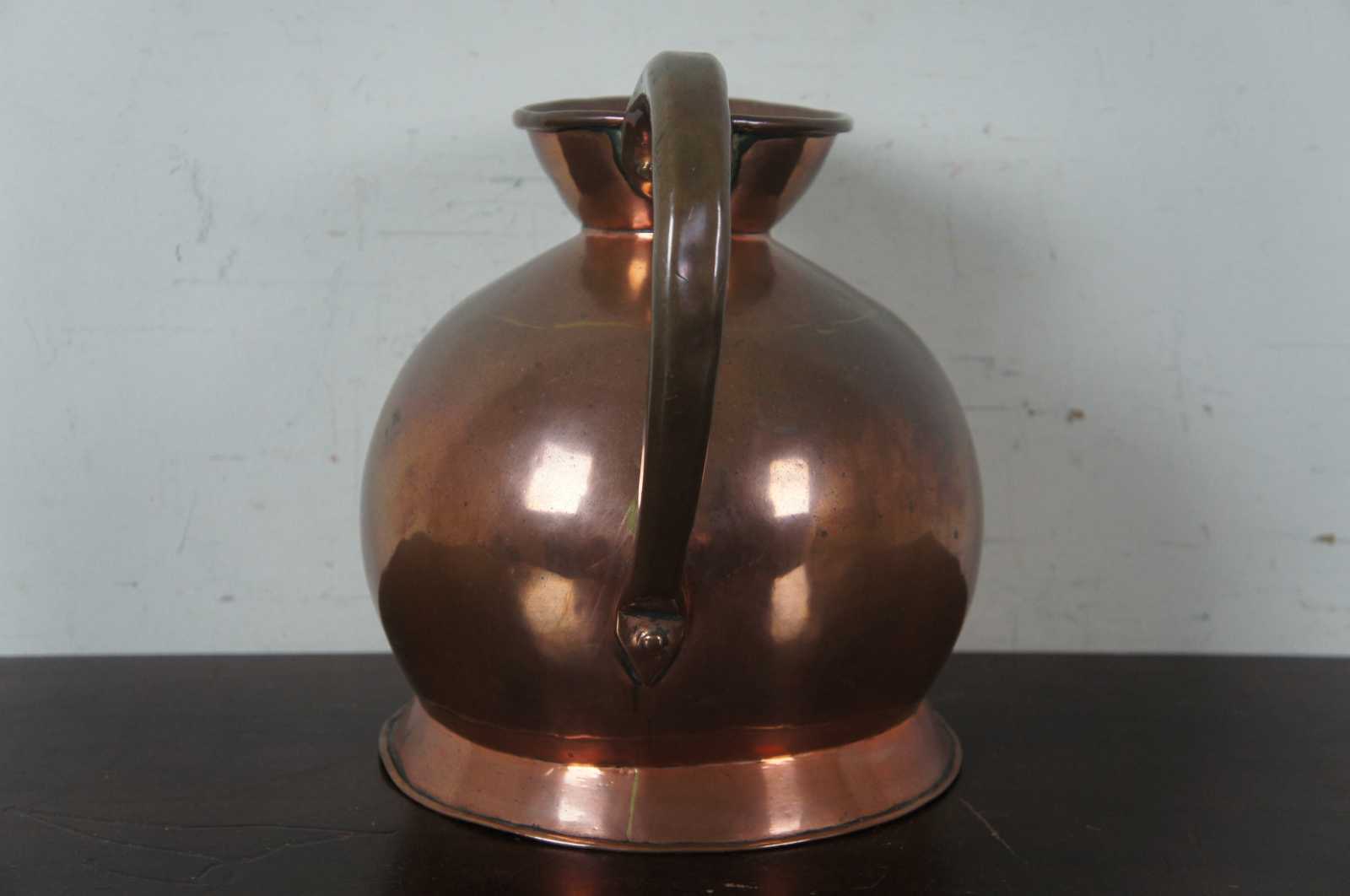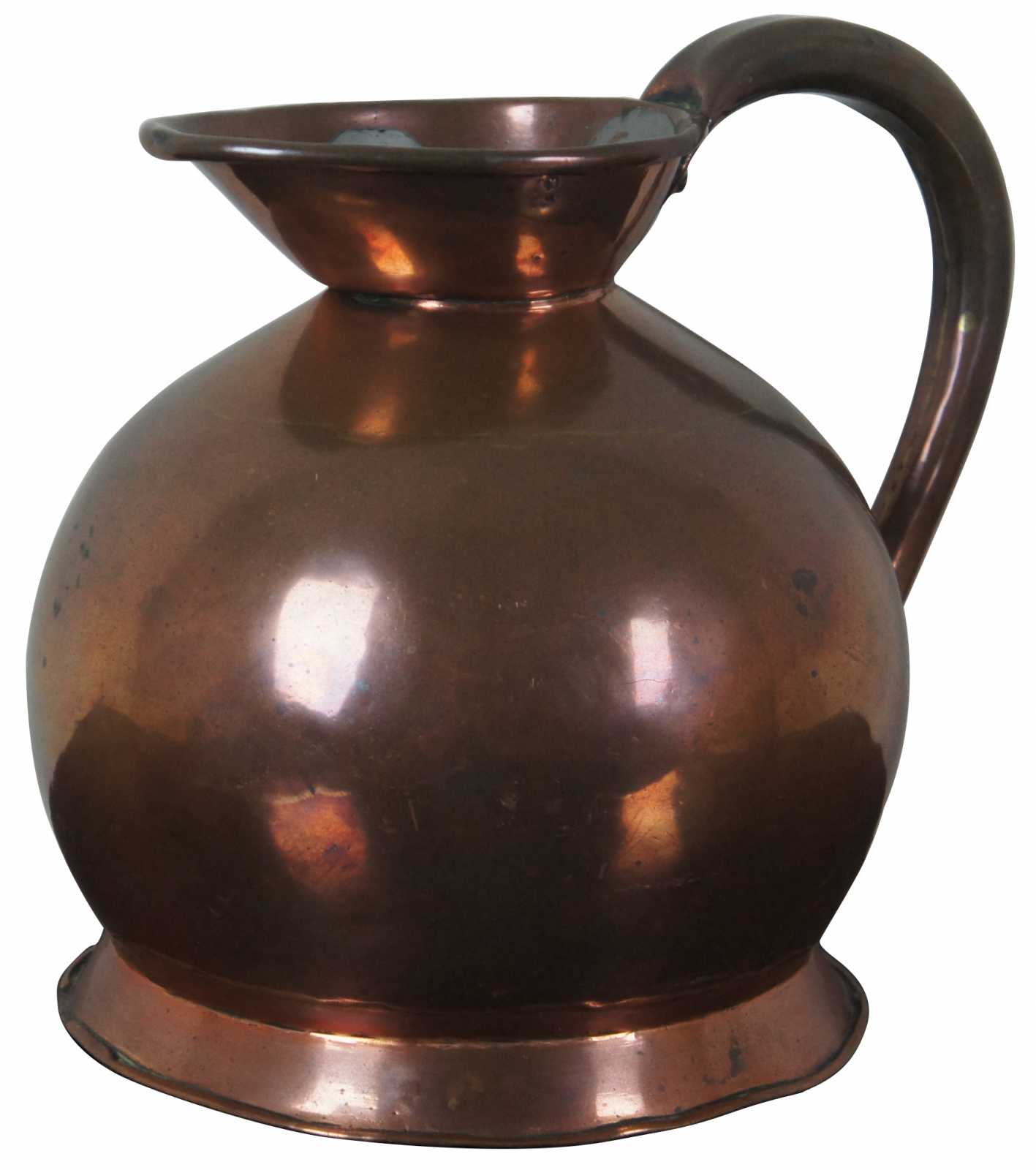 Antique English one gallon haystack dovetailed copper pitcher. Featurs a round design with pronounced handle and footed base.