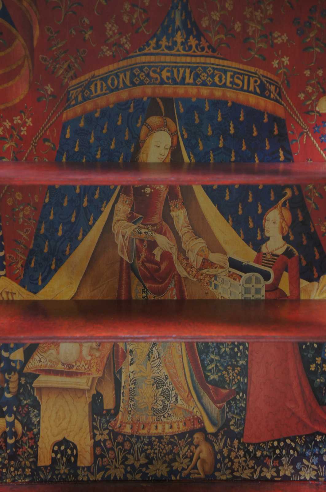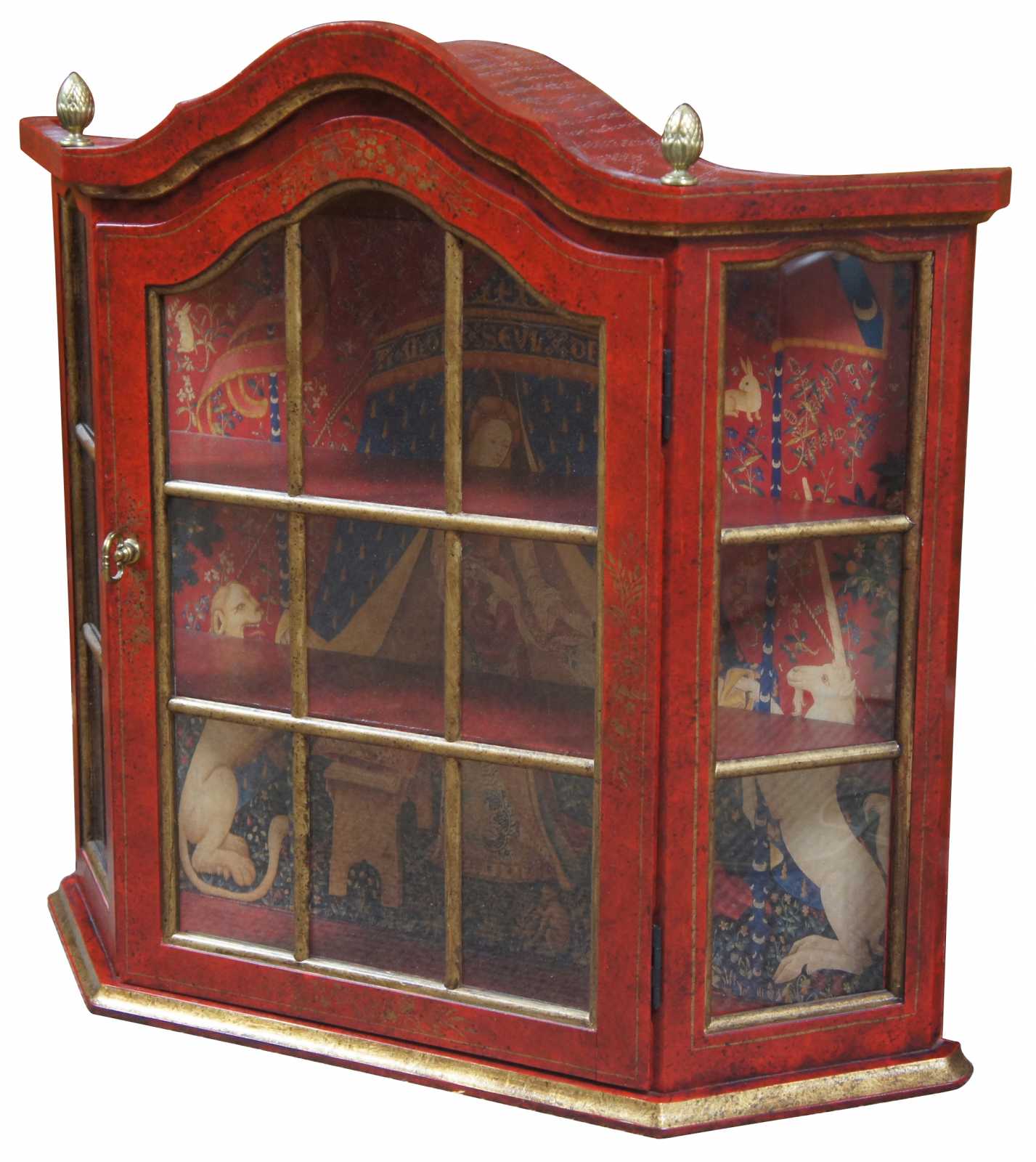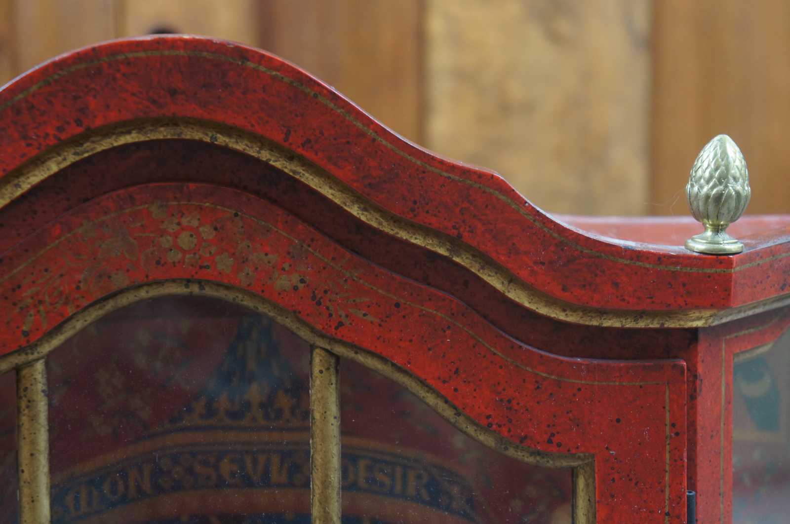 Vintage circa 1970s. wall curio cabinet or display case. Features traditional styling with red and gold distressed paint, glass paneled door and acorn finials. Interior is lined with a Heraldic or Victorian scene.