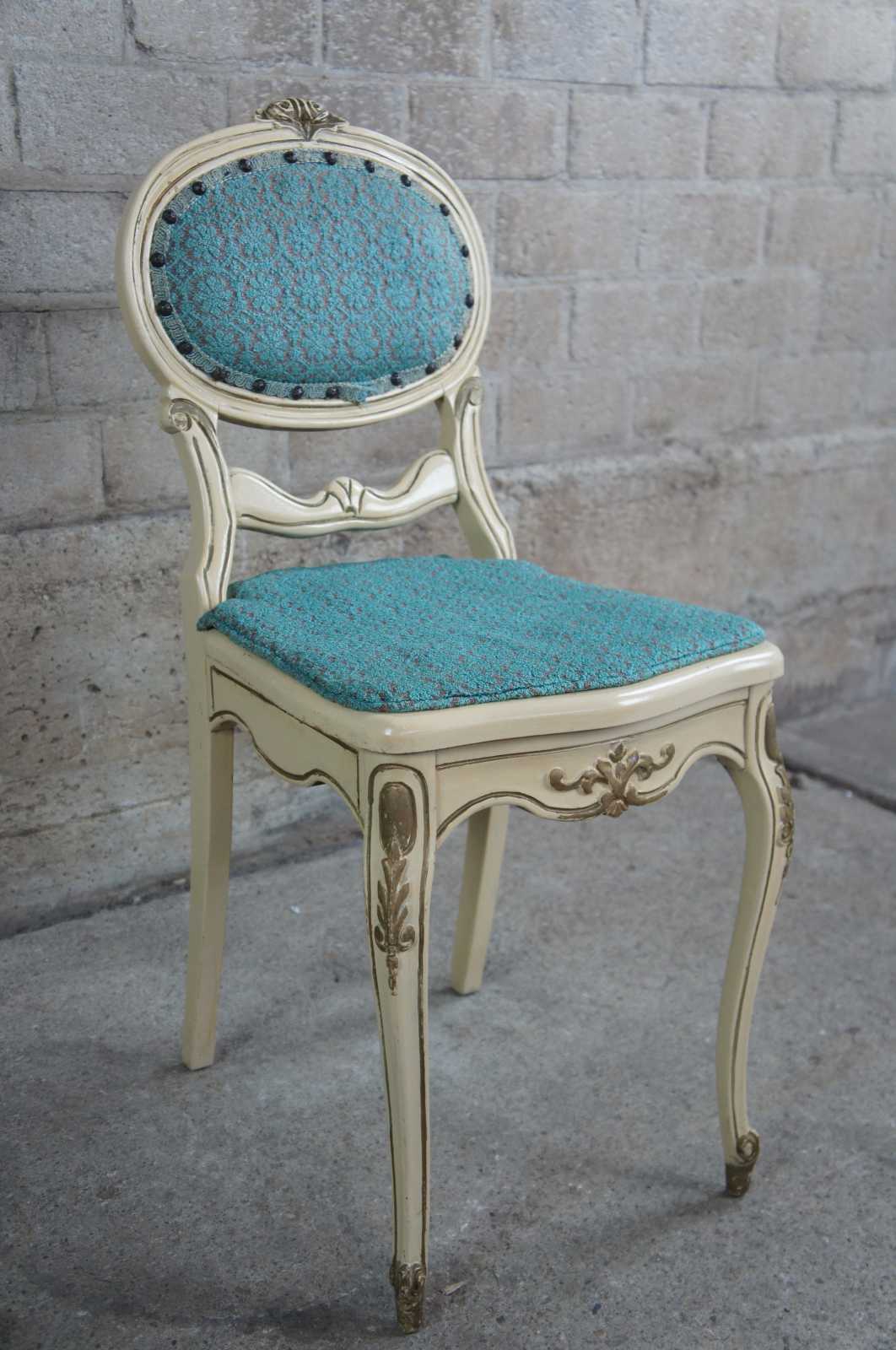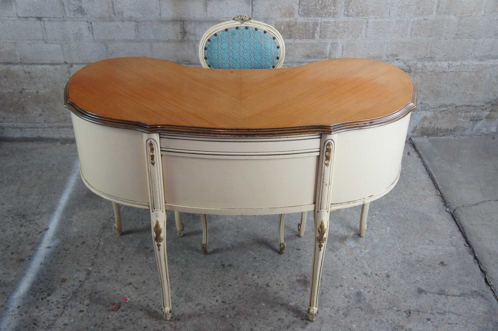 Early 20th century French Provincial writing desk and chiar. Finished in white and gold with a natural walnut top. Features Louis XV carvings, long cabriole legs and ornate details throughout.