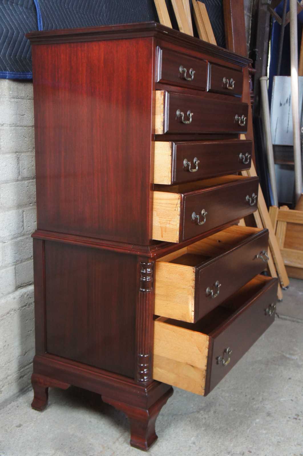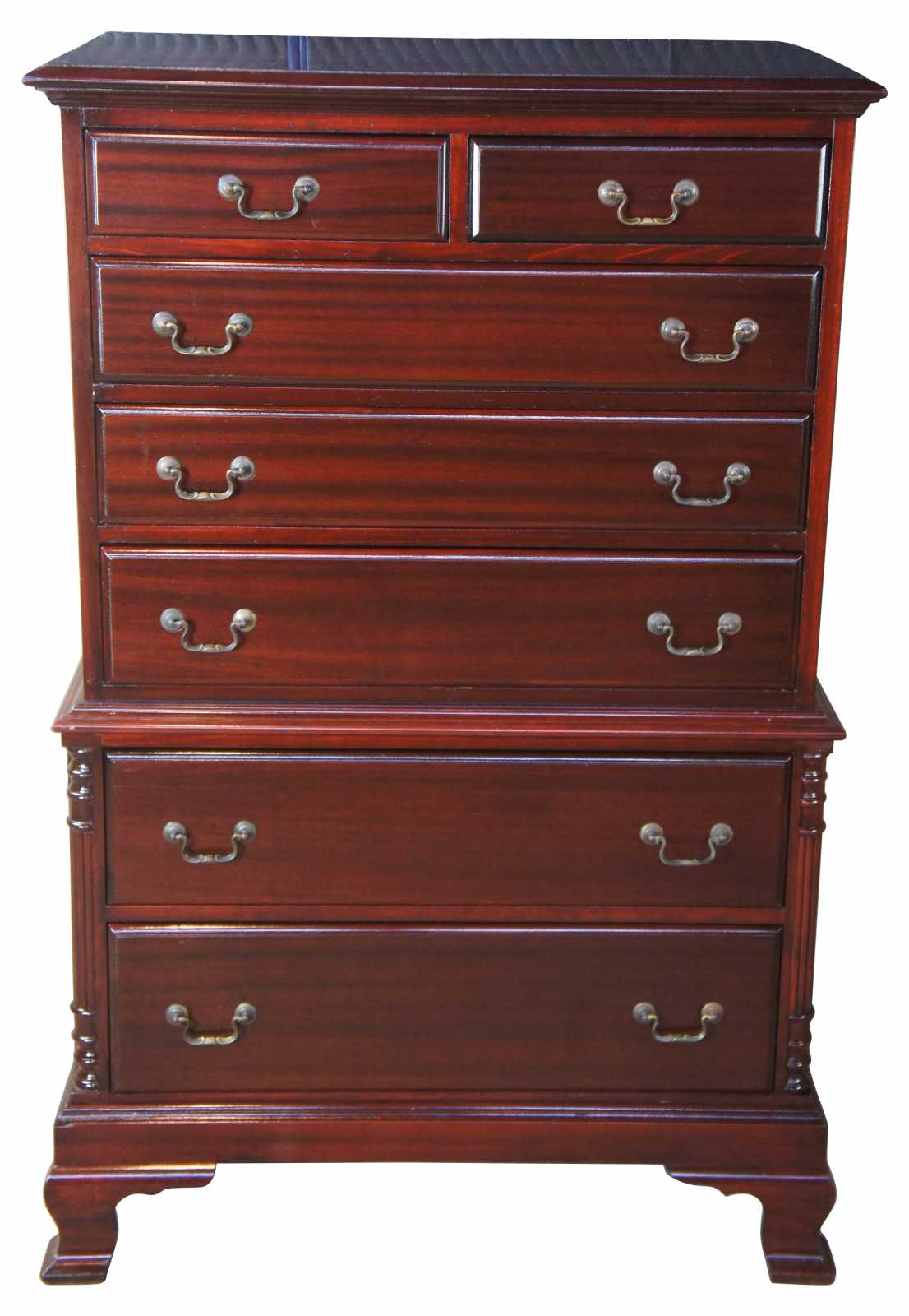 Circa 1970s mahogany highboy / chest on chest dresser. Features seven drawers , half turned and carved ballisters at corners, bracket feet and brass hardware. Sold by Rikes Furniture.