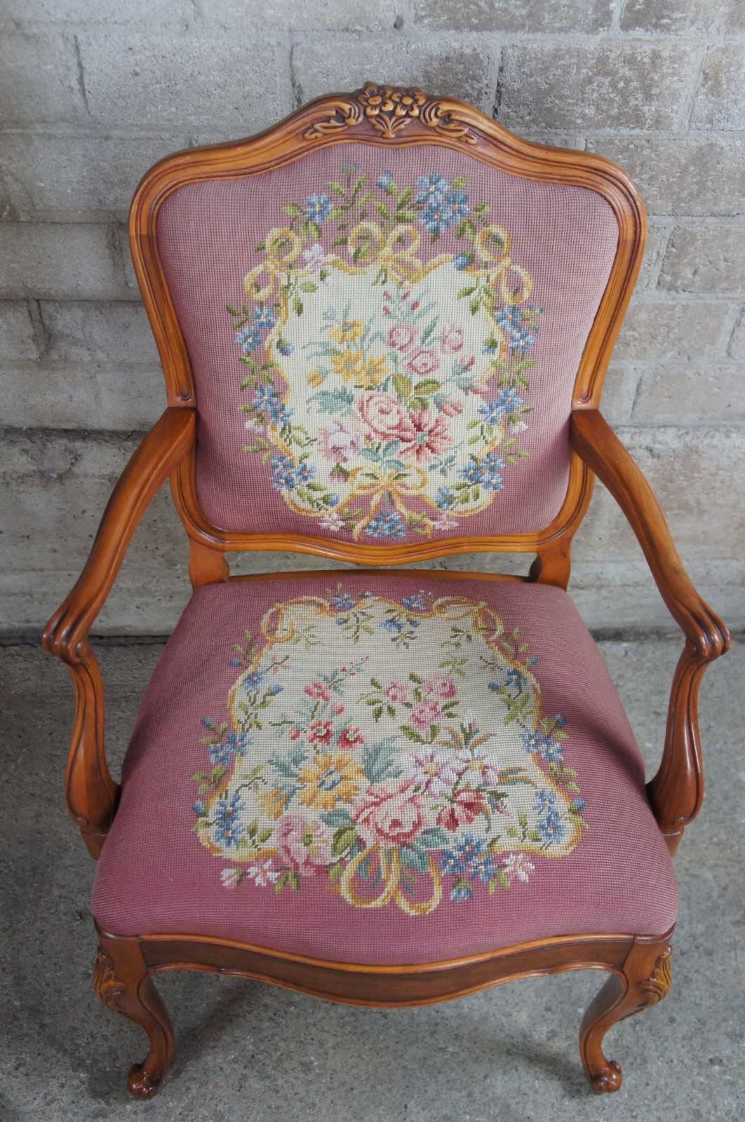 Circa 1940s Mount Airy needlepoint dining chairs. Made from walnut with open pierced splat, carved accents, cabriole legs and needlepoint seats. Mount Airy of North Carolina's roots go back to 1888 when the lumber and woodworking industry was booming. They had three large factories and quickly evolved into specialized furniture suites. They enjoyed a successful run until 1997 when a fire completely destroyed their facilities.
