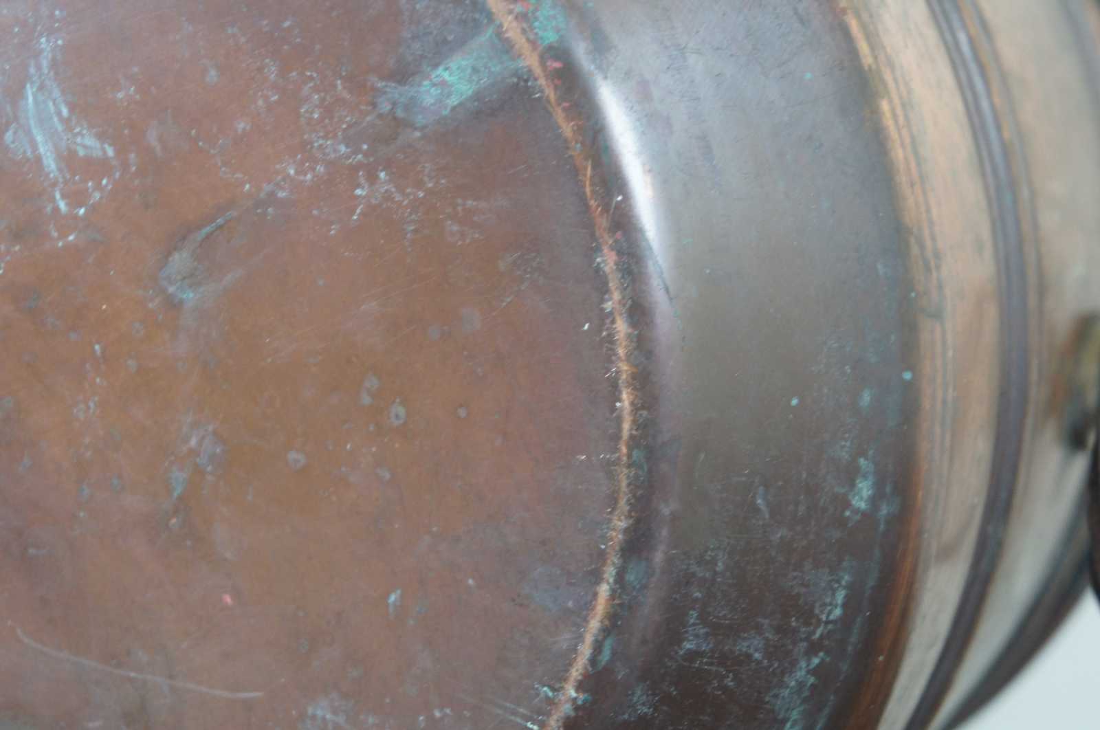 Antique copper cauldron or pot with turned / twisted iron handles, banding around the body and distressed patina.