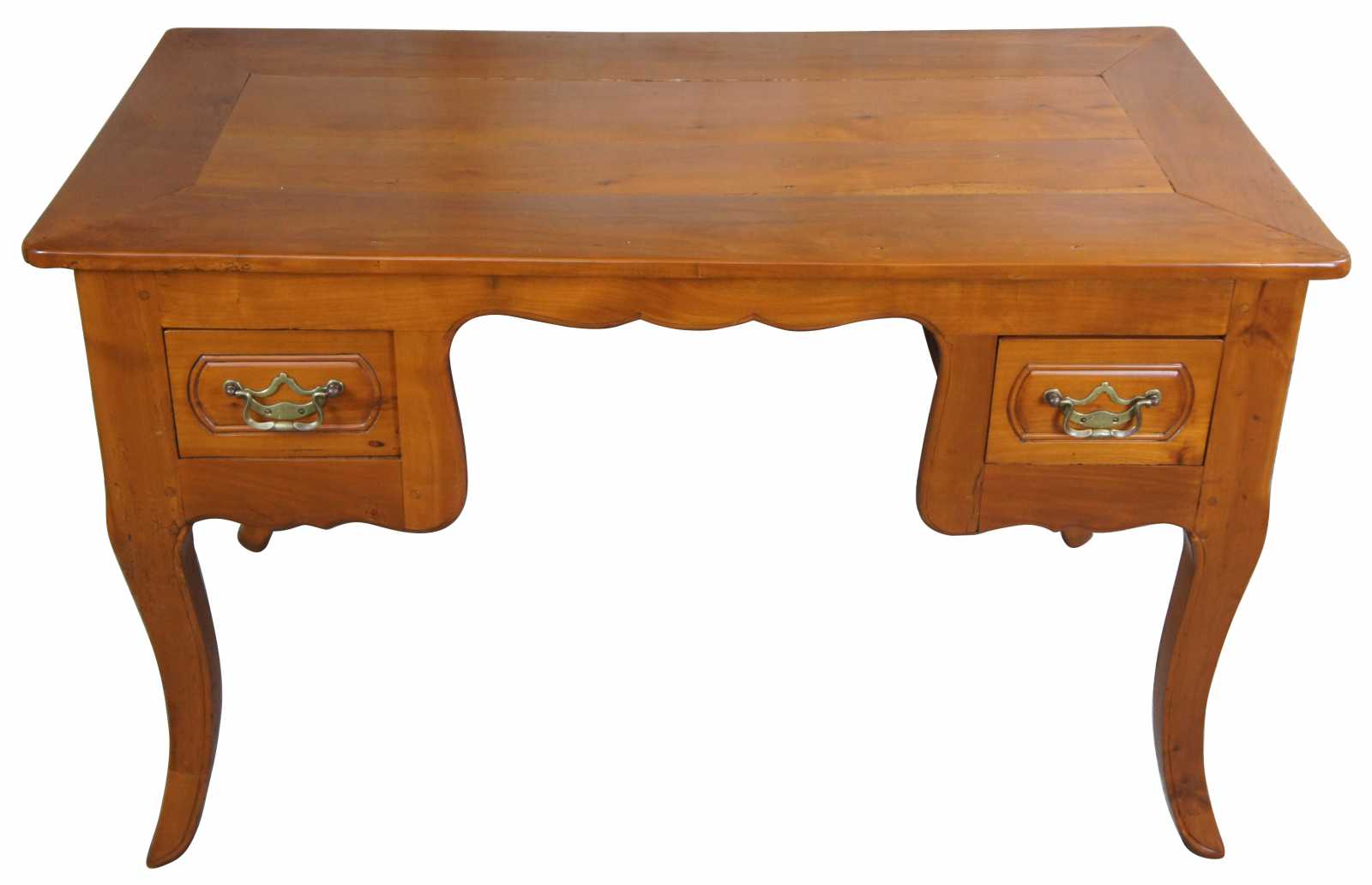 Late 18th century French fruitwood writing desk. Features two drawers, brass hardware, scrolled aprons, and cabriole legs.