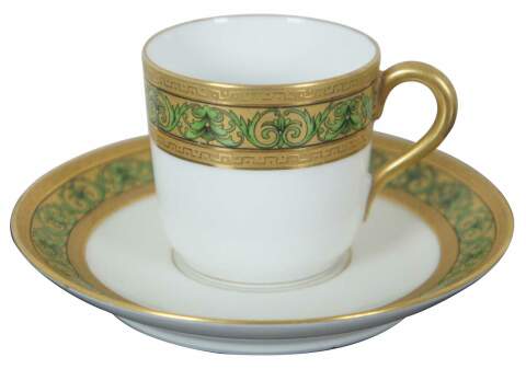 French porcelain cup and saucer by T&V with green vines and gold Grecian (Greek Key) inspired edging.