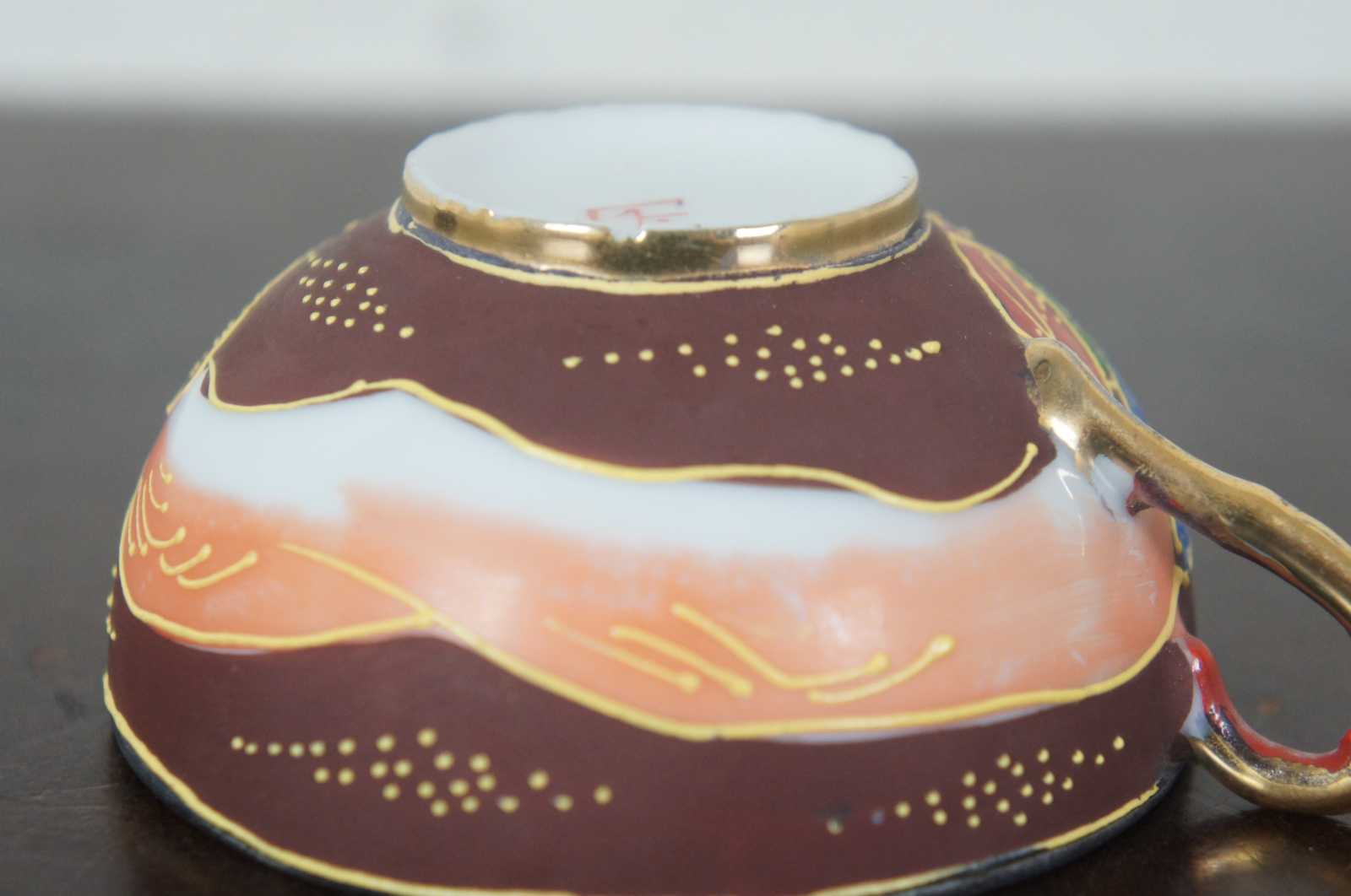 Vintage Satsuma style Japanese moriage teacup and saucer featuring a trio of immortal figures.