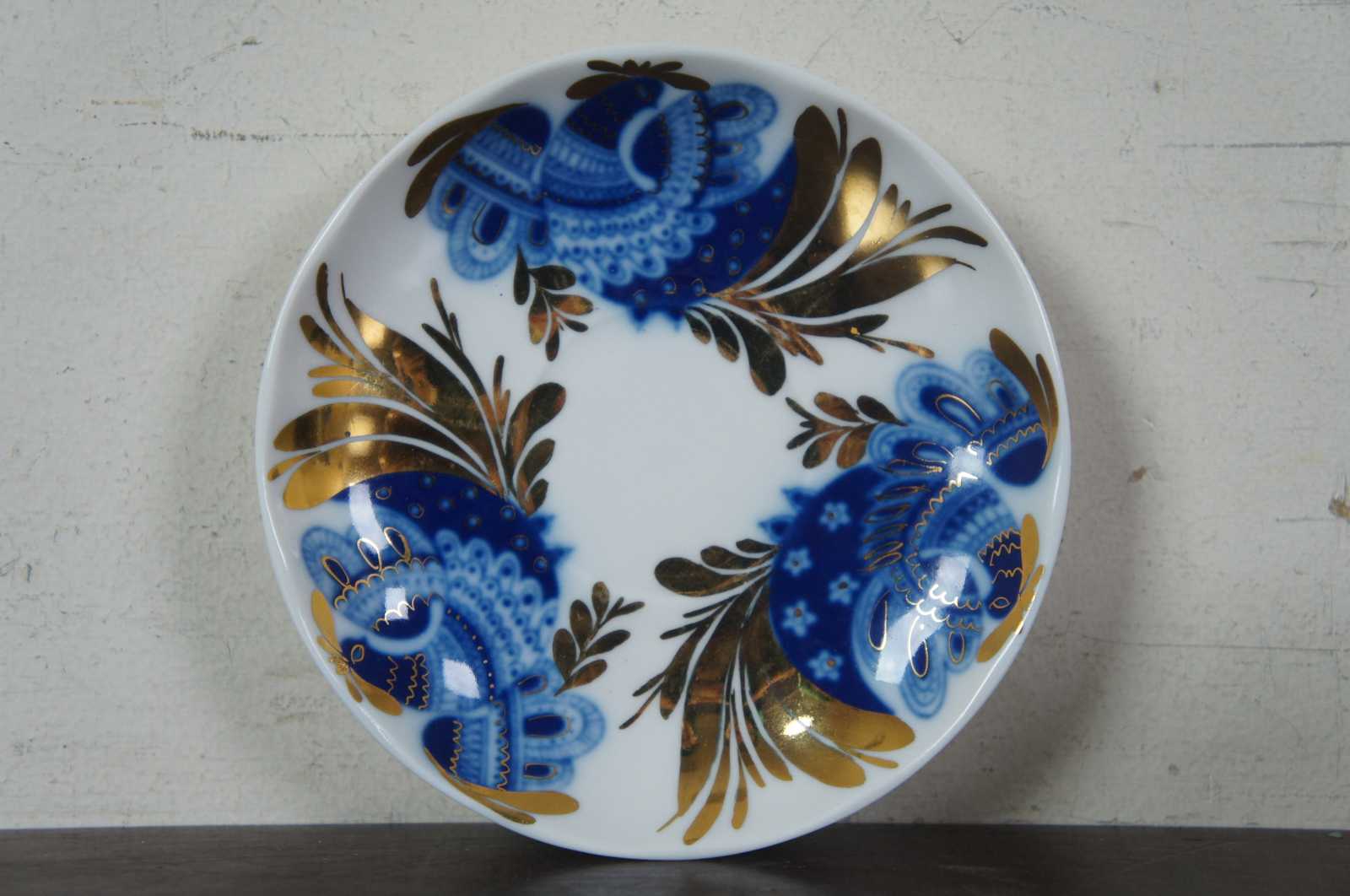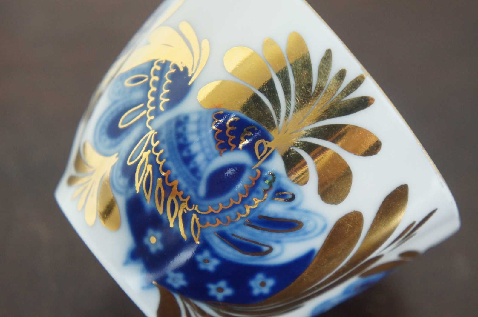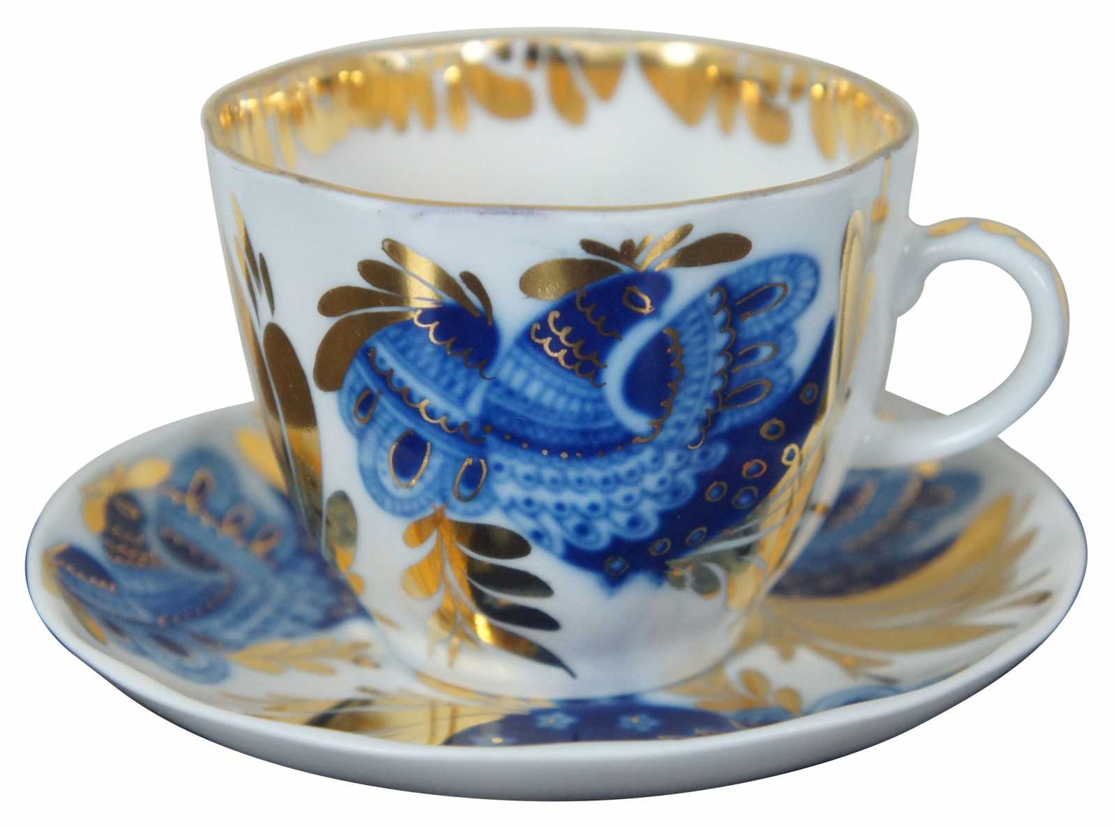 Lomonosov Russian Imperial porcelain, cobalt blue and 22kt gold teacup and saucer in the Golden Garden pattern.