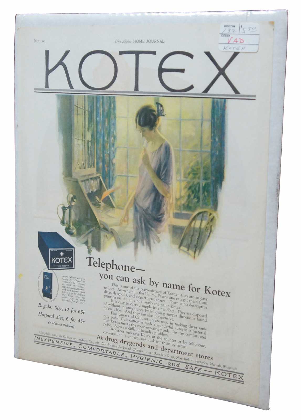 Antique 1923 Kotex sanitary pad advertisement form the Ladies Home Journal featuring a woman standing by the telephone book.