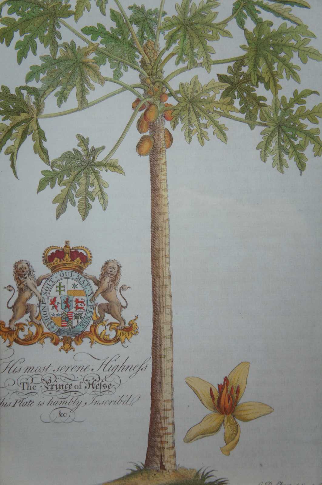 Two fantastic framed botanical prints stemming from Welsh botanist Griffith Hughes' [1707–1758) research publication "The Natural History of Barbados [pub. 1750]. The book captures Hughes' recorded observations of the natural botanical features of the island over a period of of several years. The illustrative prints are taken from illustrations done by famed German botanist, botanical illustrator and entomologist, George Dionysius Ehret (G.D. Ehret) and sculpted to plate by J. Mynde [1740-1770], sculptor. These are vintage (mid-20th century) lithographs derived from the plate printing process.