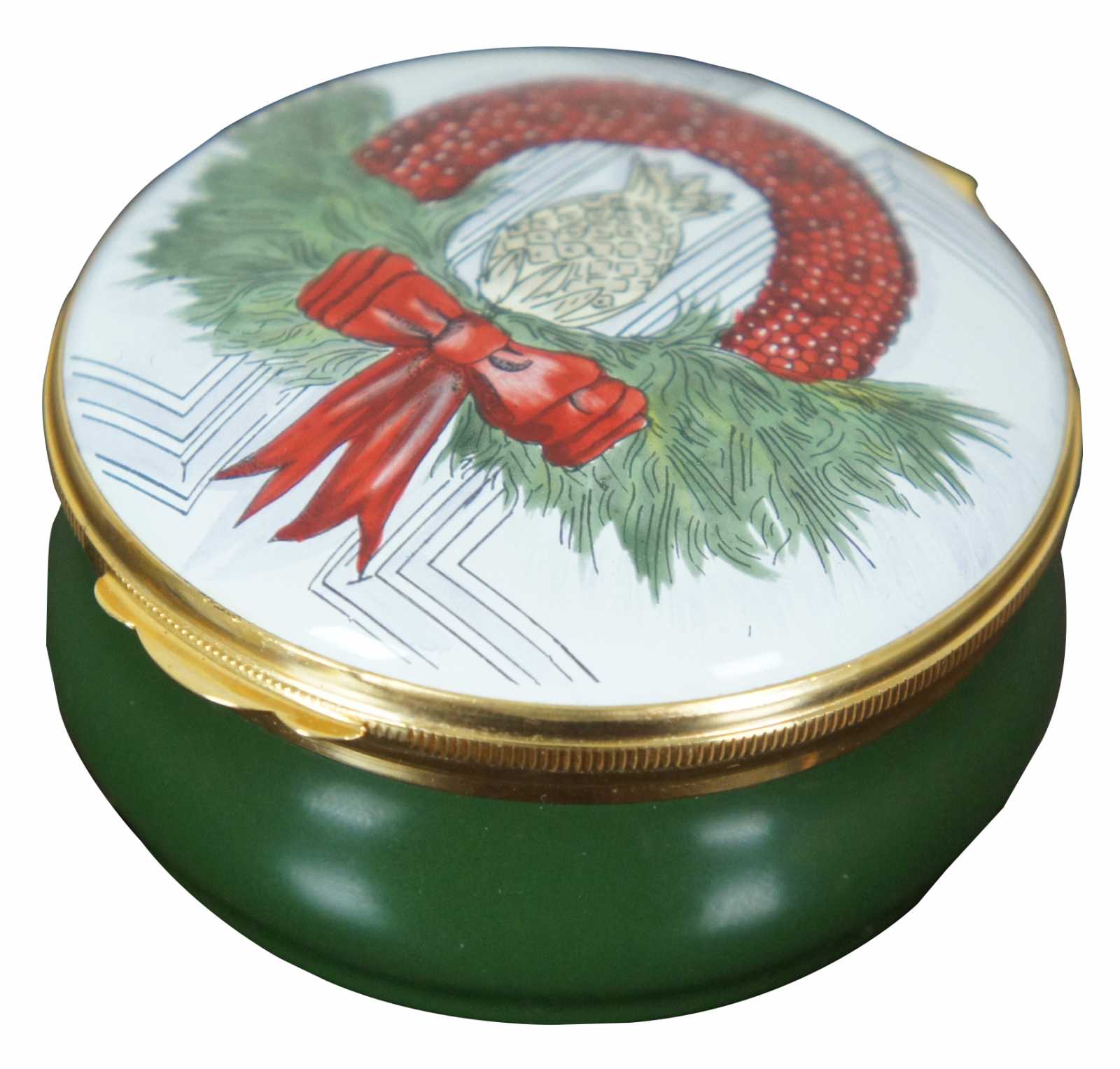 Limited edition Nantucket Cranberry Wreath, Christmas 1993 enamel trinket box by Crummles & Co for Anderson’s-Nantucket.