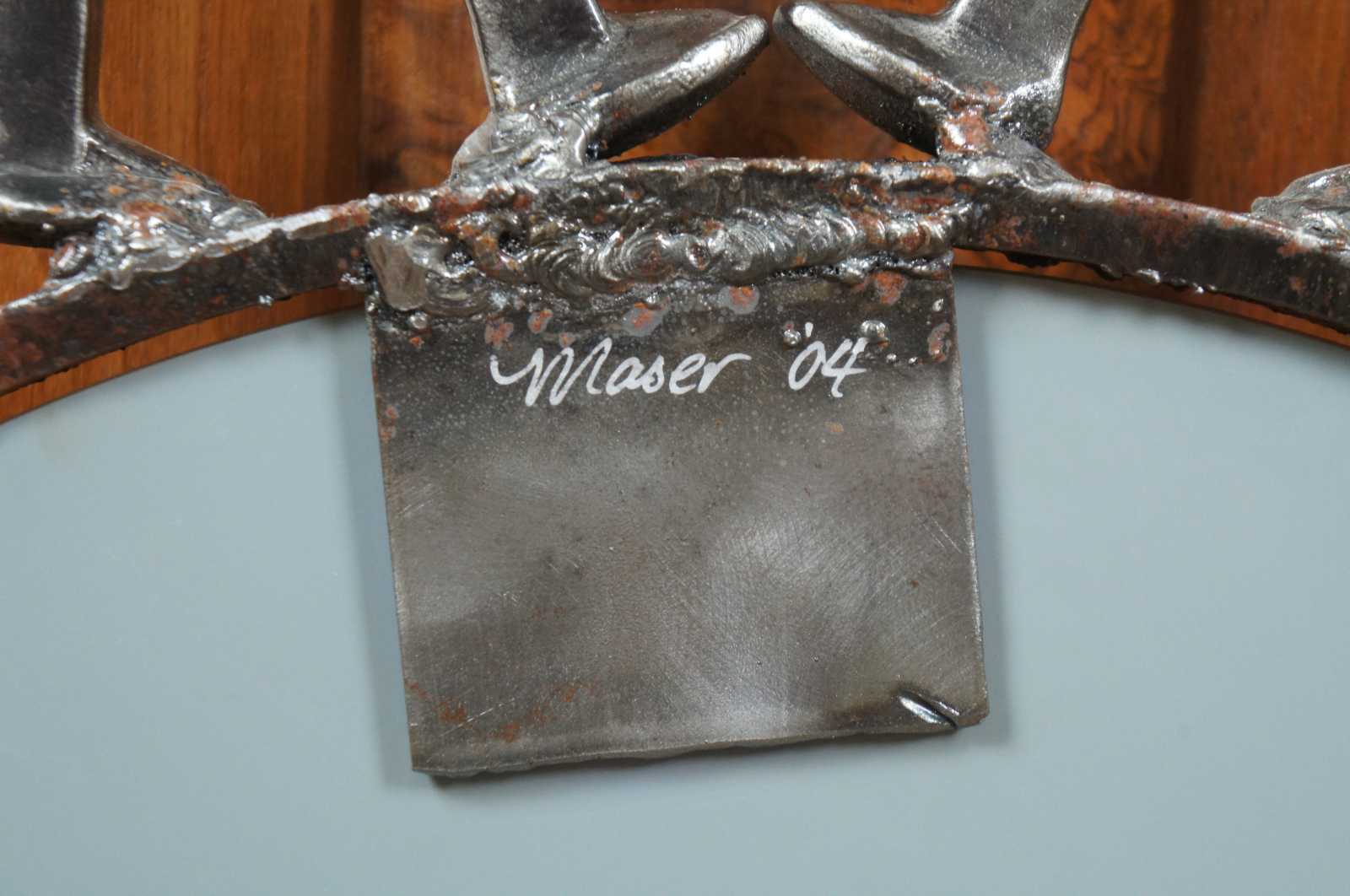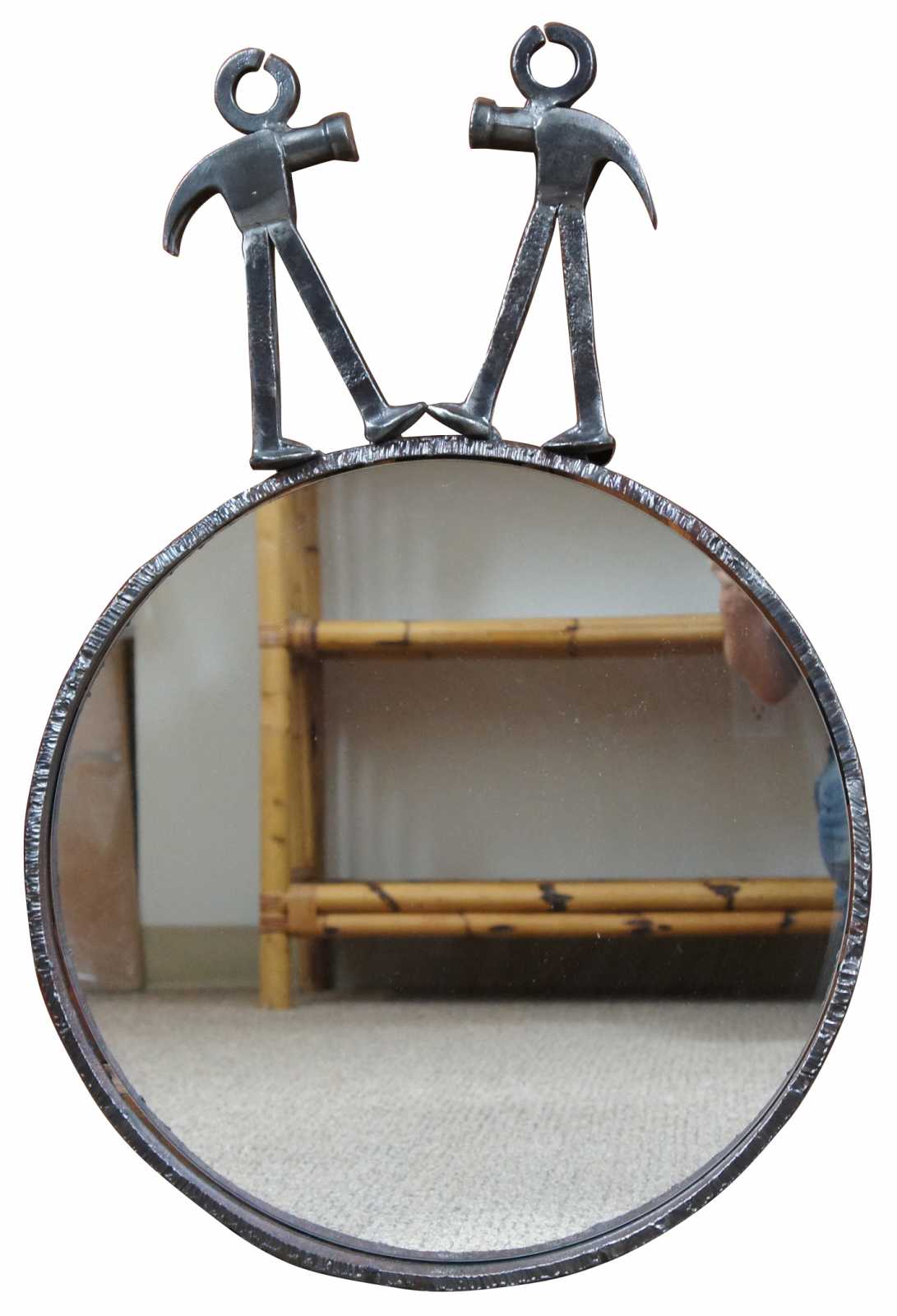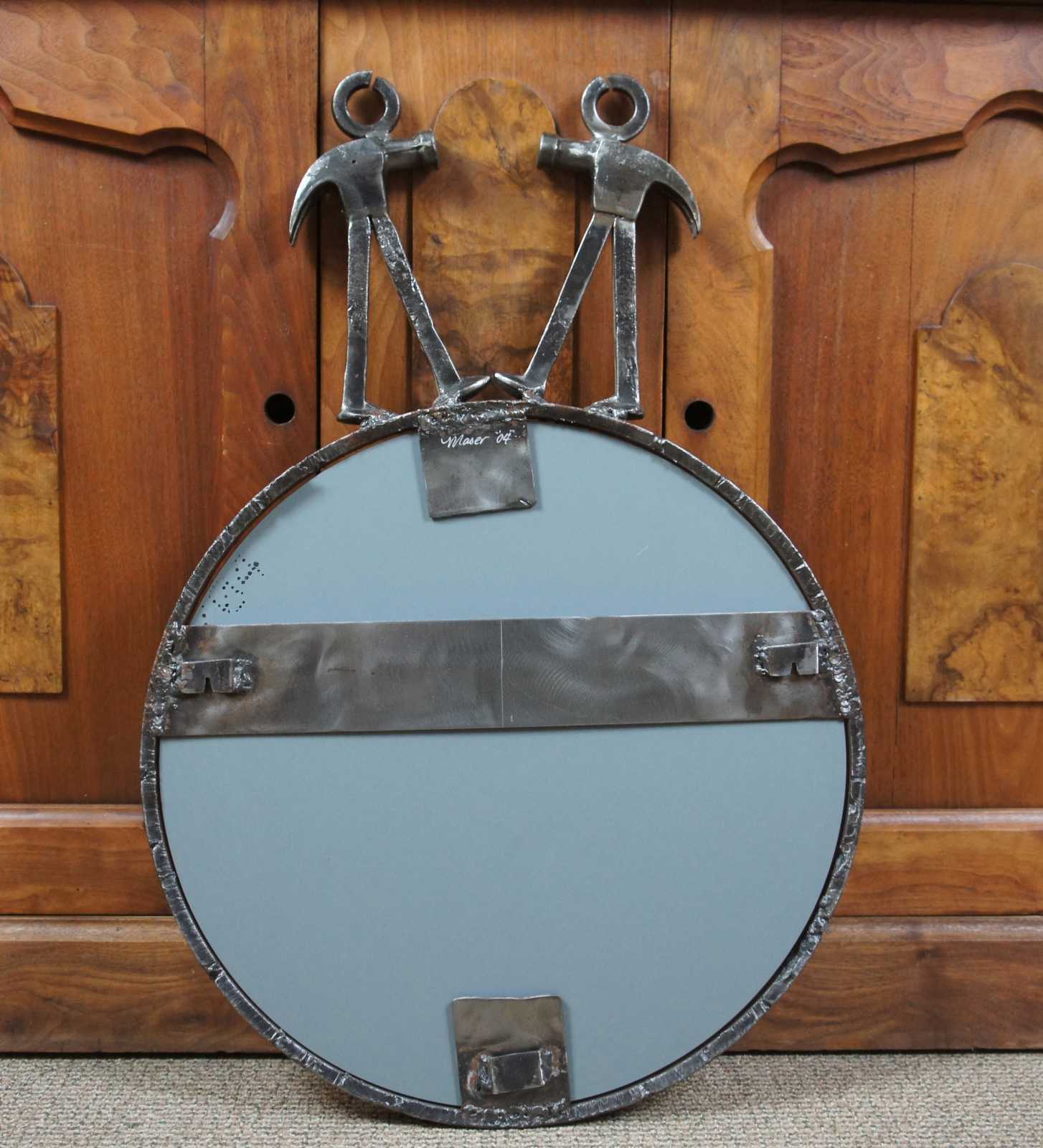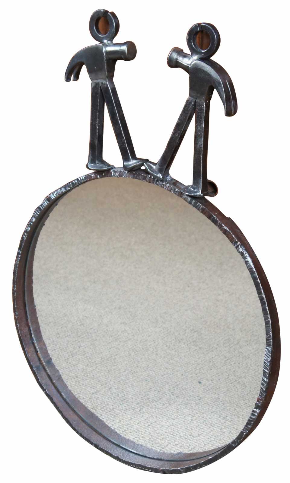 Circa 2004 industrial round iron mirror by Maser. Features welded men, made of hammers and railroad nails.