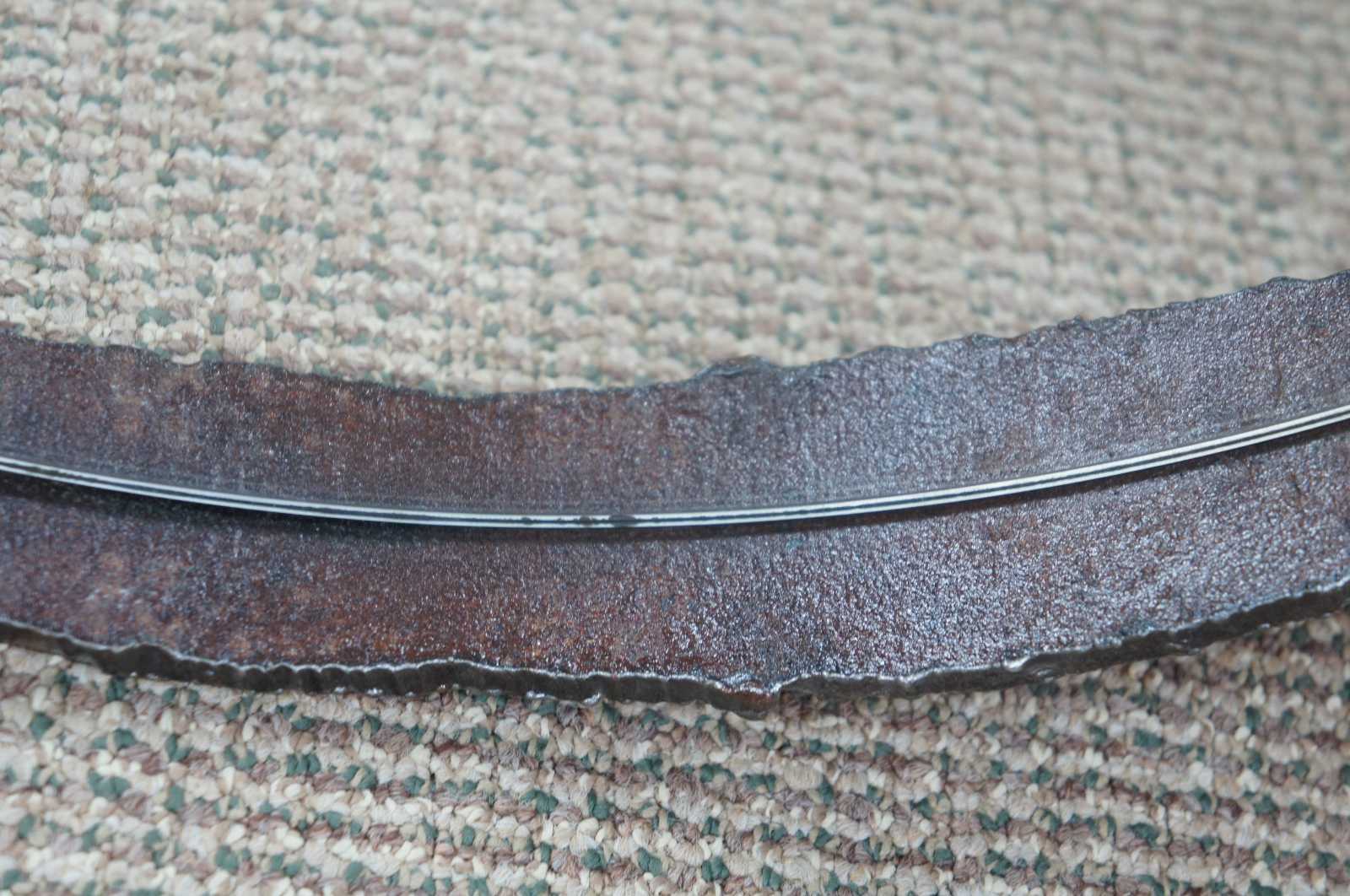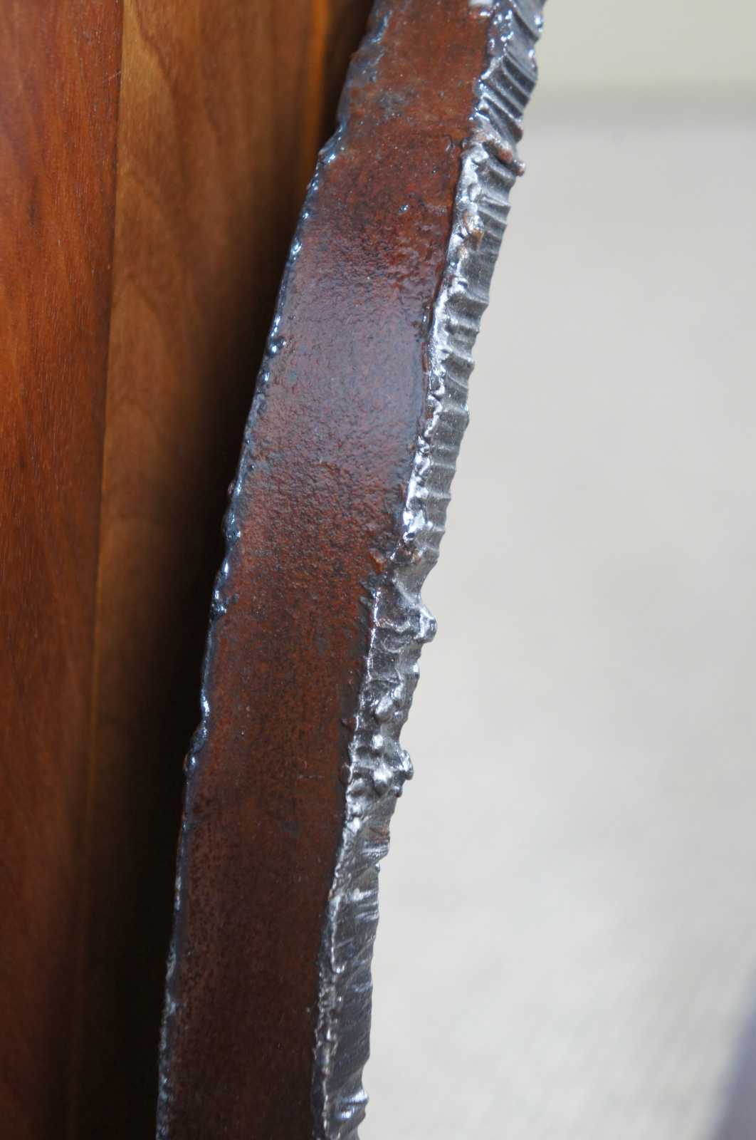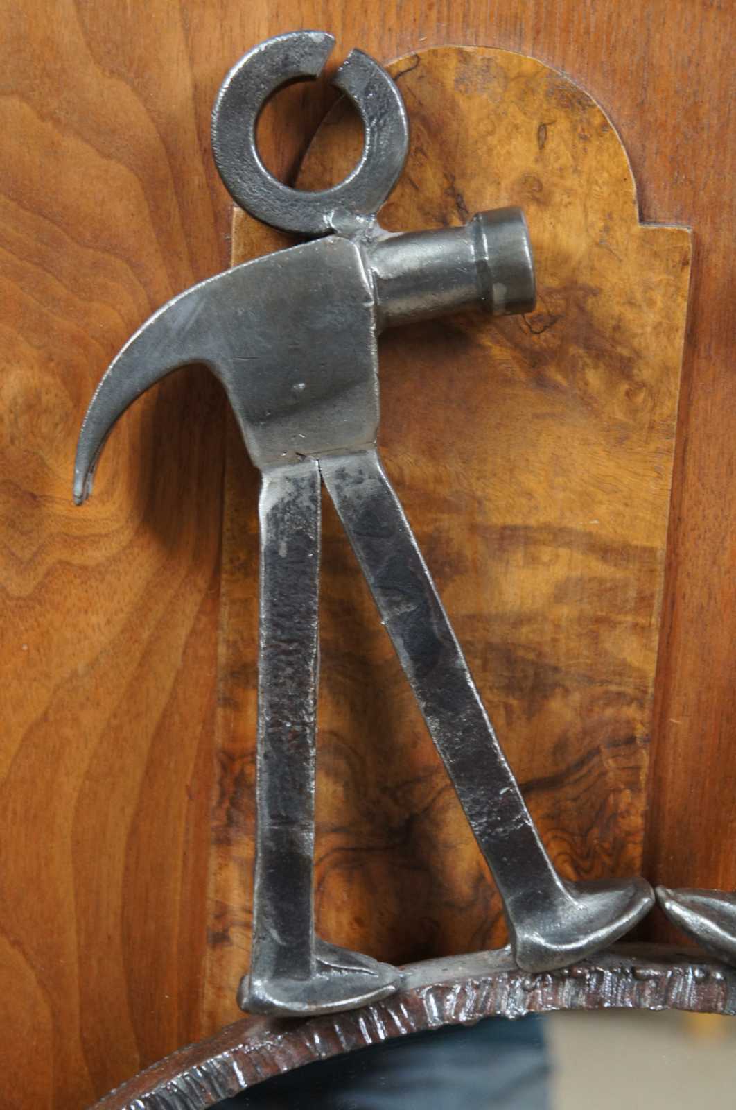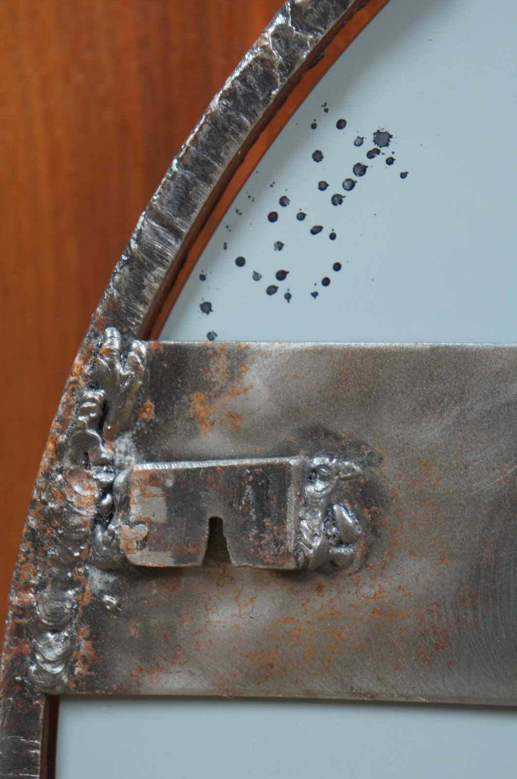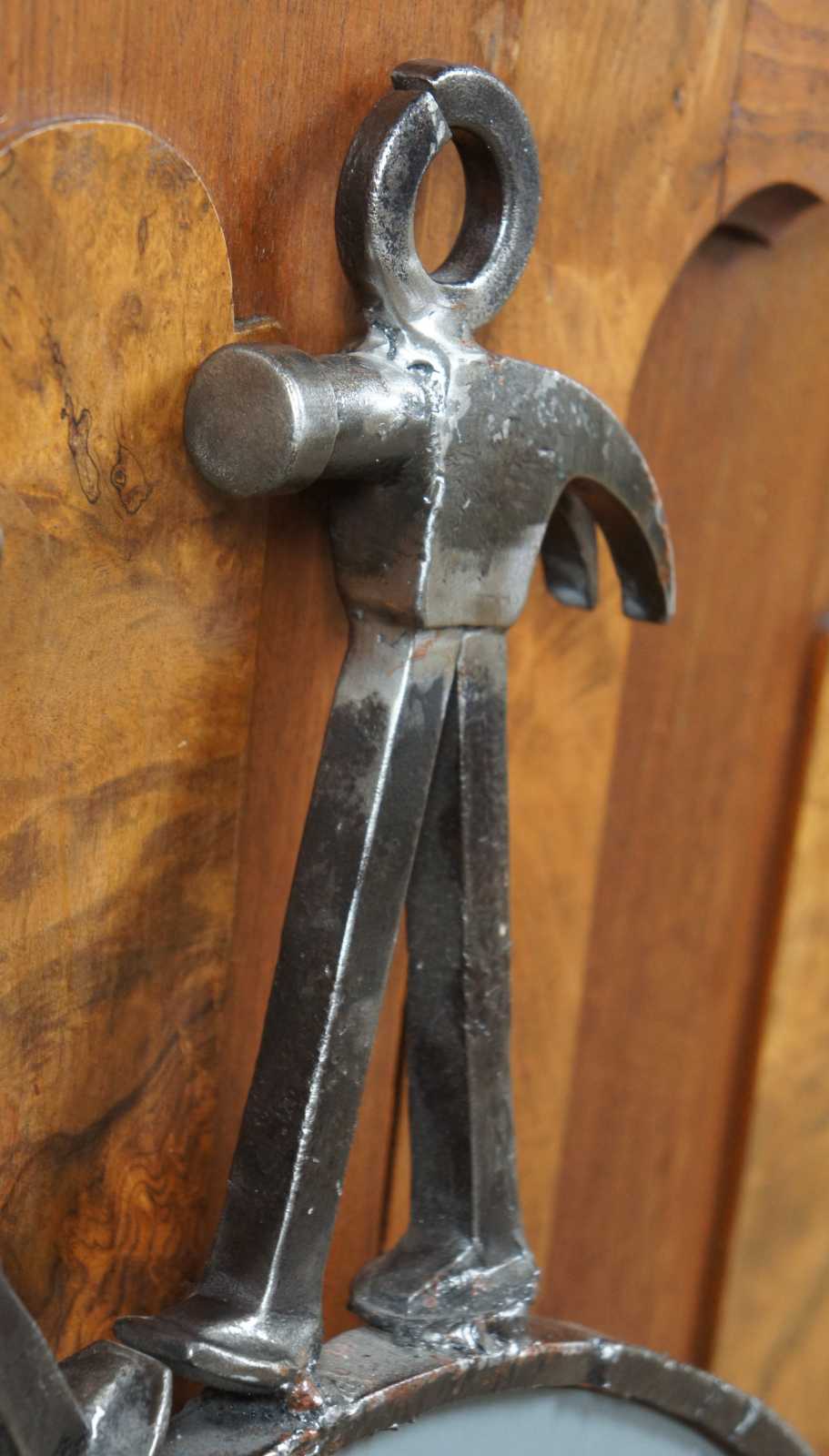 Circa 2004 industrial round iron mirror by Maser. Features welded men, made of hammers and railroad nails.