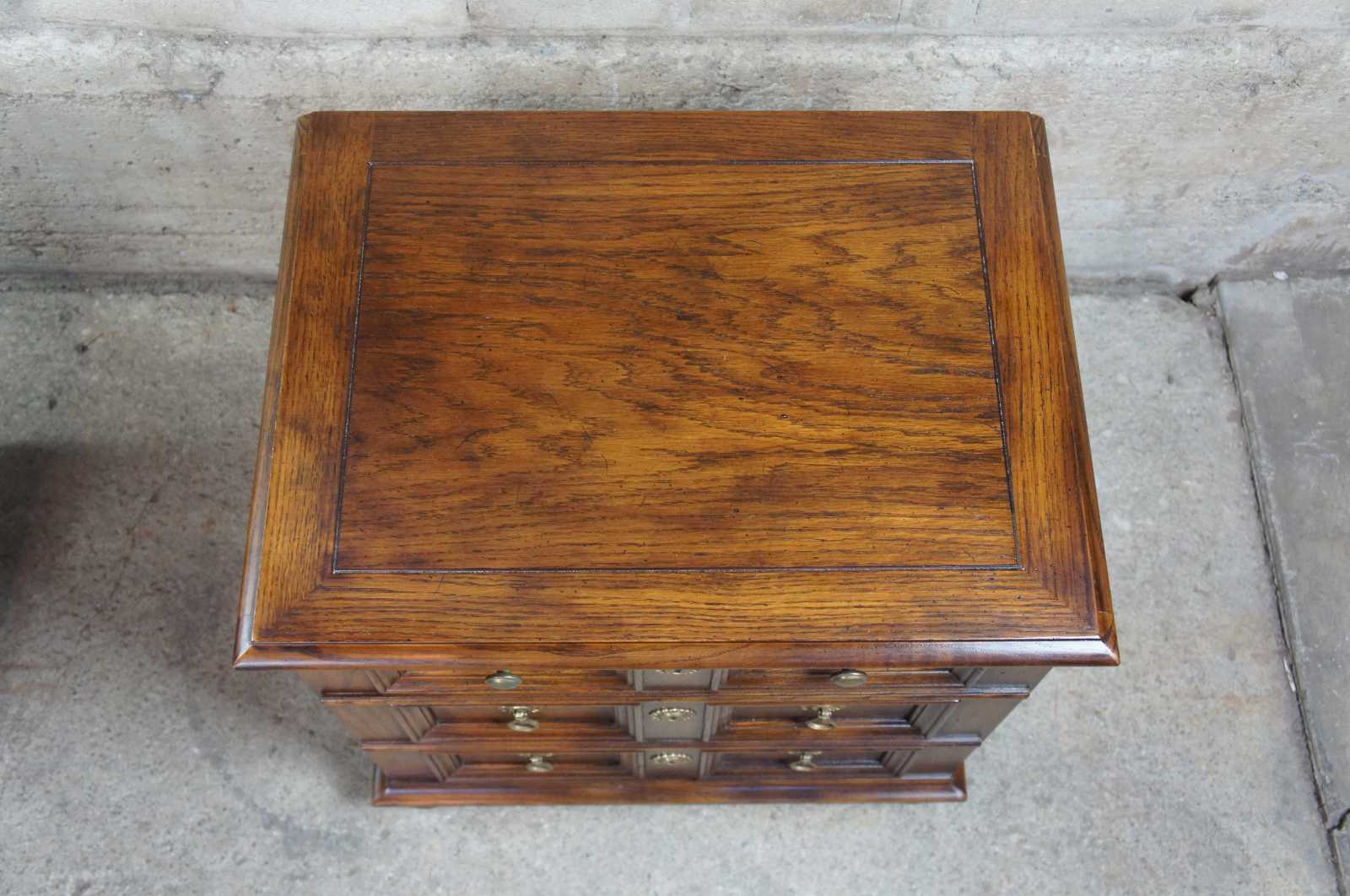 1979 Henredon nightstands. Made from oak with classic 18th century English styling. Includes robust paneled drawer fronts with victorian inspired knockers, brass key plates and bun feet.