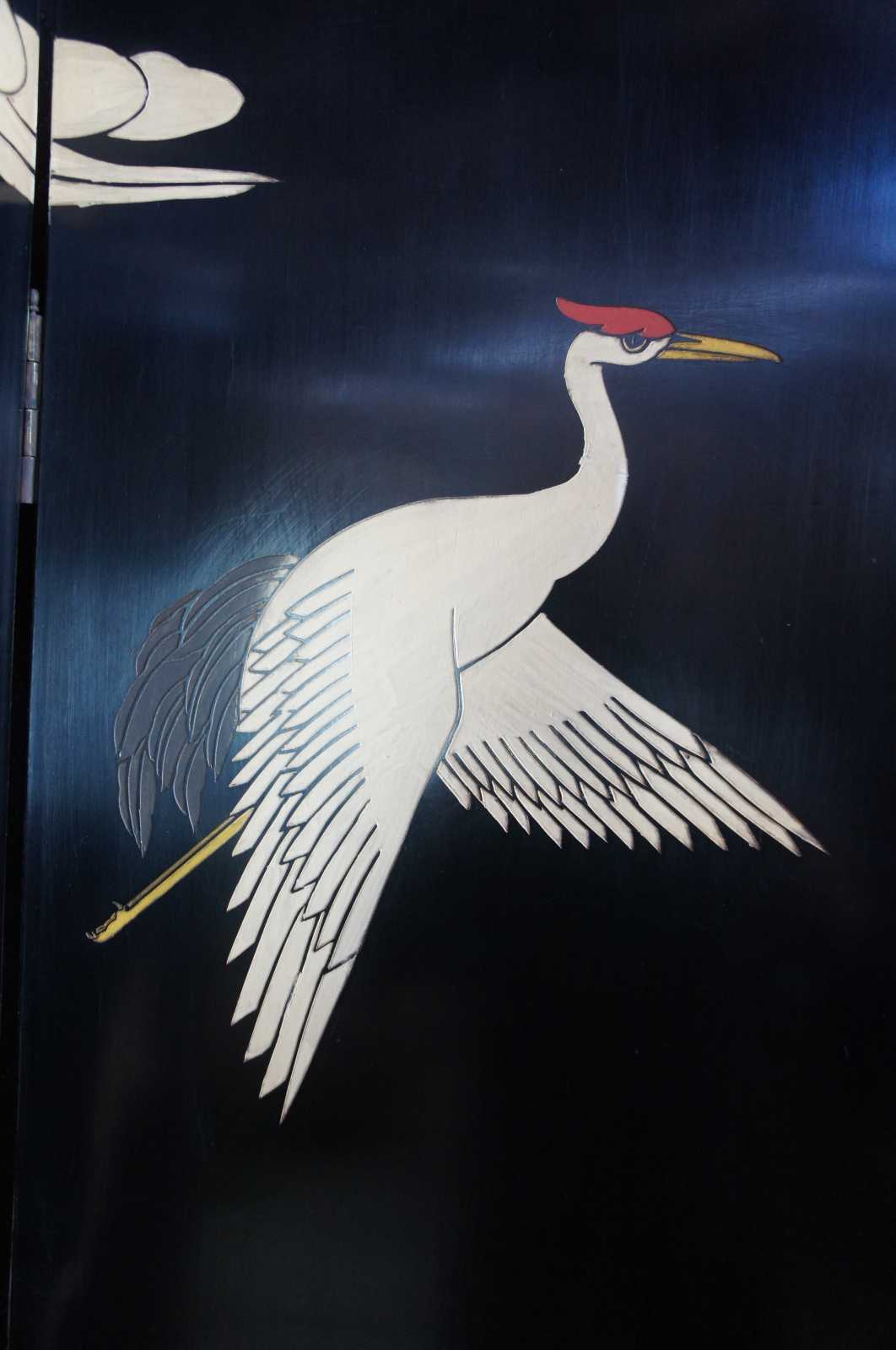 Mid 20th century monumental Coromandel black lacquer screen. Features two decorative designs; including cranes amist the treetops and clouds on one side; and along the other, gods or dieties in a field of clouds with animals, pagodas and other traditional details. Ornately carved with exceptional detail.