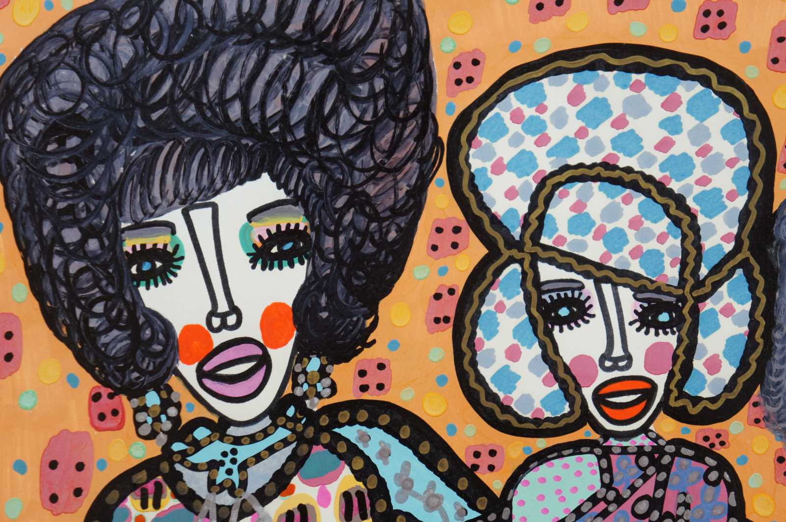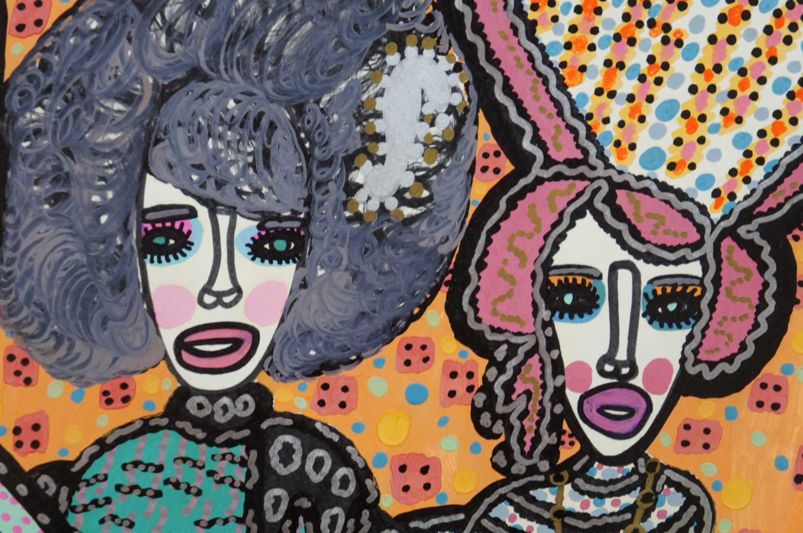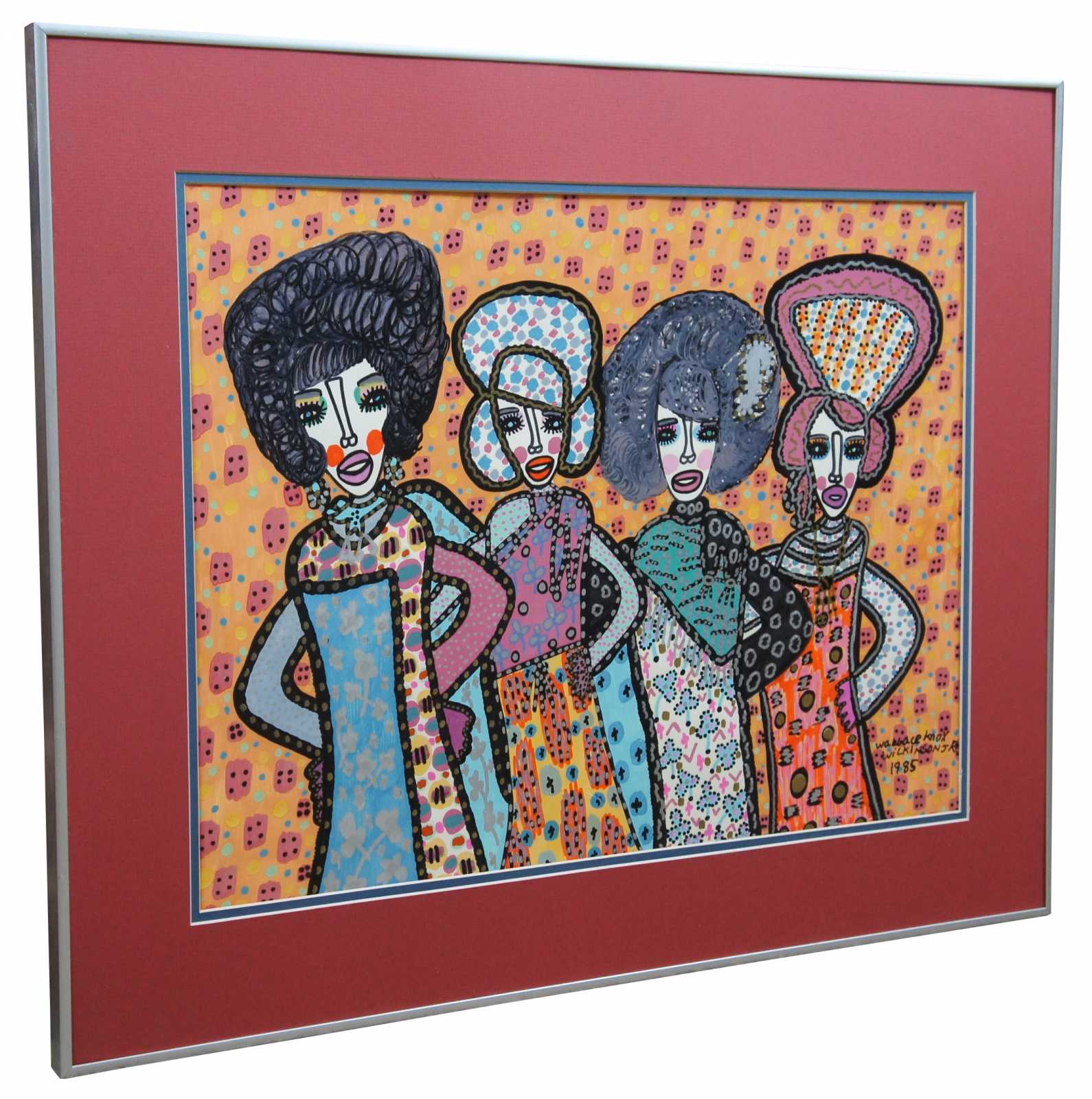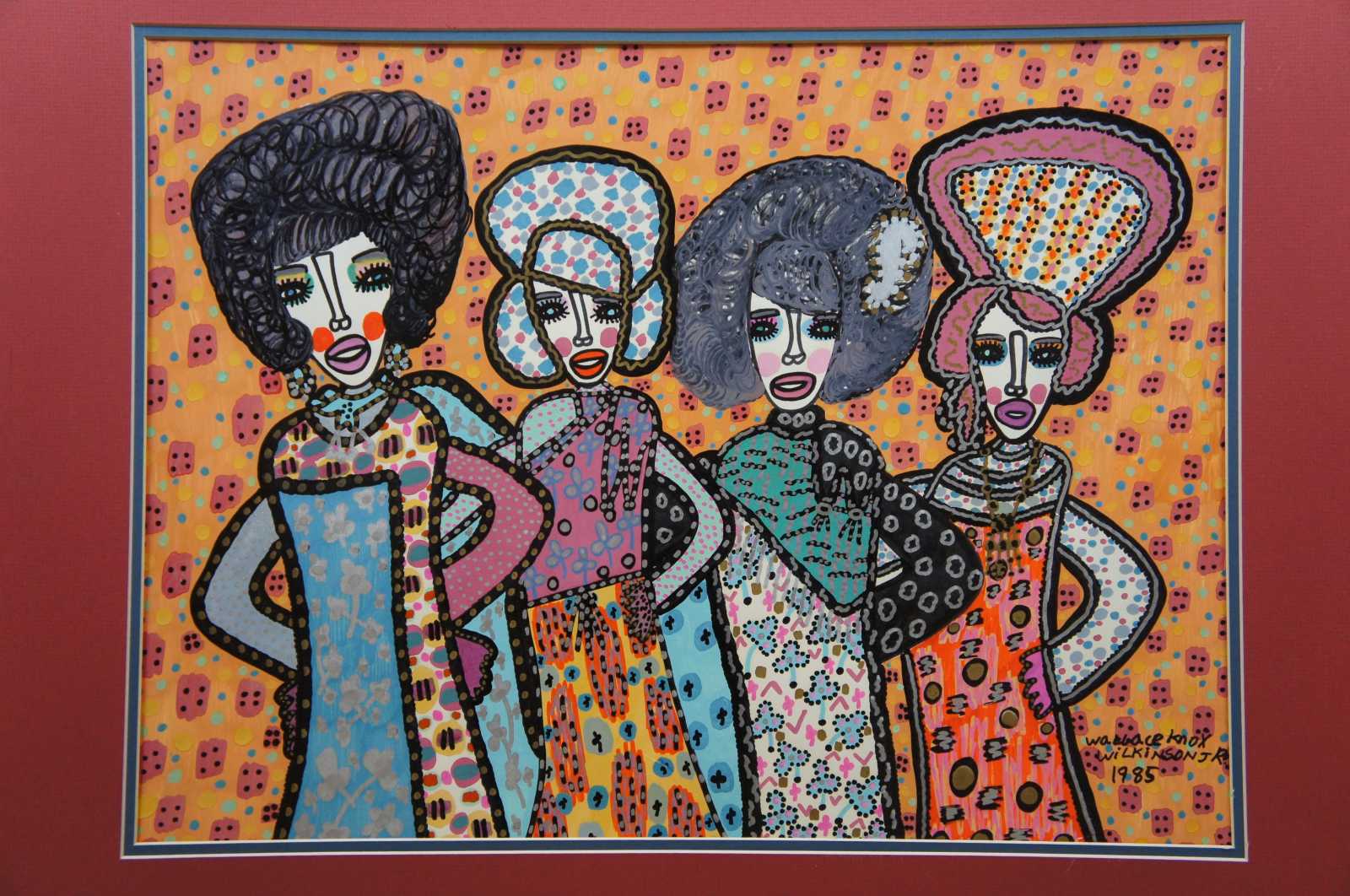 Expressionist painting on paper featuring a group of four women styled like a singing group from the 1970s. Wallace Knox Wilkinson, Jr. b.1954-2016 (age 62). Painted with a combination of Gouch painting and perminent marker. Known for his expressionist style, paint and marker on paper, this folk art piece features the main living space of a large house.