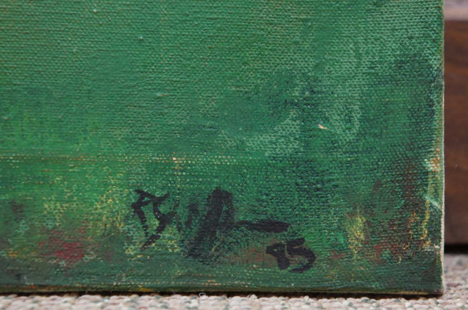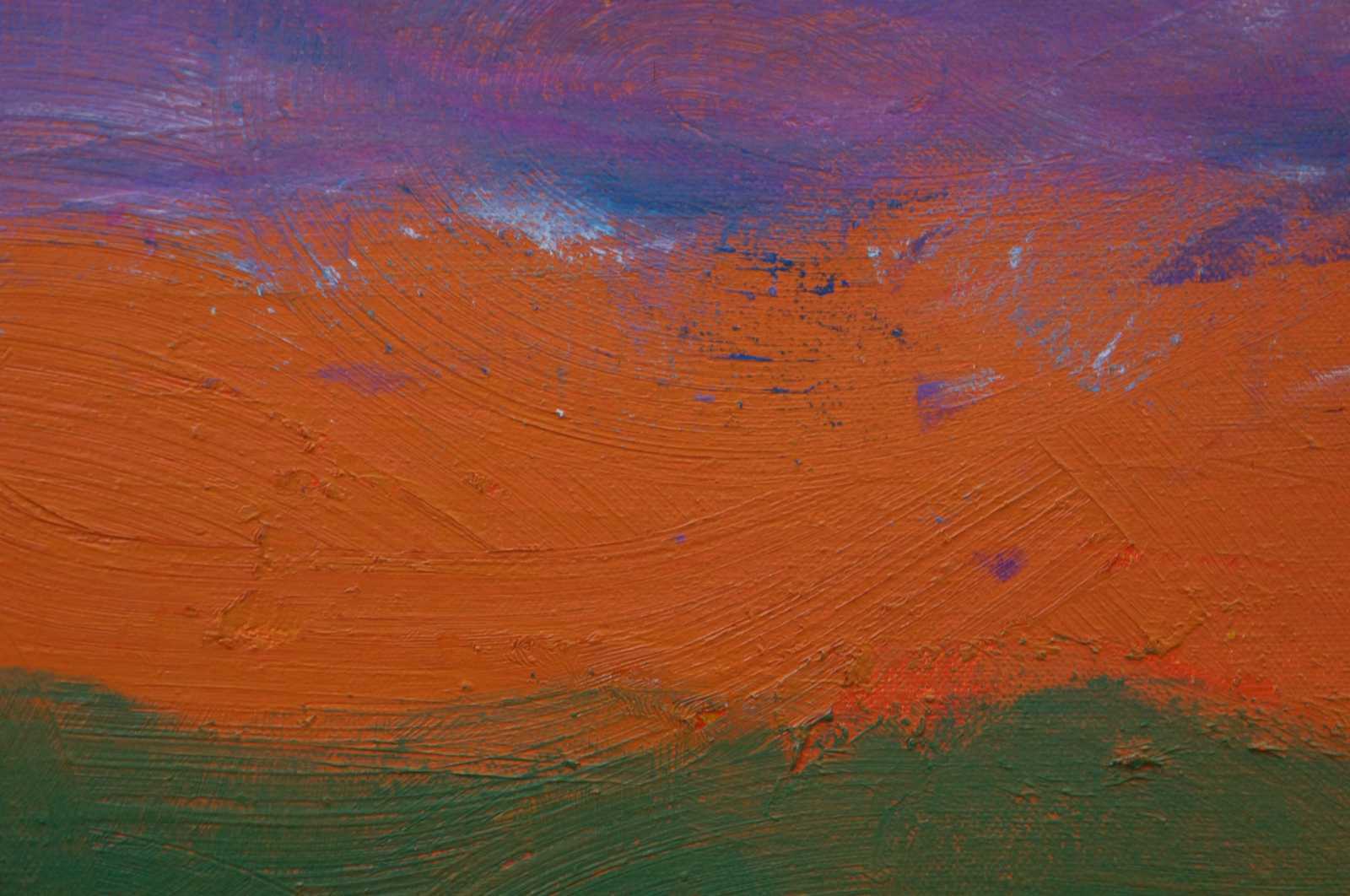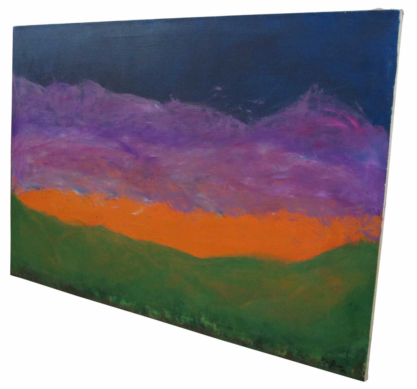 Abstract landscape painting featuring a sunrise or sunset in orange, purple and blue over green grass. Richard Shiffler was an artist and musician. He died in 1994.