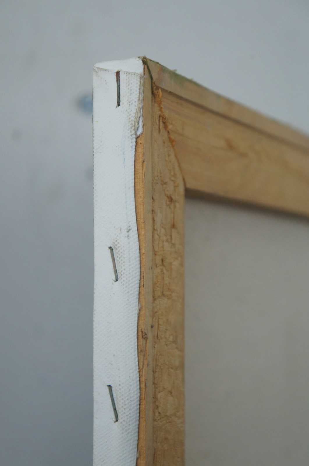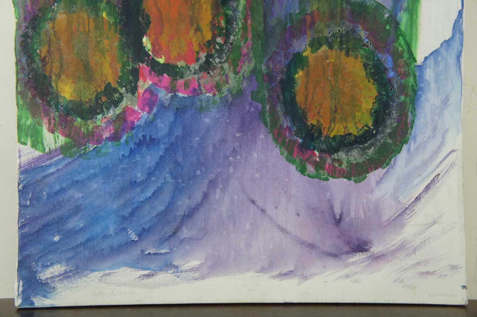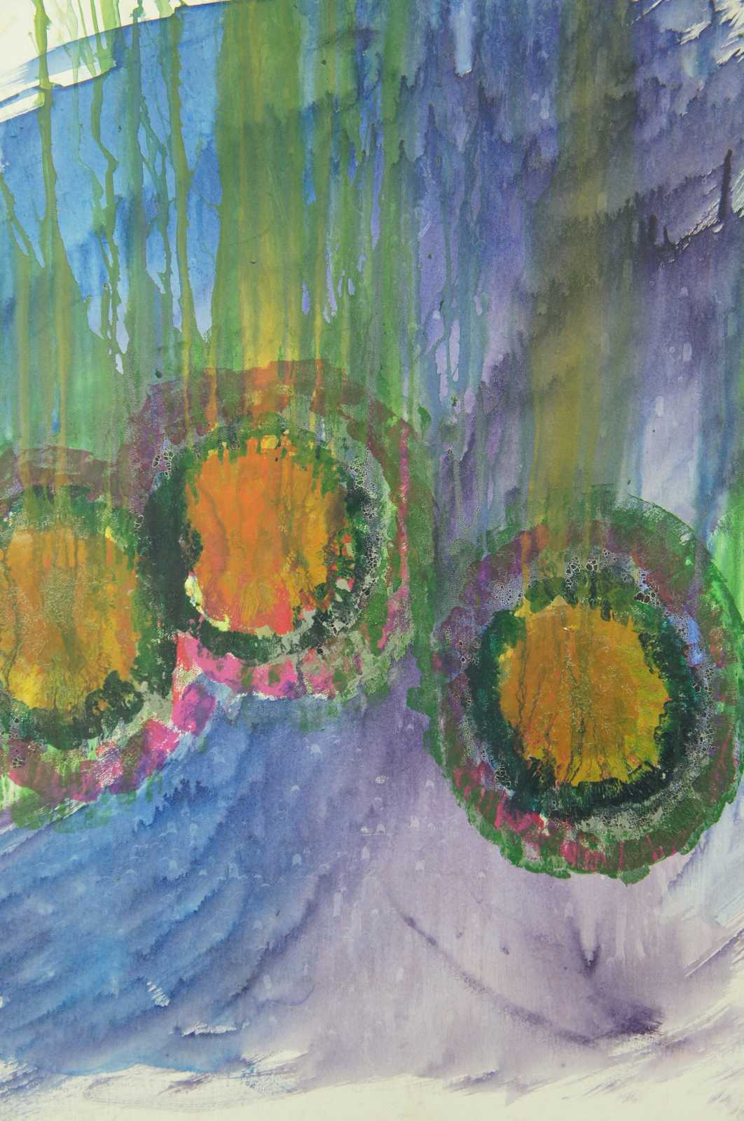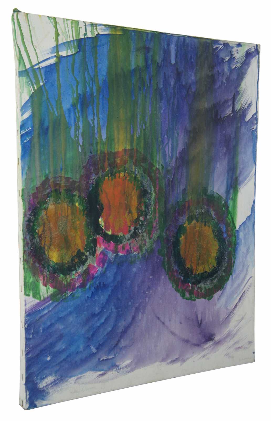 Abstract painting featuring three pink and orange orbs sinking into a blue and purple foreground, titled “Fallen Dreams” in lower left, signed by the artist lower right.