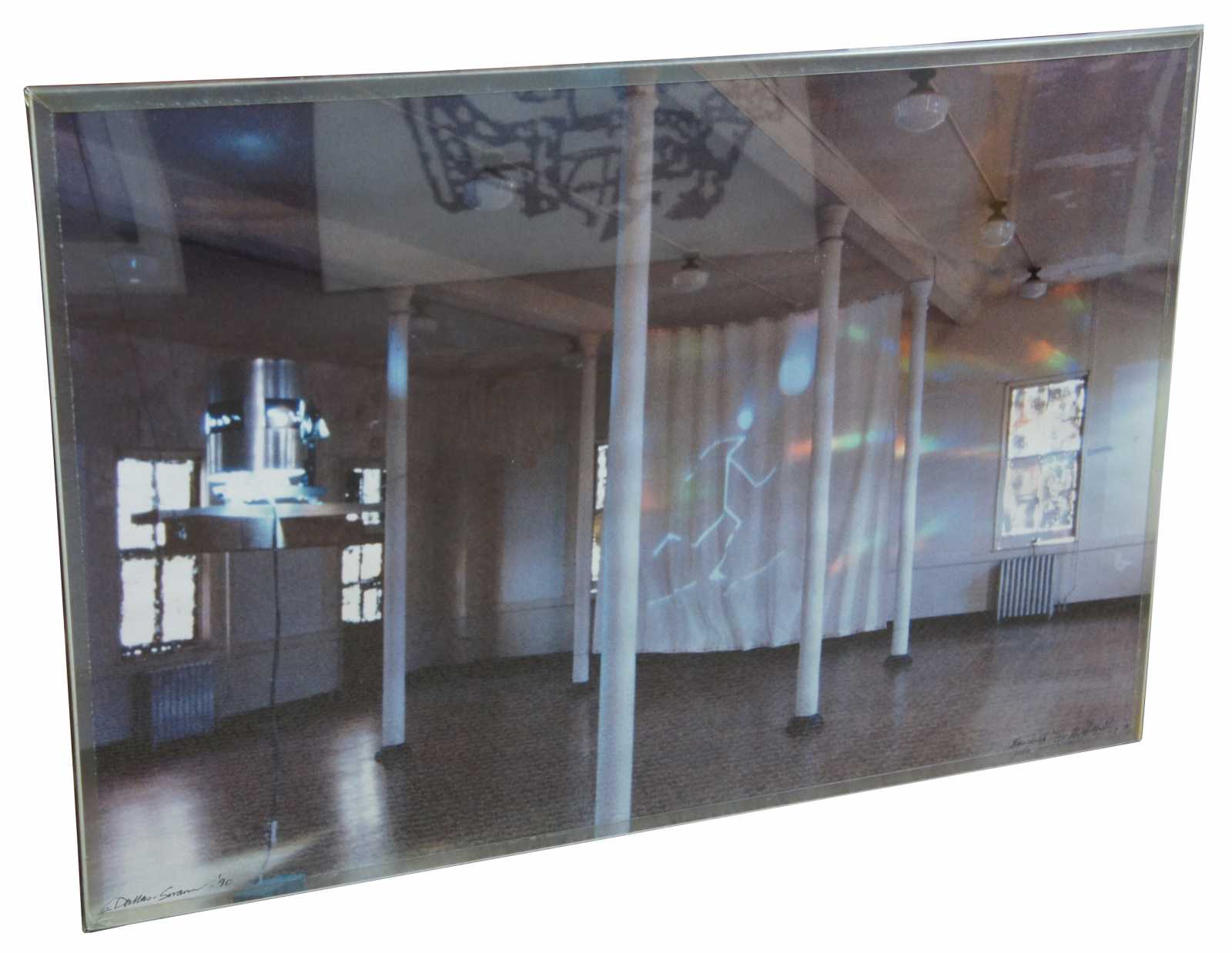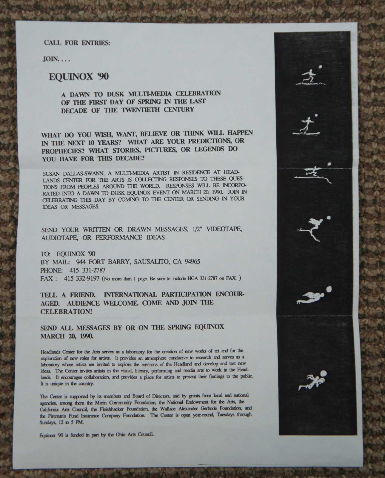 EQuinoz '90-2000 a ten year project began at the Headlands Center for the Art that collected messages about what the future might hold. This dawn to dusk event began when the sun turned on a solar switch that controlled the light sculpture projecting an animation that cycled throughout the month. The environment was filled with rainbow colors of light from diffraction gratings on the large windows as the sun moved across the sky. The light sculpture suspended on redwood projected a revised lcarus myth. International Messages were received by fax, mail, video and performances in response to a call for entries asking what wants, hopes, fears and wishes were held for the future century. Storytellers, dancers, musicians and poets performed to celebrate the last vernal equinox of the 20th century.