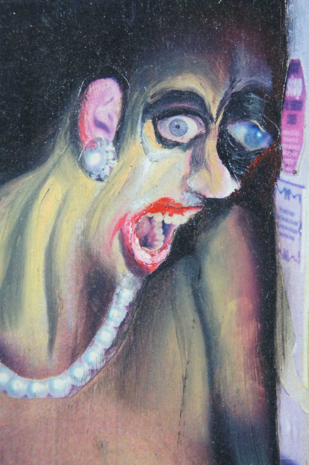 “Hold Up in Apt 3A” 1996 by Jeff Drew, a surrealist collage and oil on board featuring a partially obscured figure pointing a gun at a woman through a half open, chained apartment door. / Jeffery Drew (b. August 29, 1973) from Centerville, Indiana has been creating art since early childhood. He attended the John Herron School of Art in Indianapolis, IN from 1992-1997. After school he began his work as a freelance illustrator and designer. Drew designed his first cover for Albuquerque’s “The Weekly Alibi” in 1999 and worked as a full time graphic designer there from 2004-2012. Drew’s artistic output includes not only illustration and commercial graphic design, but music and animation as well.