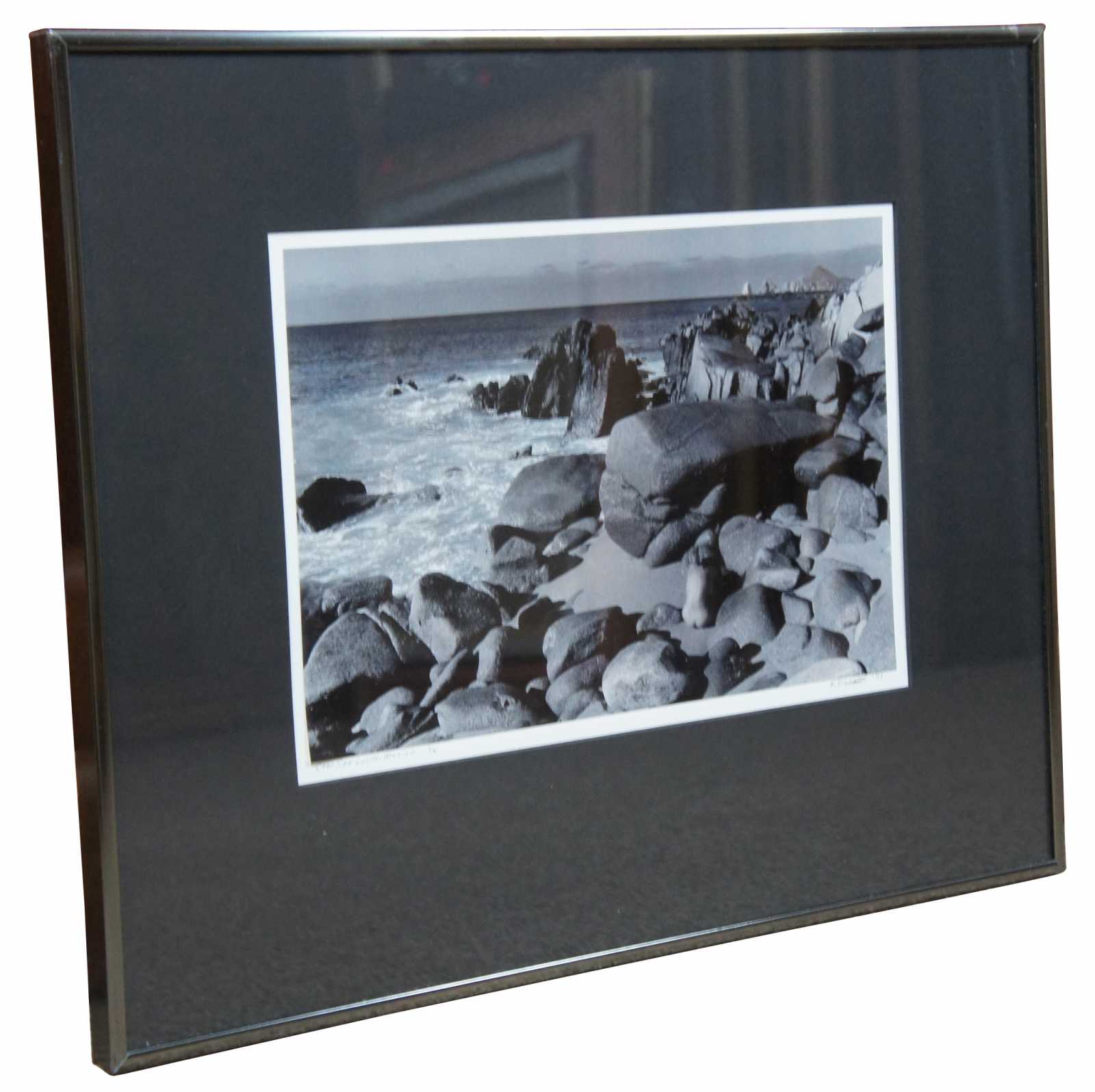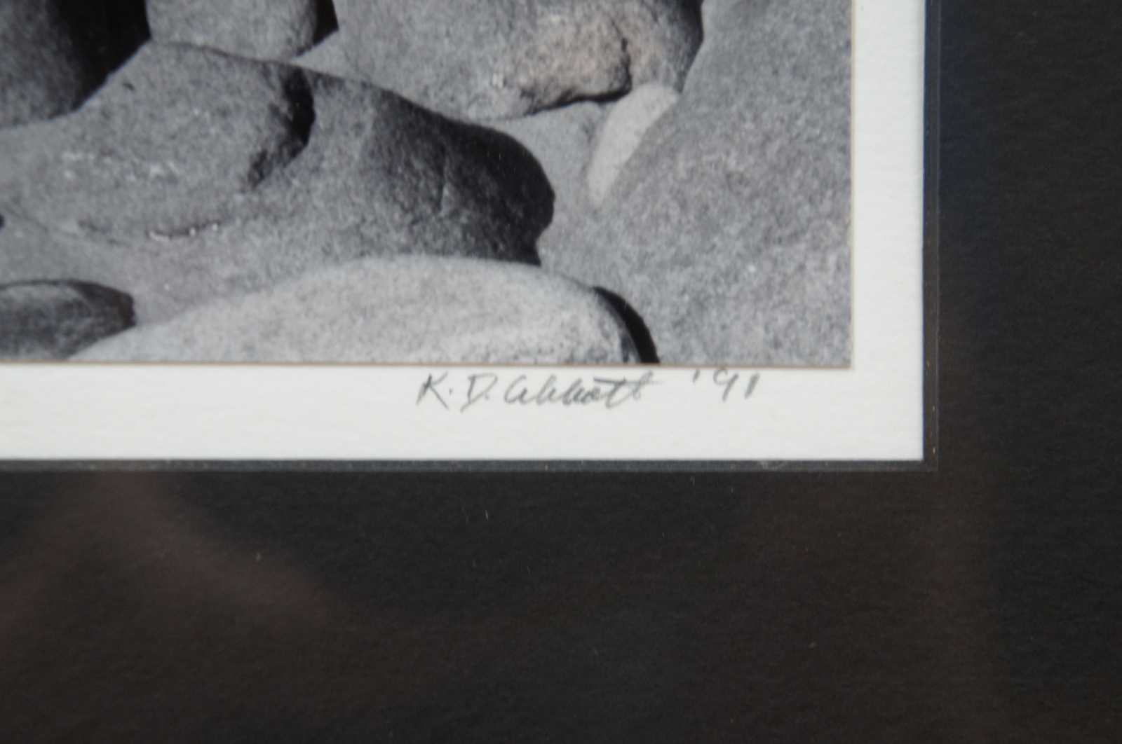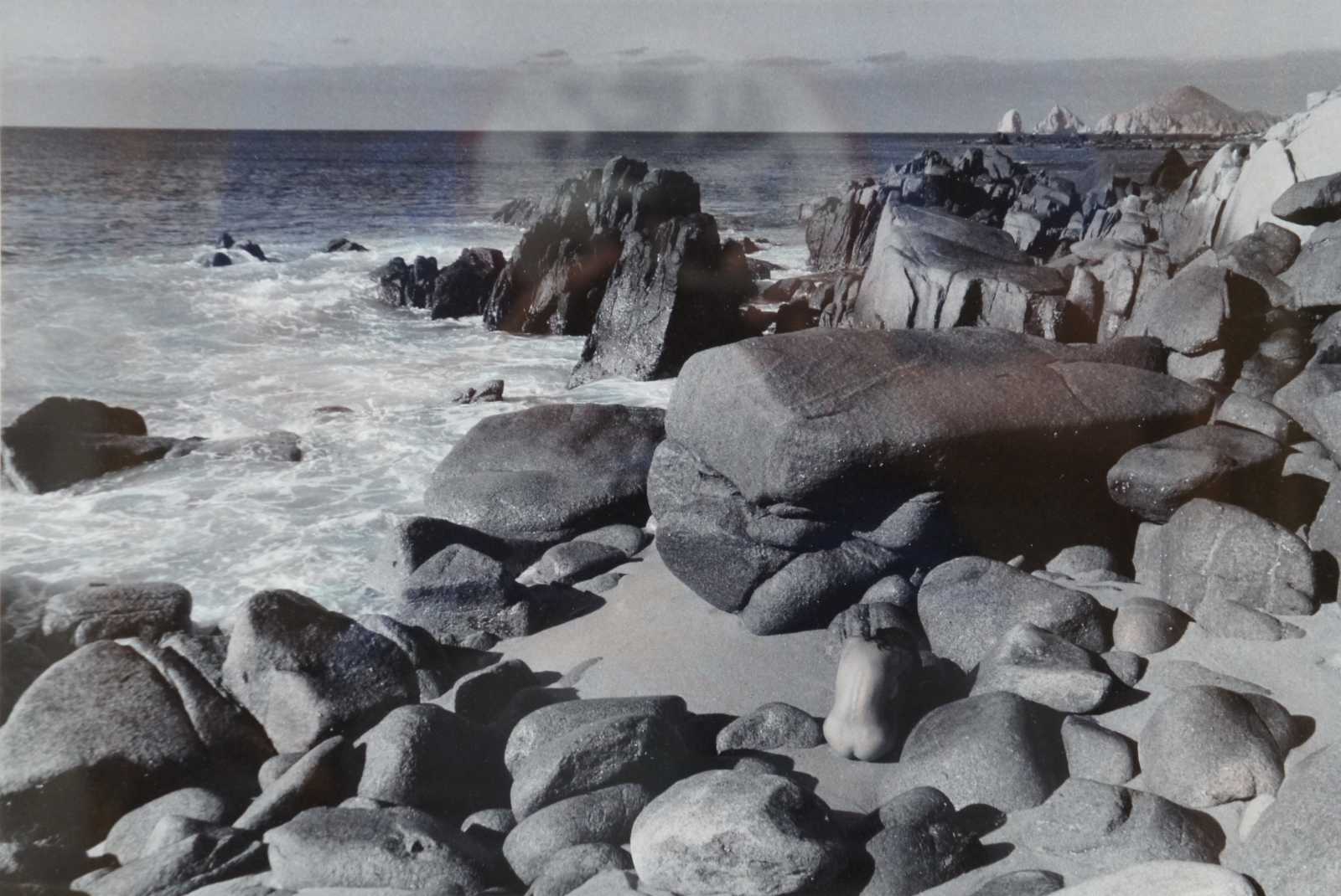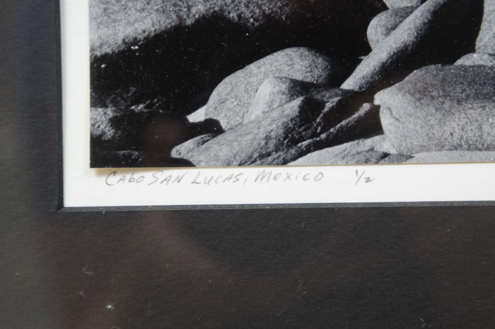 Pencil signed 1991 black and white photograph of a nude figure on a rocky beach in Cabo San Lucas, Mexico by Karen D. Abbott, number 1/2.