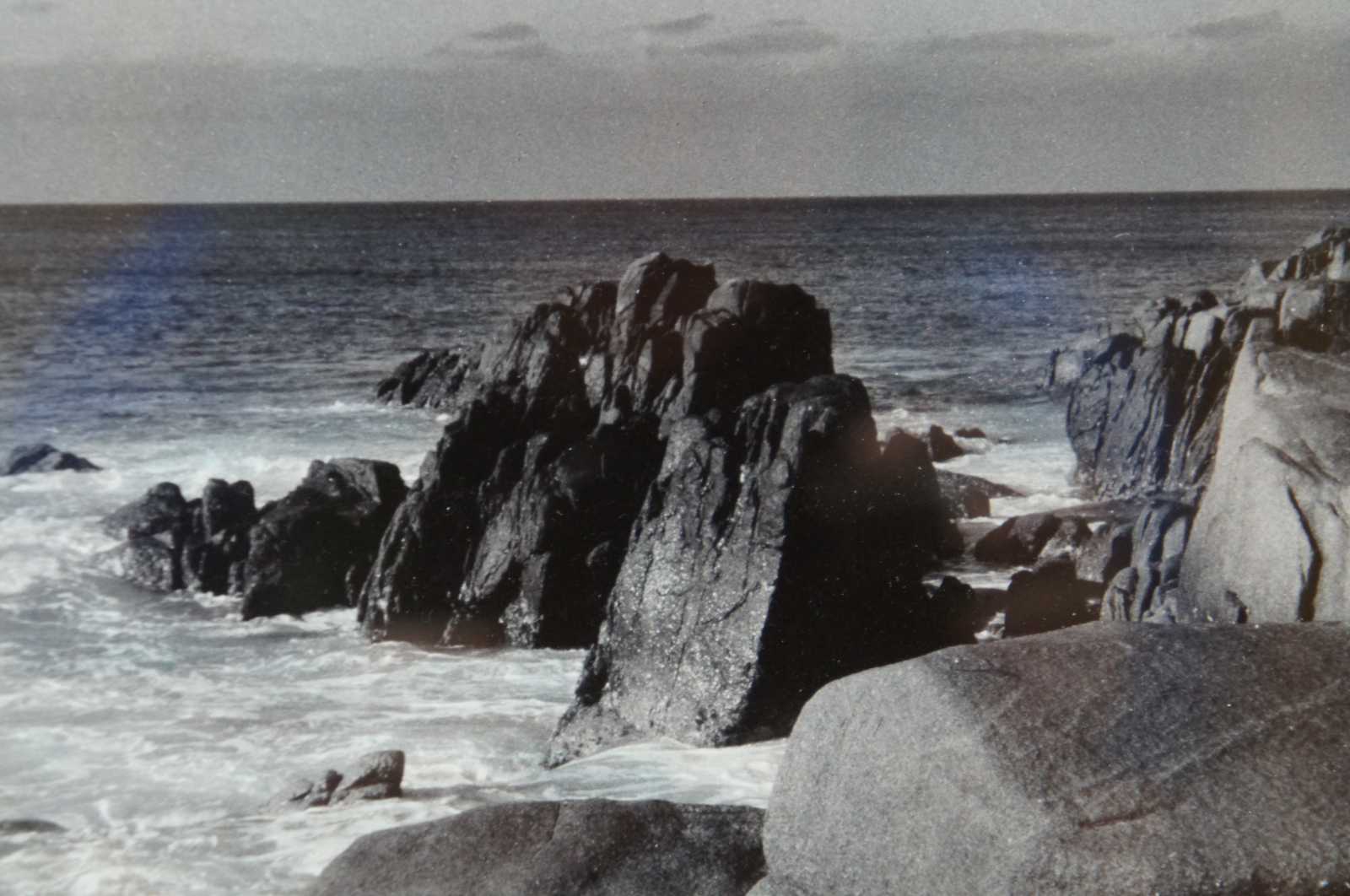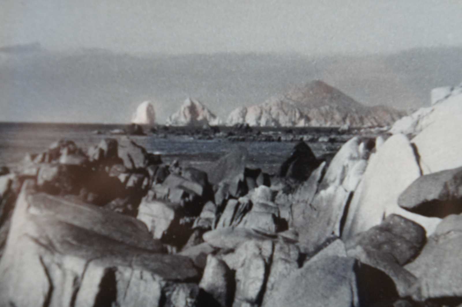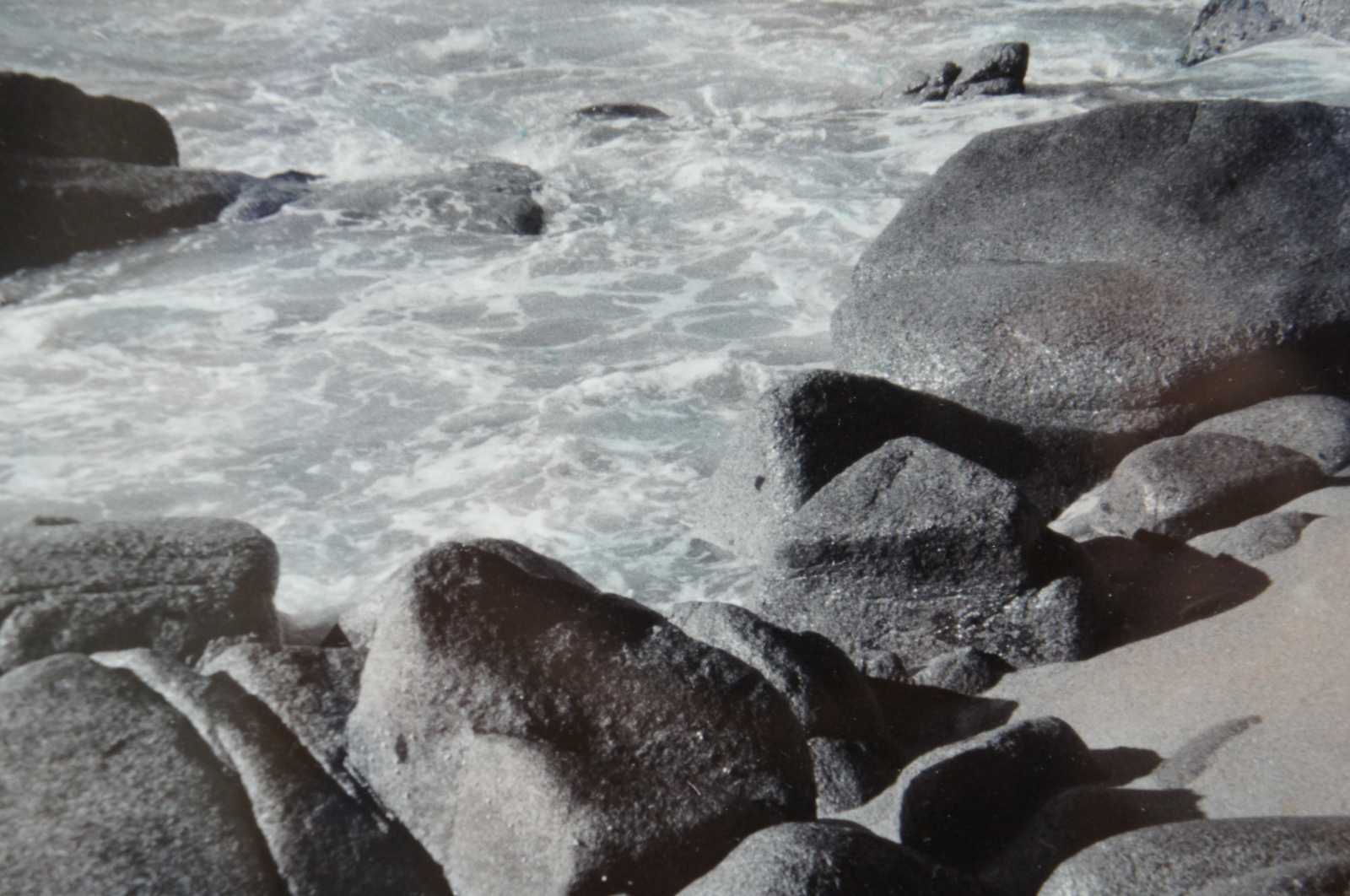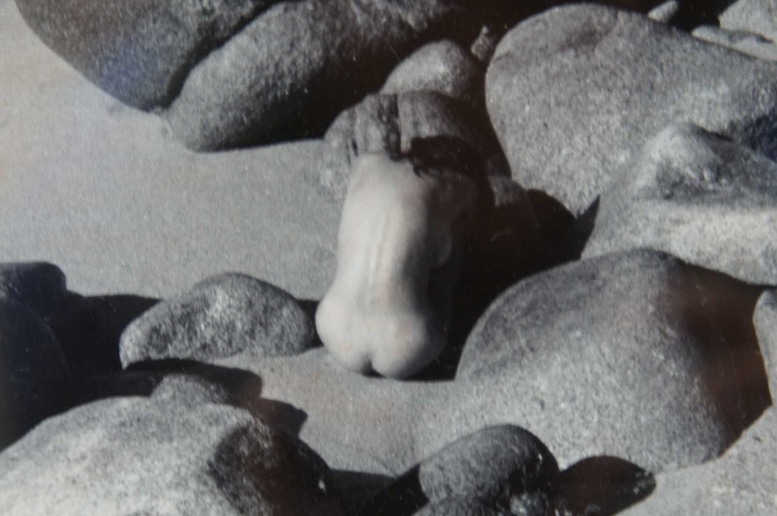 Pencil signed 1991 black and white photograph of a nude figure on a rocky beach in Cabo San Lucas, Mexico by Karen D. Abbott, number 1/2.