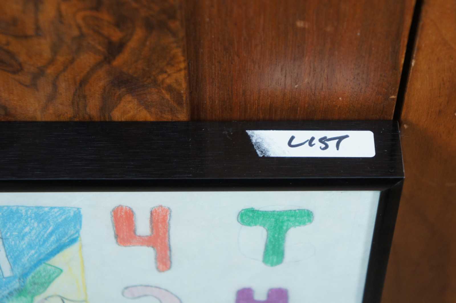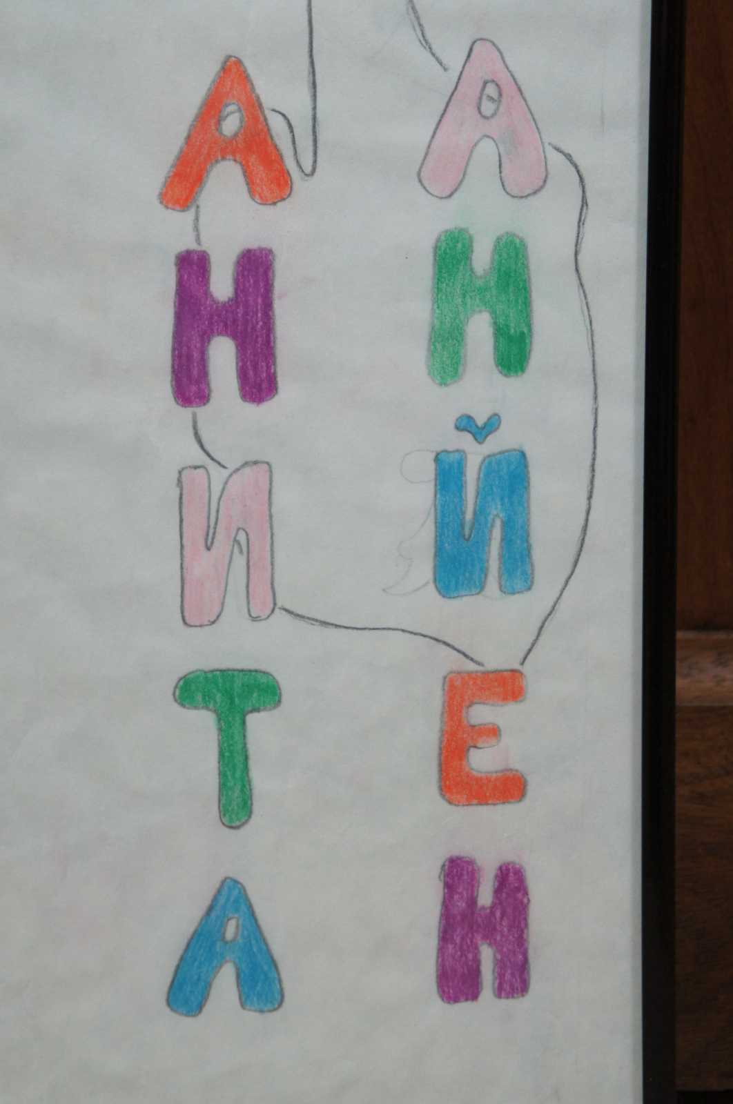 Colored pencil on paper drawing of a portion of the Ohio River around Cincinnati’s Lunken Airport, assorted overlapping shapes, and letters from the Russian alphabet.