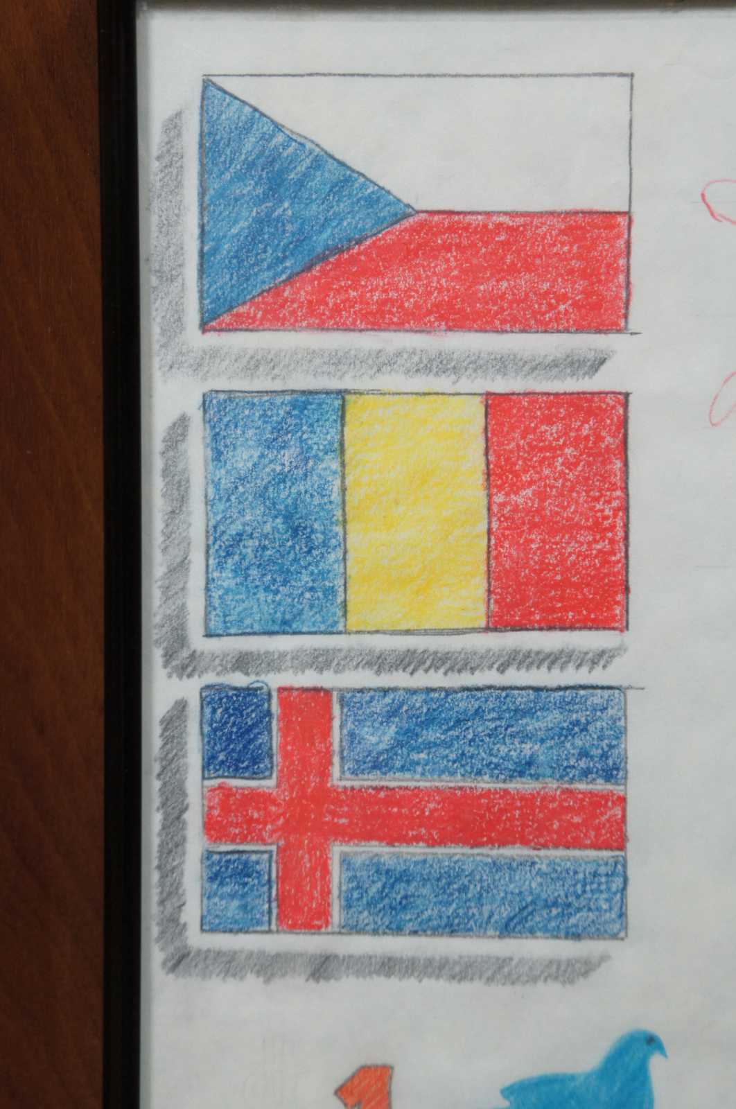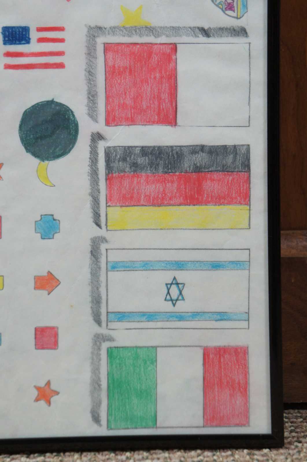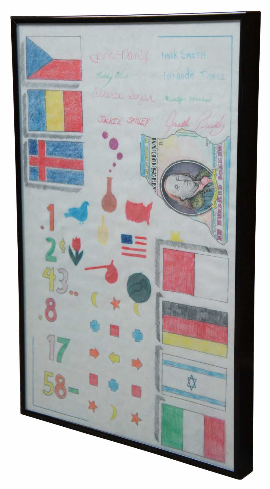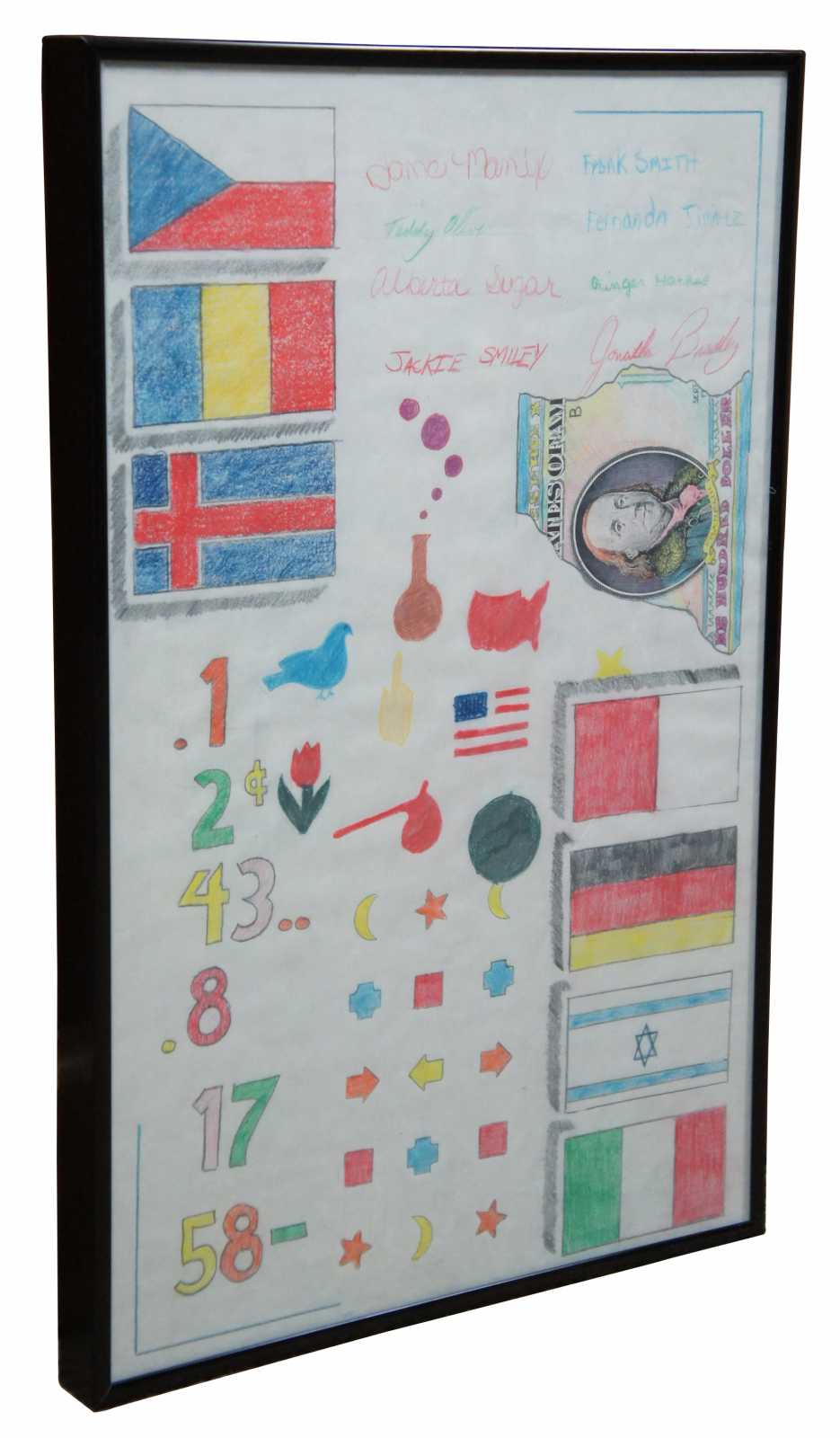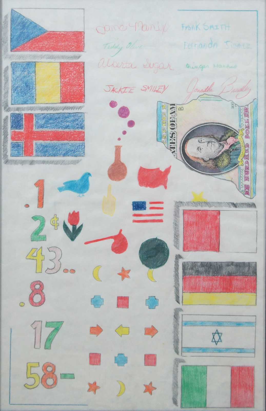 Colored pencil and paper mixed media art featuring world flags, a partial hundred dollar bill, assorted shapes, numbers, and eight signed names.