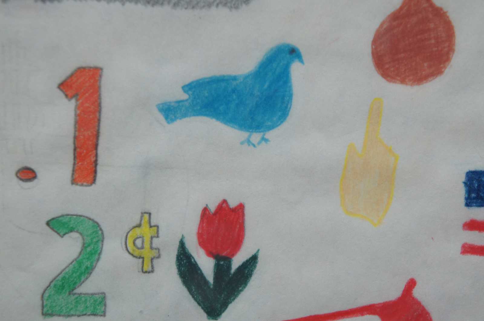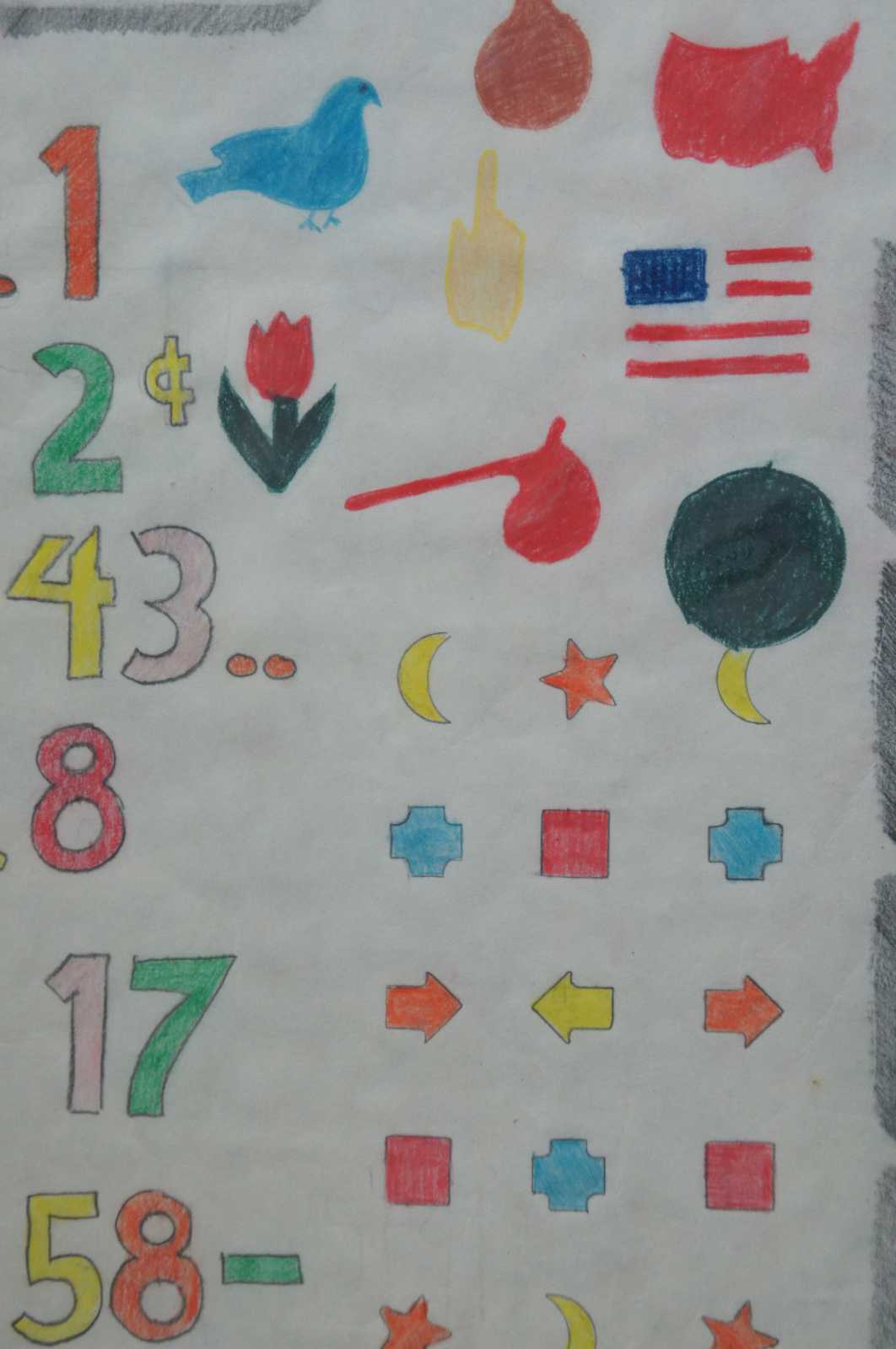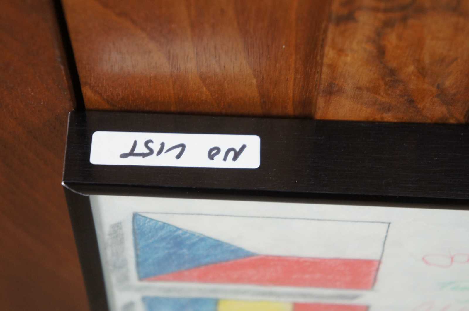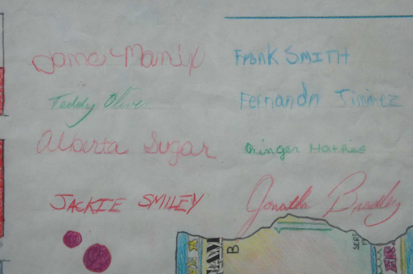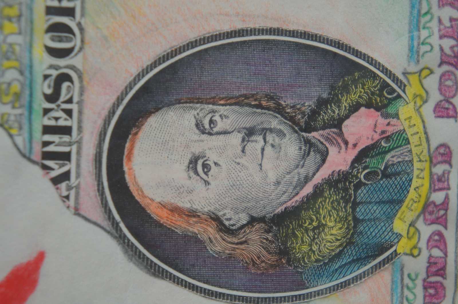 Colored pencil and paper mixed media art featuring world flags, a partial hundred dollar bill, assorted shapes, numbers, and eight signed names.