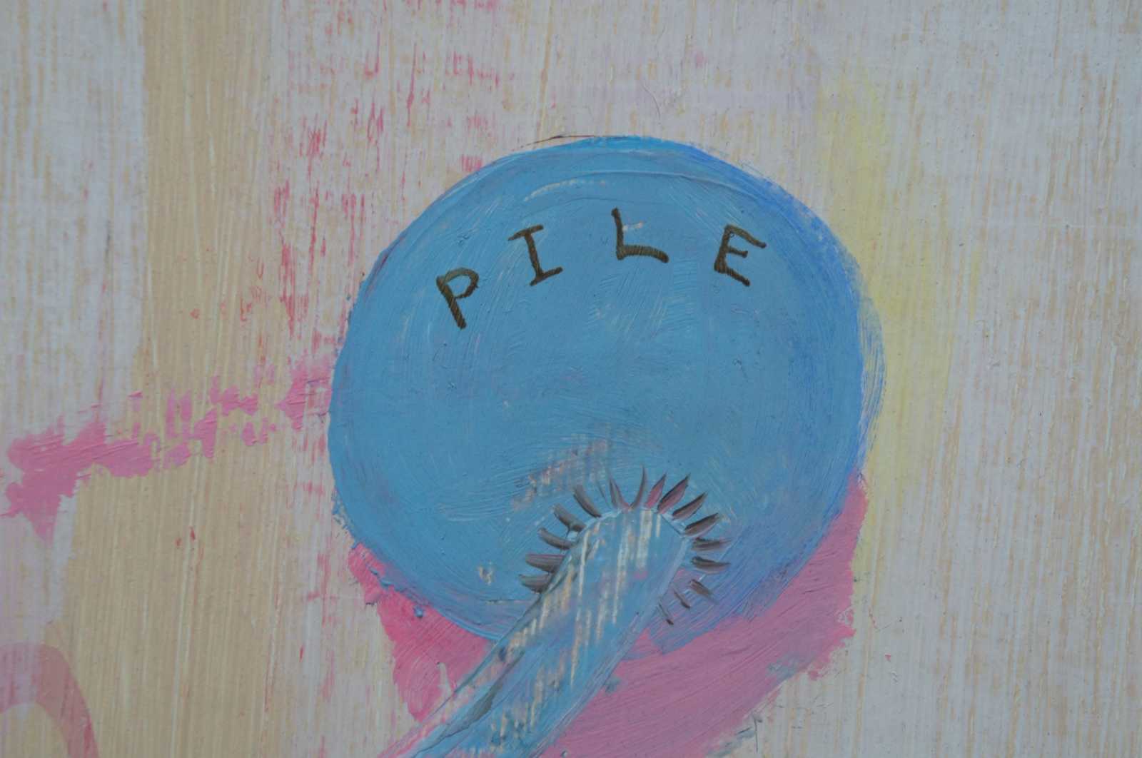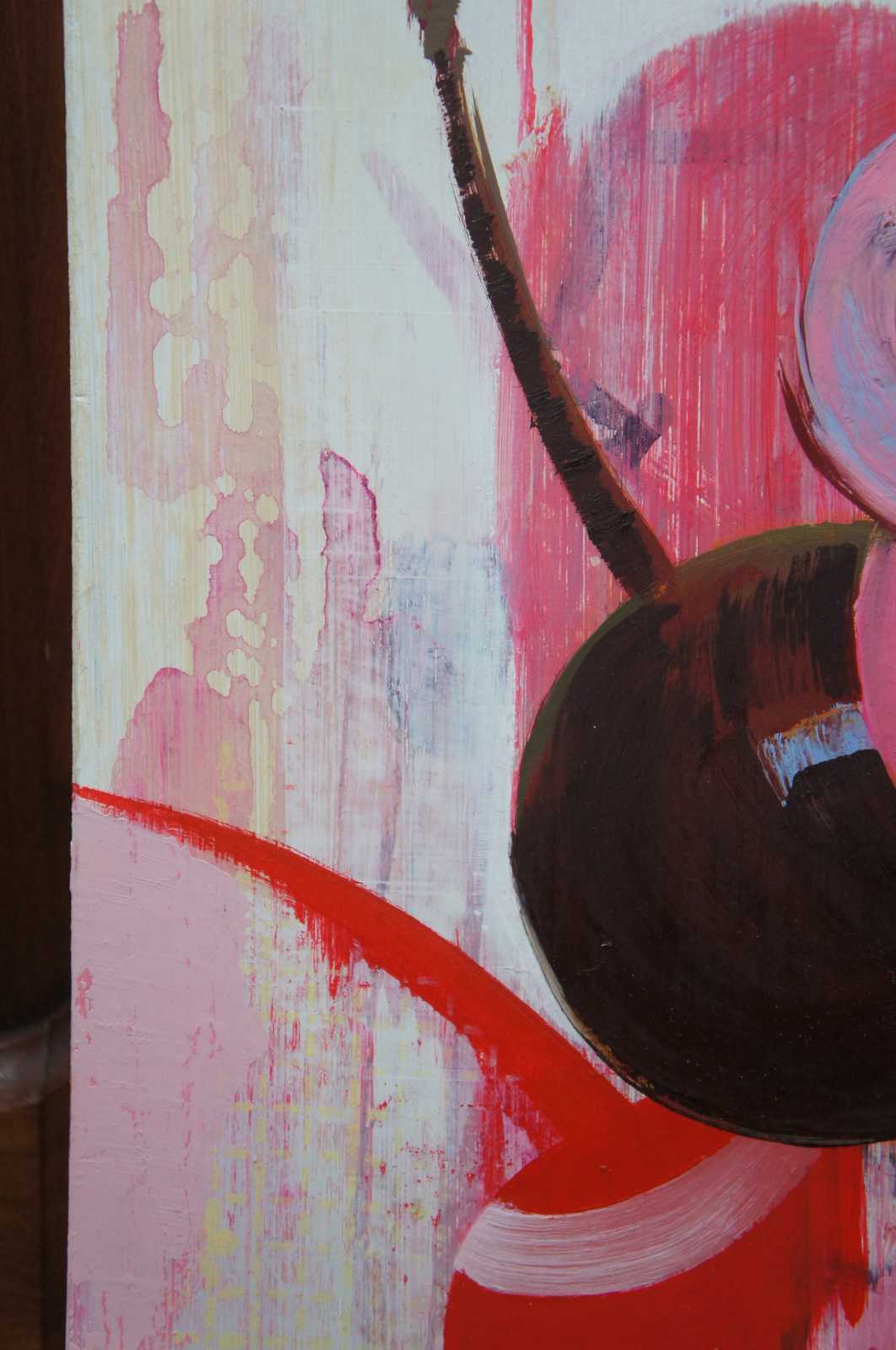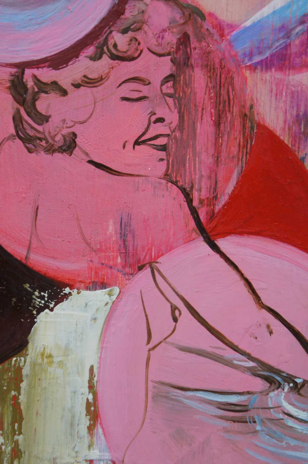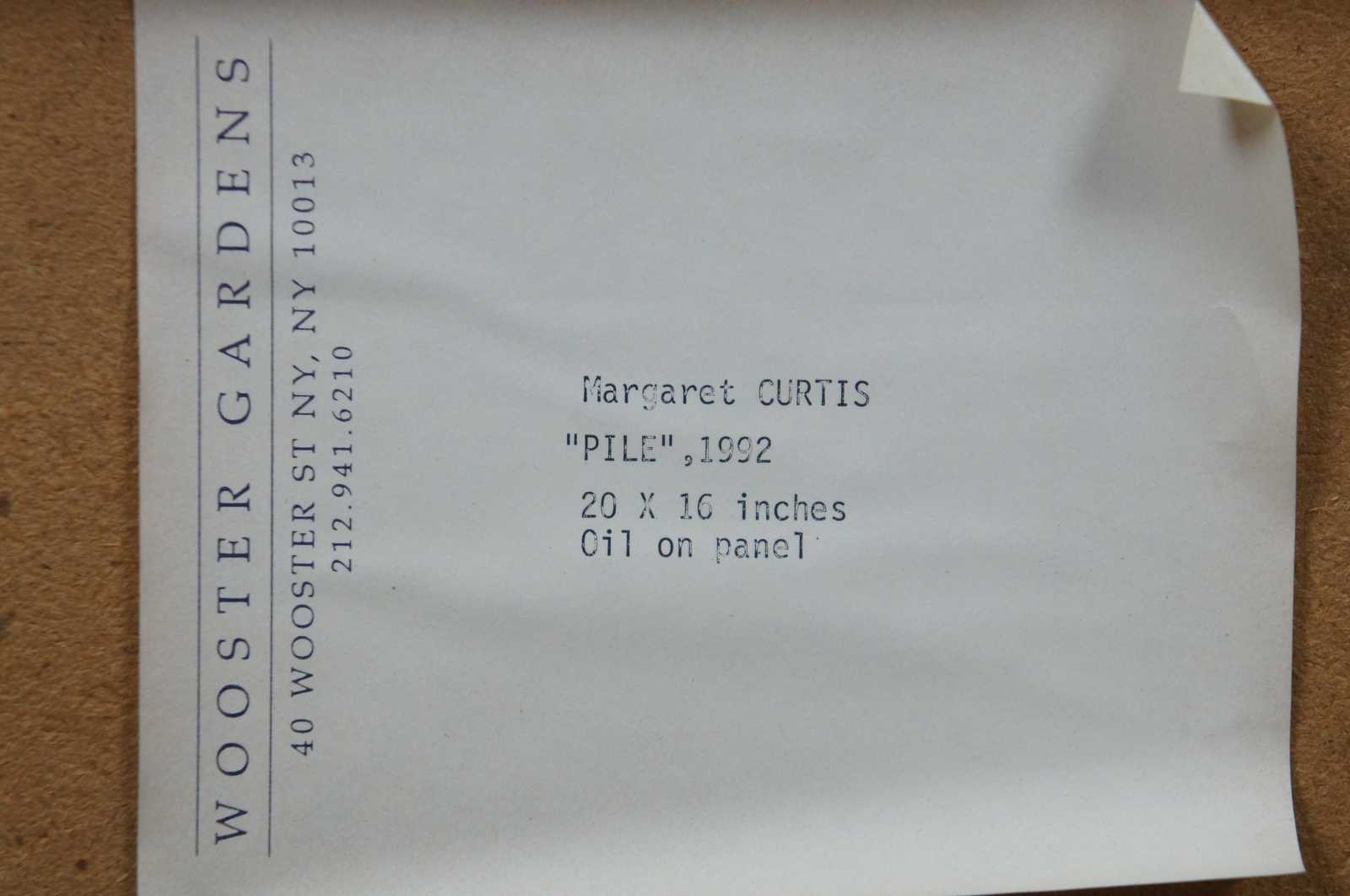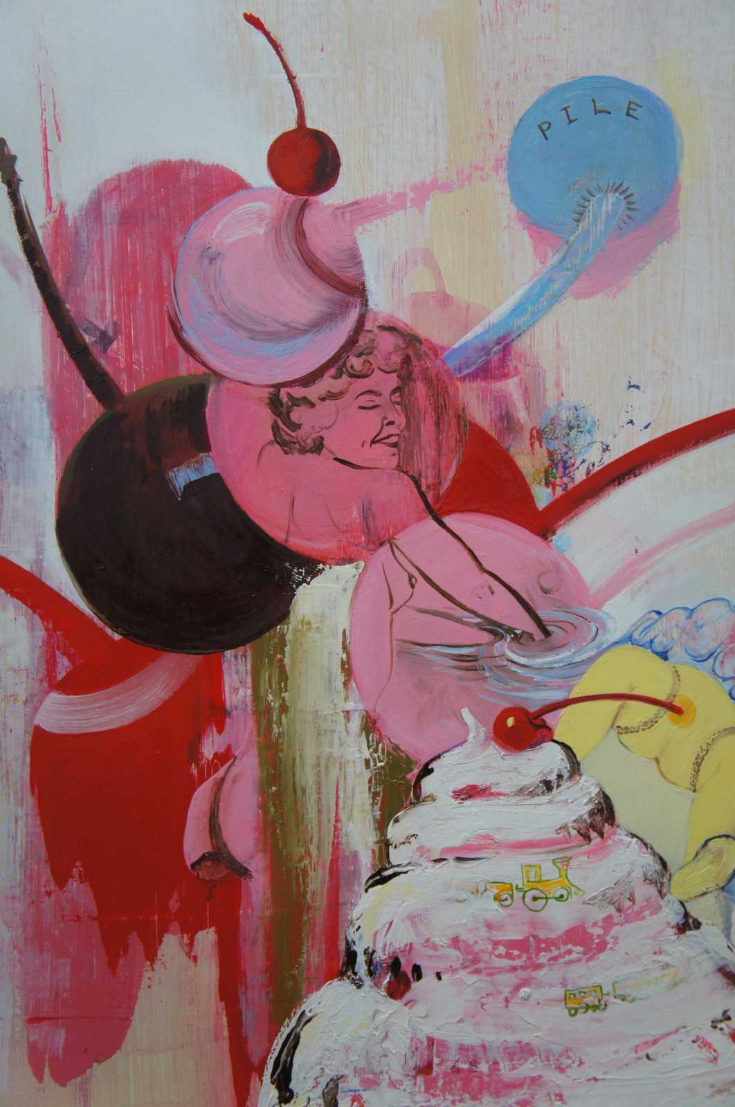 “Pile” 1992 is an early oil on panel work by Margaret Curtis, featuring a female figure enmeshed in a whimsicle ice cream sundae. / Born in Hamilton, Bermuda, Margaret Curtis is a painter and visual artist. She has been creating feminist-based work since the late 1980s. Curtis has been included in shows at The Brooklyn Museum, The Andy Warhol Museum, The Huntington Beach Art Center, The Mint Museum and The Wexner Center. Career highlights include being featured in Marcia Tucker’s 1994 Bad Girls exhibition at the New Museum of Contemporary Art in NYC; her work was curated by Lilli Wei and by Laurie Simmons; she enjoyed numerous solo and group shows at P.P.O.W. gallery in NYC where she was represented for many years. In addition to solo exhibitions throughout New York and the American South, her work was the subject of a retrospective exhibition at the Amelie A. Wallace Gallery at Stony Brook University in New York and was recently featured in Appalachia Now, a regional survey at the Asheville Art Museum.