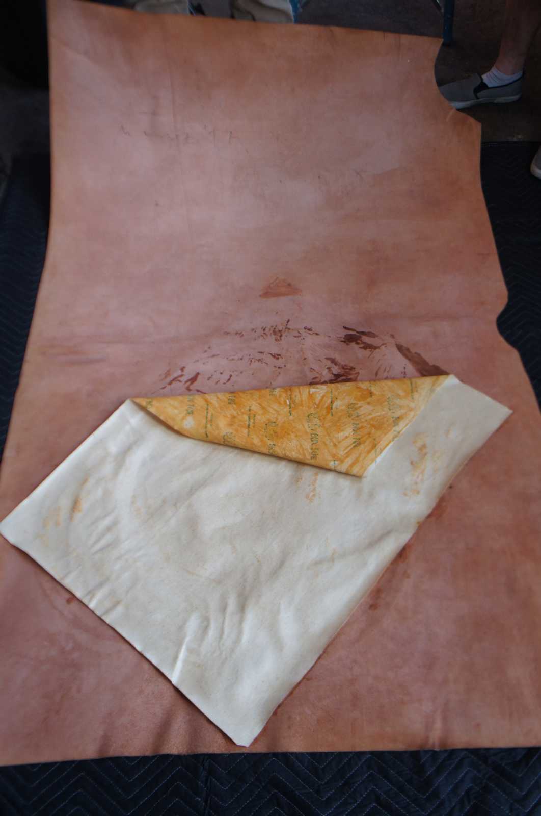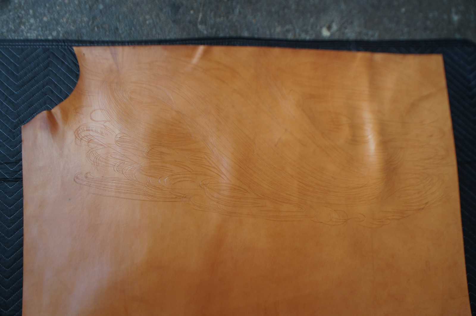 Features a peanut butter or carmel leather with embossed detail and abstract design.