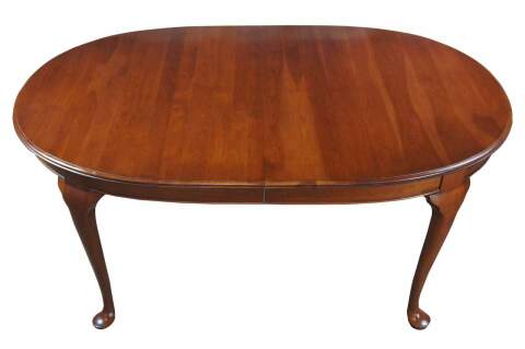 Solid cherry oval dining room table by Penn House, circa 1971. Features a queen anne style with cabriole legs leading to pad feet. Table pads included.