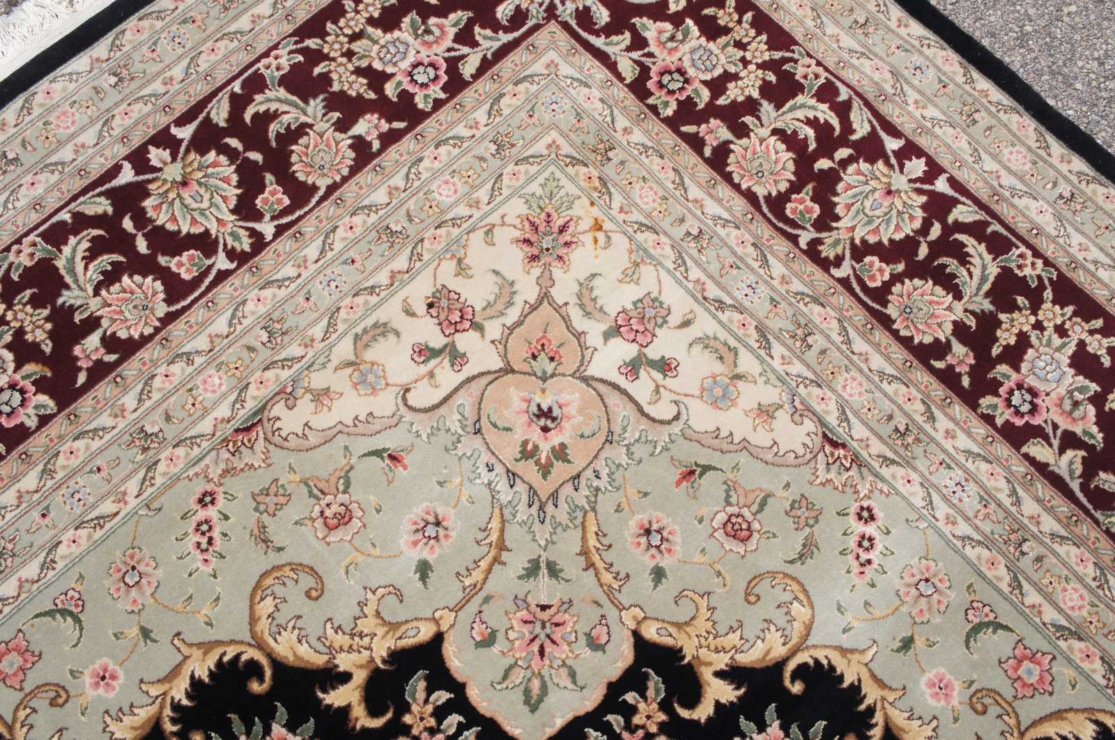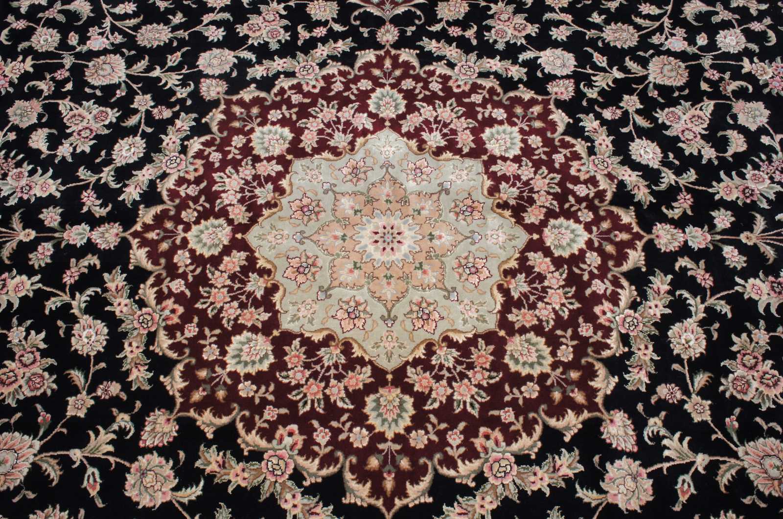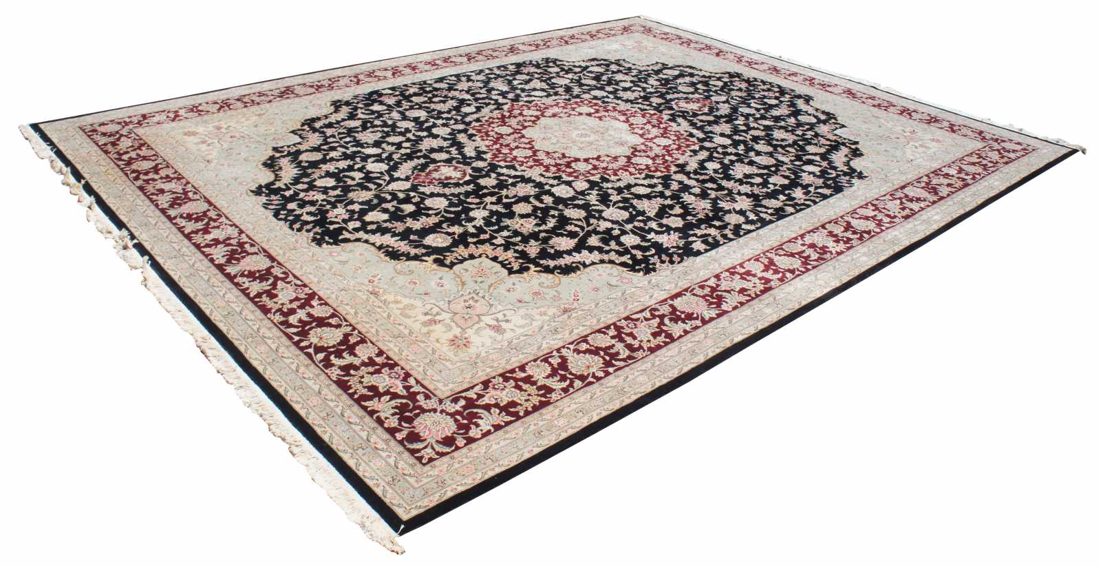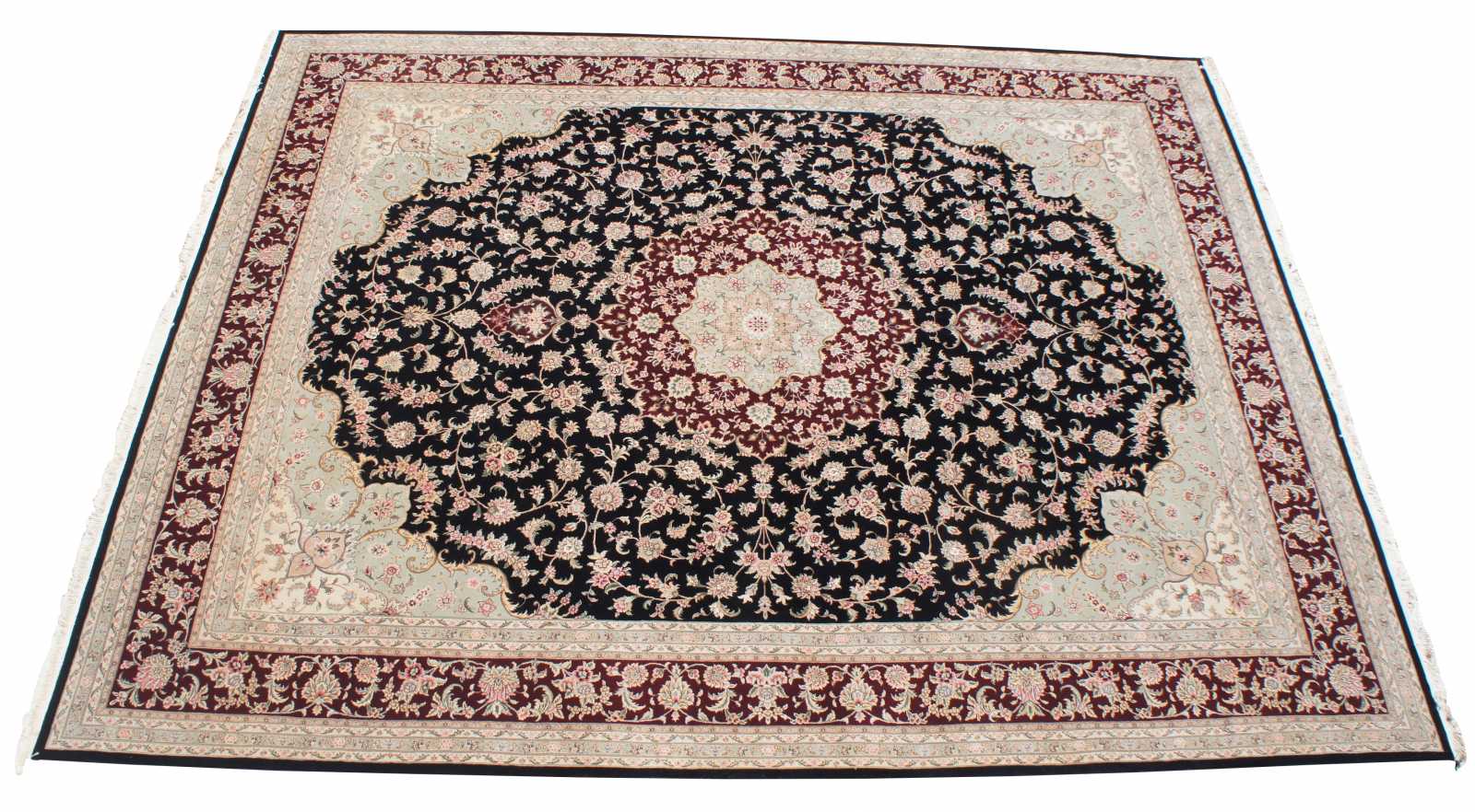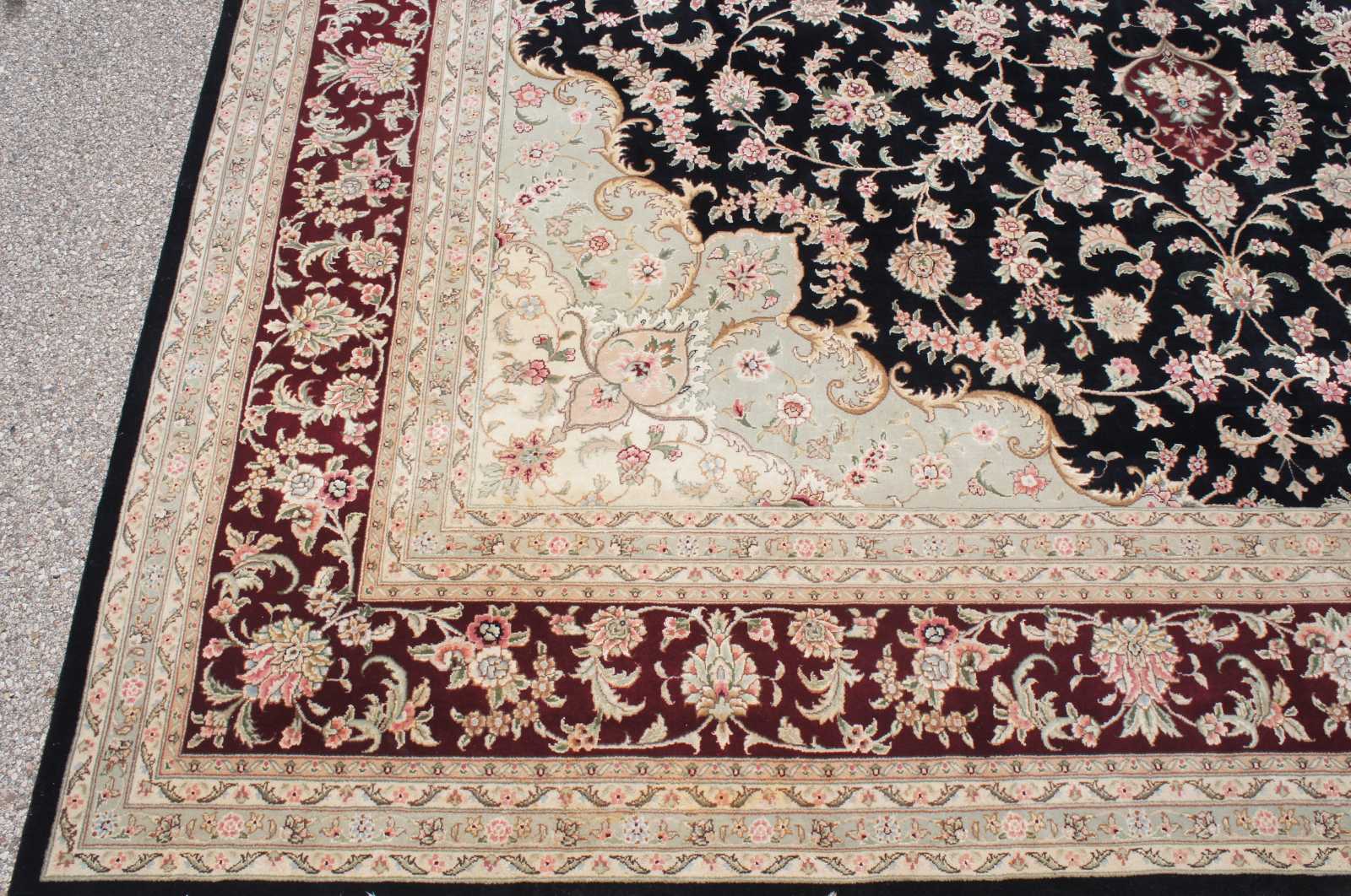 Beautiful large 12' x 15.5' Sino-Persian floral medallion area rug. Features a field of black with tan boarders and florals with reds, burgundy / maroon, green / olive, pinks and tans.