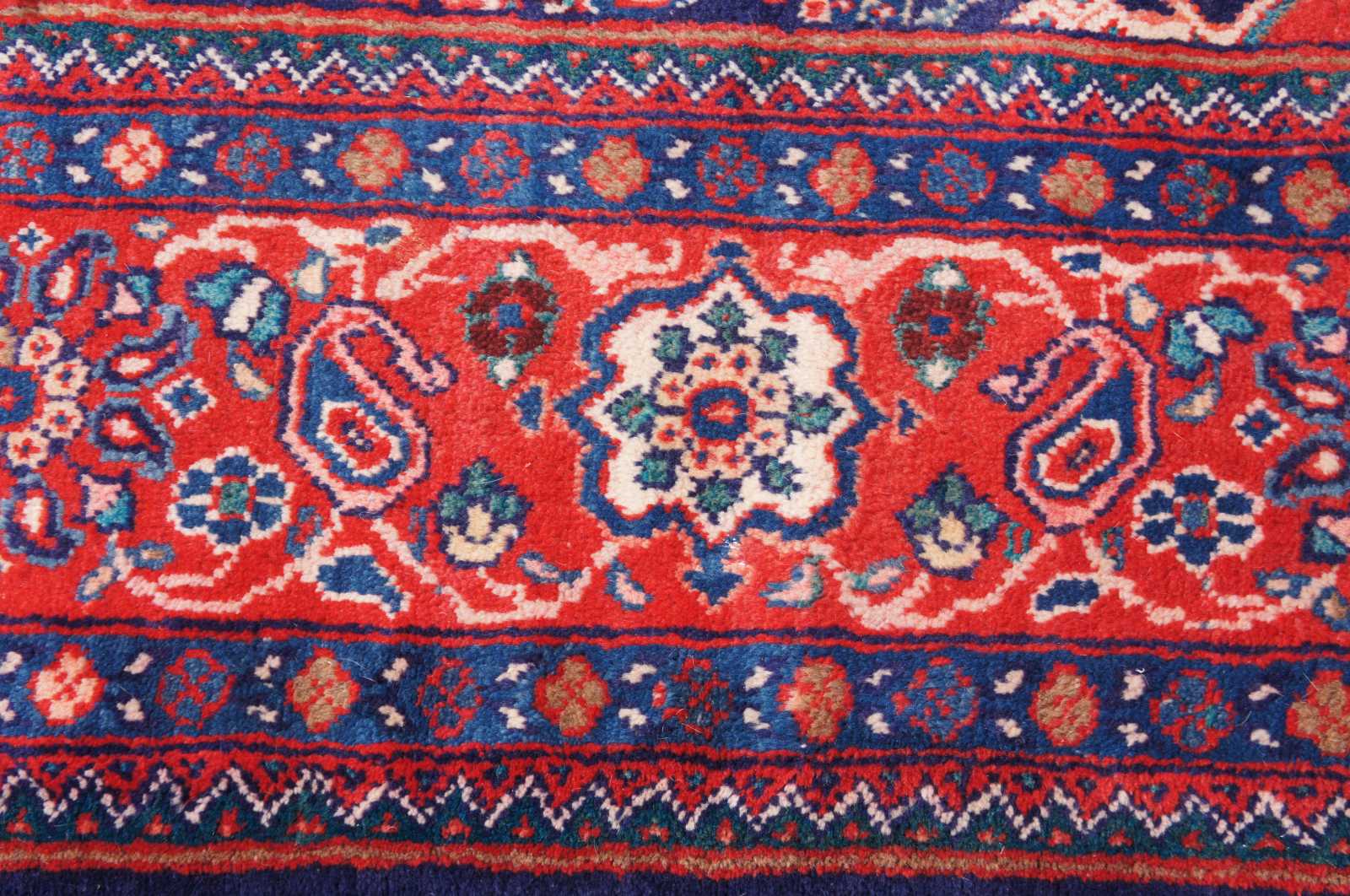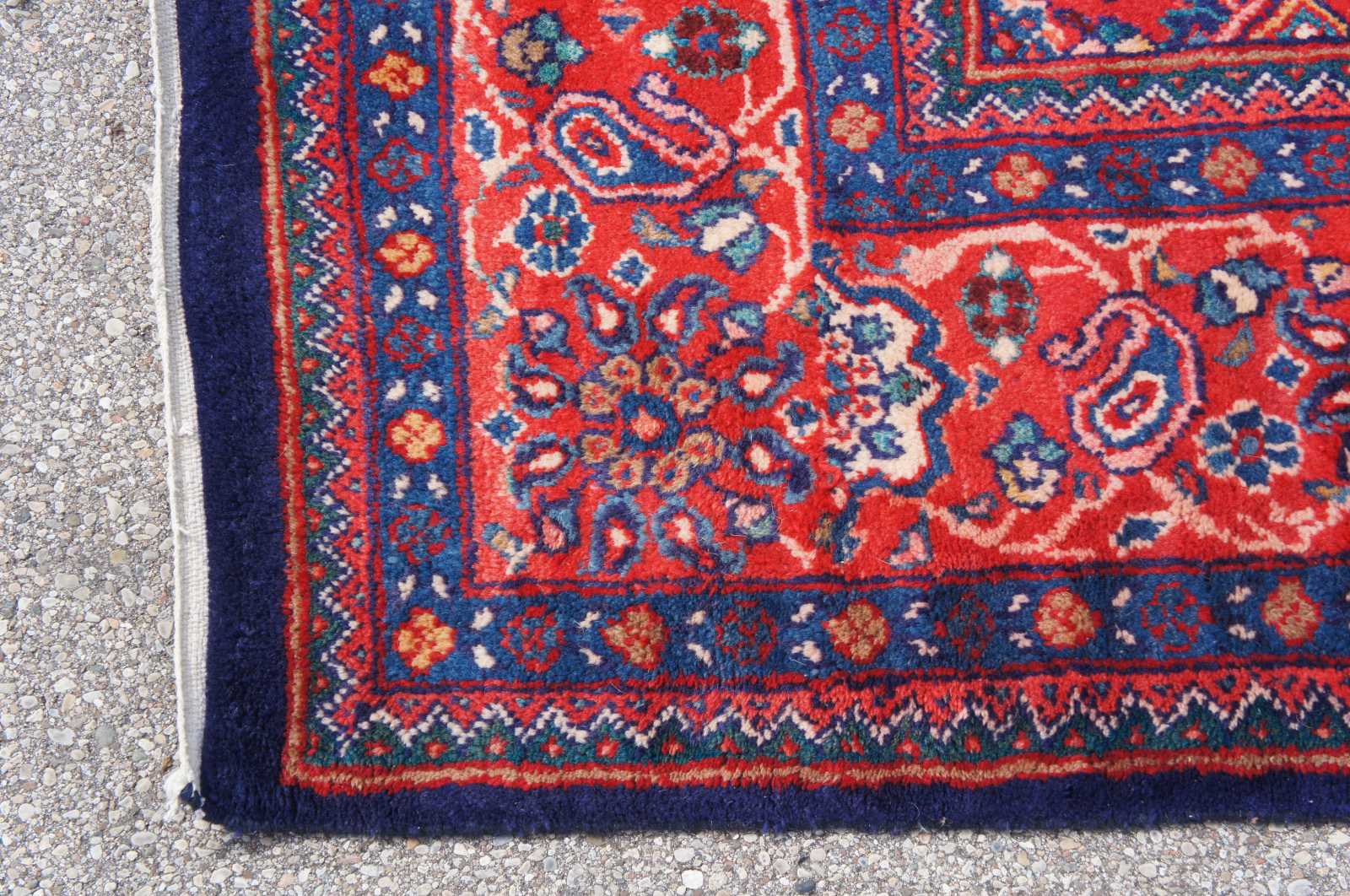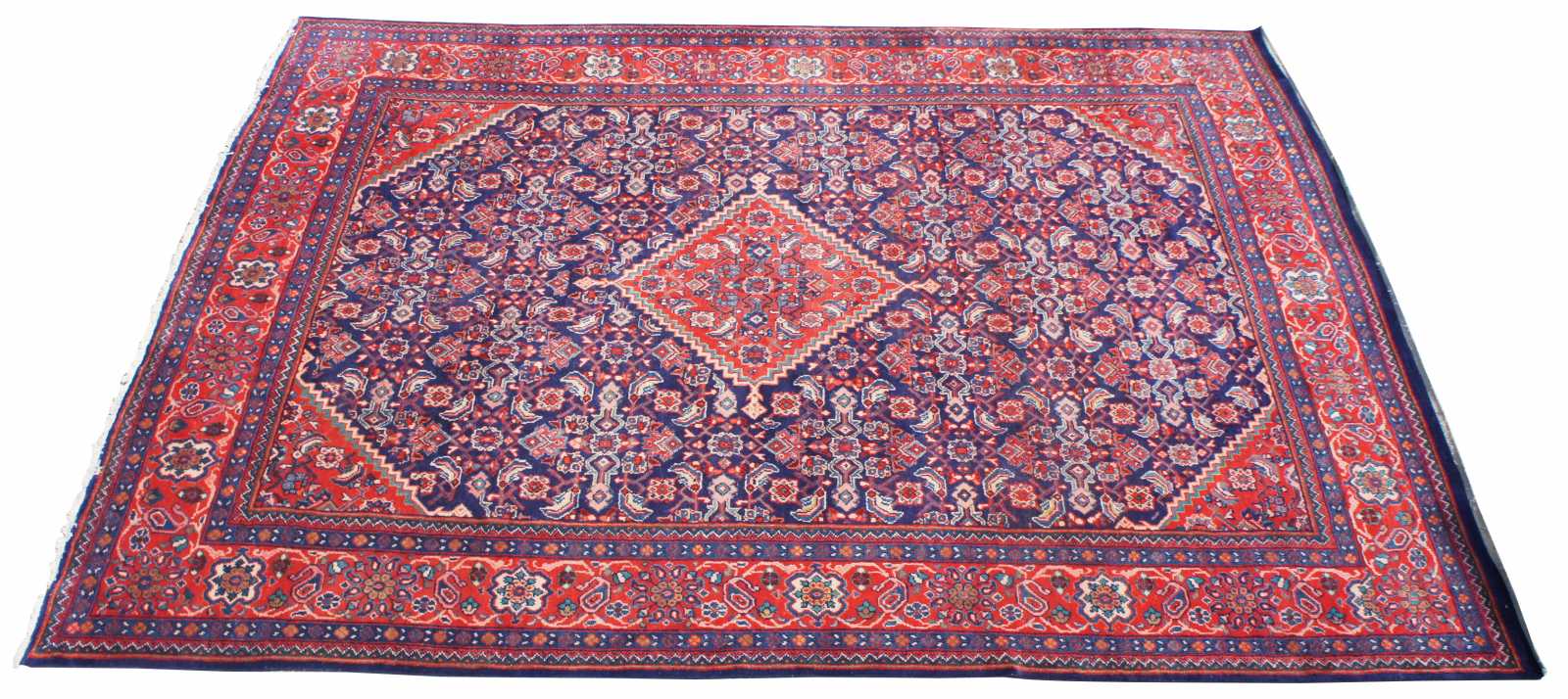 This hand-knotted wool vintage Persian / Iranian Mahal rug featuring a stepped lozenge amulet medallion surrounded by an all-over pattern composed of lattice, florals, and palmettes. Complementary colored spandrels with comb edges grace each corner. The rug is enclosed by a main floral border creating a well-balanced and timeless design. Features a field of blue with red flowing throughout and pinks, purples, teal and green.