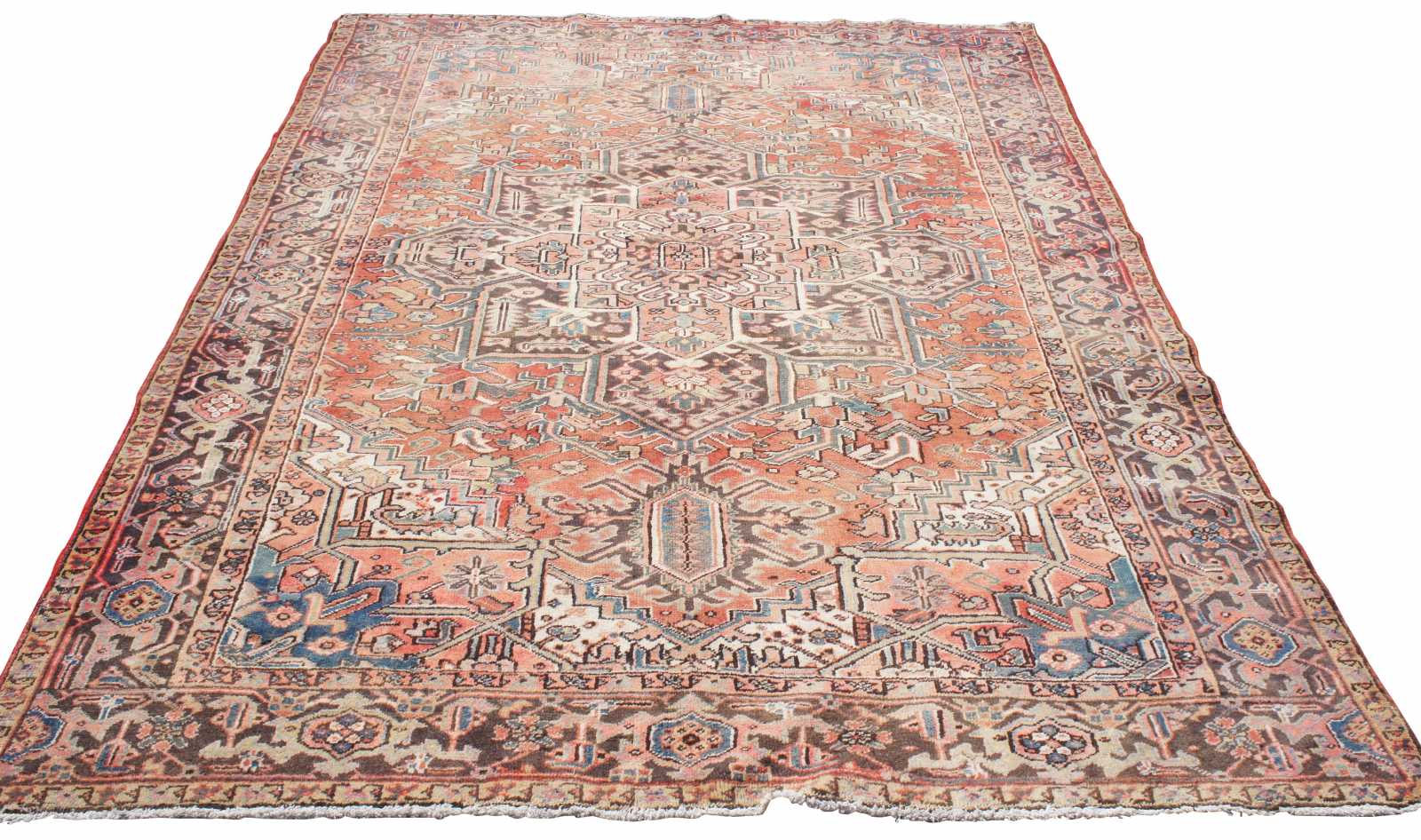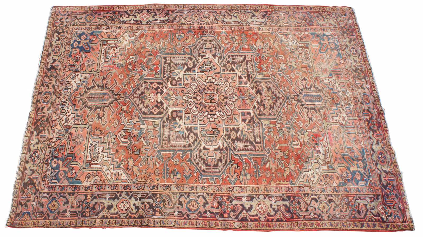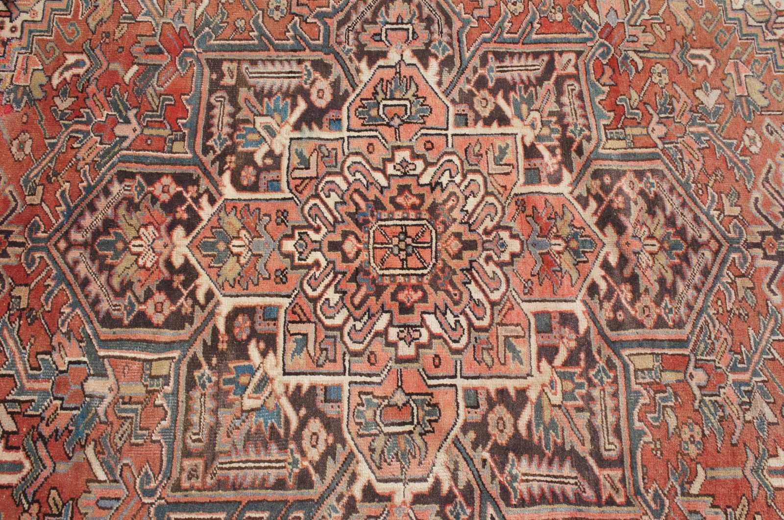 Antique hand knotted Oriental Heriz area rug made in Persia. Features a field of reds / pinks / peach with a floral throughout motif, geometric diamond shapes, and large central layered medallions. Multiple boarders encompass various intricate designs with colors of green, brown and blue accents. Heriz rugs are Persian rugs from the area of Heris, East Azerbaijan in northwest Iran, northeast of Tabriz, produced in the slopes of Mount Sabalan.